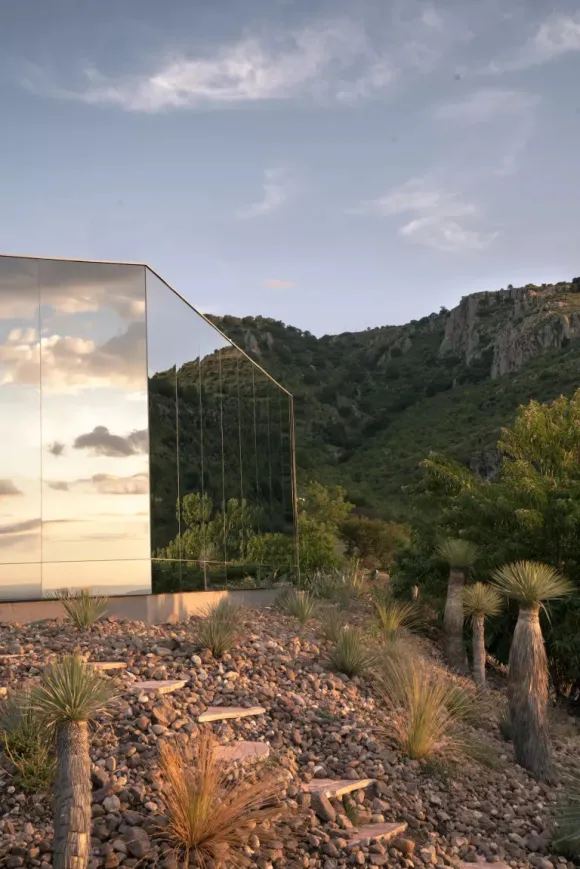 The facades of a mirror house are often criticised for being a death trap for birds. At Casa Eterea in Mexico, on the slopes of an extinct volcano, this is not the case. The architect and designer who designed it, Prashant Ashoka, worked closely with Oskar Chertudi Maya, a local glass and mirror designer, to develop a solution: reflective sheets of glass coated with an ultraviolet layer with a pattern visible only to birds and not to the human eye were installed as façade cladding. With a surface area of 75m² and eco- friendly this house is powered by solar energy and collects rainwater. Inside, its decoration is contemporary and warm, and invites you to observe the stars in a sky unpolluted by artificial light.