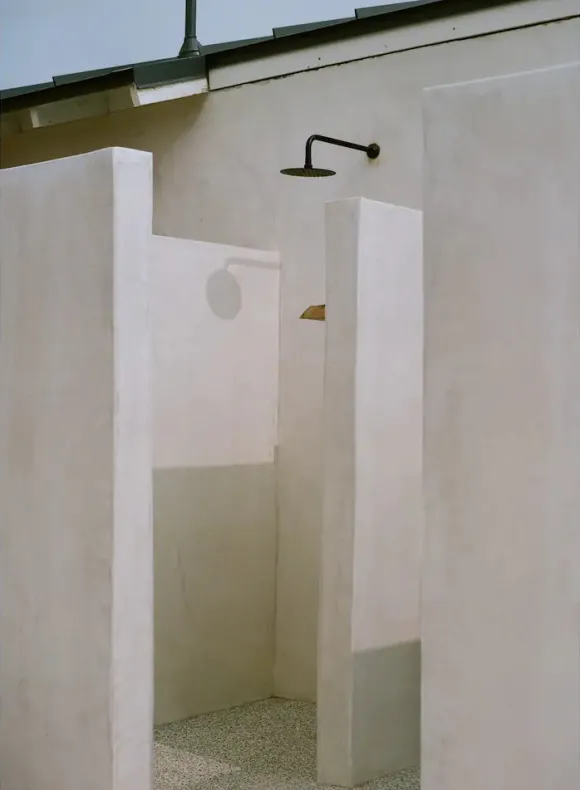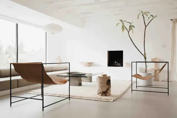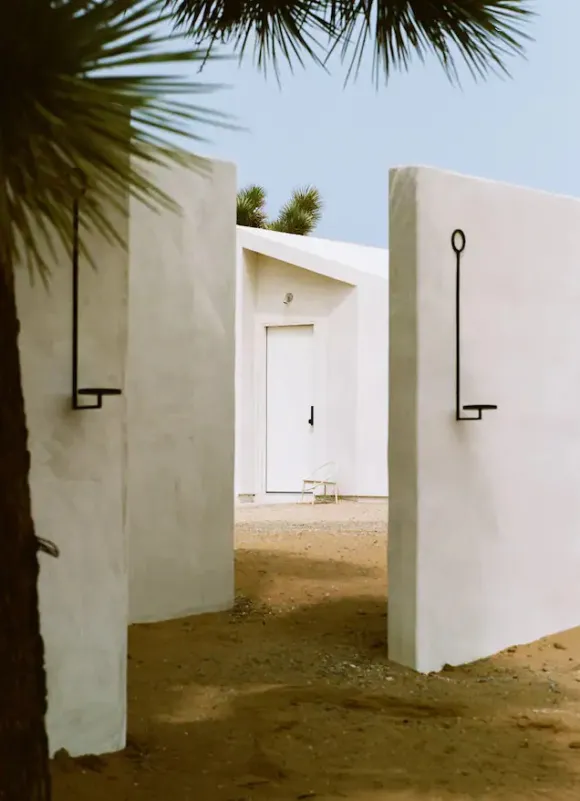 This house with its minimalist facade and designer decor is called La Chacuel and is located in the Californian desert of Yucca Valley, California, north of Joshua Tree. It is the result of a collaboration between Mila Morris, an architect, and Jøna Maaryn, a furniture designer. Set on a huge desert lot with a view of Pipes Canyon Wash, it combines simple architectural lines with natural materials like wood, concrete and leather. The pool is a cool haven in this hot region. The house can be rented on Airbnb for holidays but also for shooting. Photo: Airbnb, Meir Schonbrun, Austin Leis, and Julia Saltzman