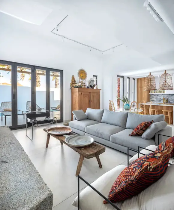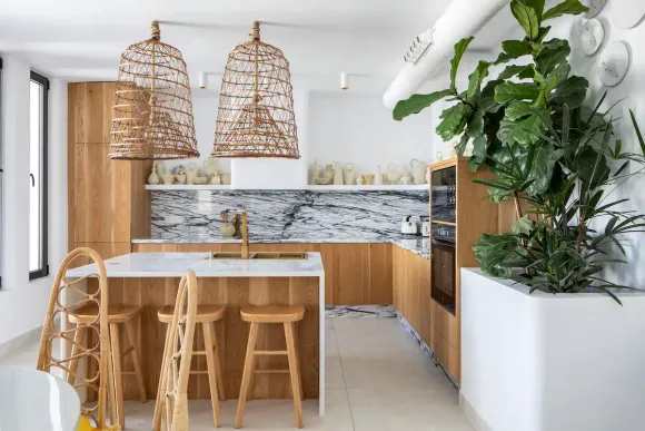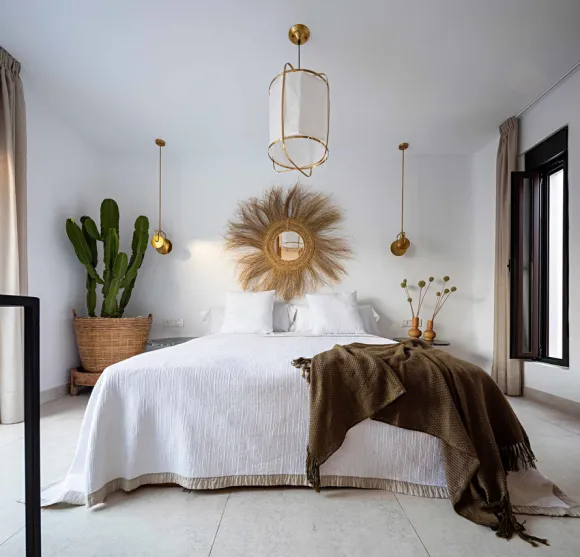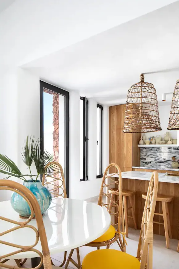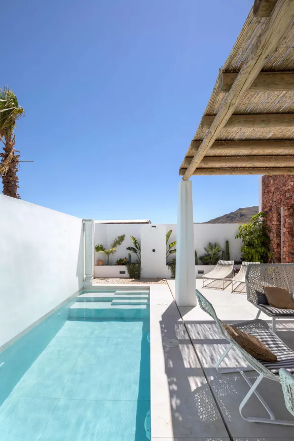 Cette maison avec piscine à louer pour des vacances en Andalousie appartient à Federico Landín et se situe près des plages de Cabo de Gata. Comme il lui était impossible de trouver la maison de ses rêves dans cette région du pays, il s'est résolu à la faire construire après avoir trouvé un terrain bien placé. Le terrain étant irrégulier, il en a joué et la maison sur plusieurs niveaux profite d'une vue magnifique sur le paysage depuis sa terrasse supérieure. La décoration simple fait appel aux matériaux locaux, et est parfaite pour une maison de vacances, où l'on passe la plupart de son temps à l'extérieur, près de la piscine sous l'ombre bienfaisante des canisses.