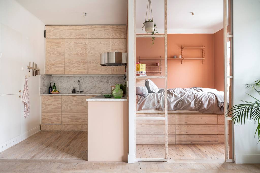 Une petite cuisine en bois bien conçue dans un studio de 31m2