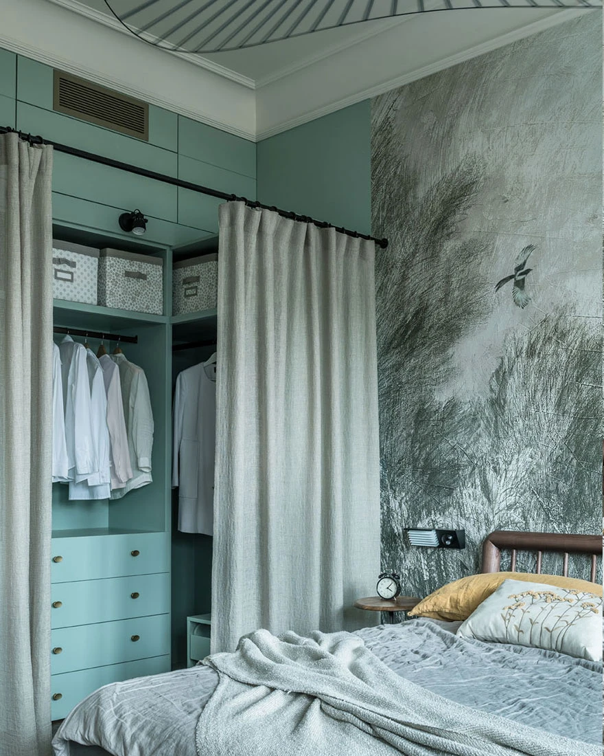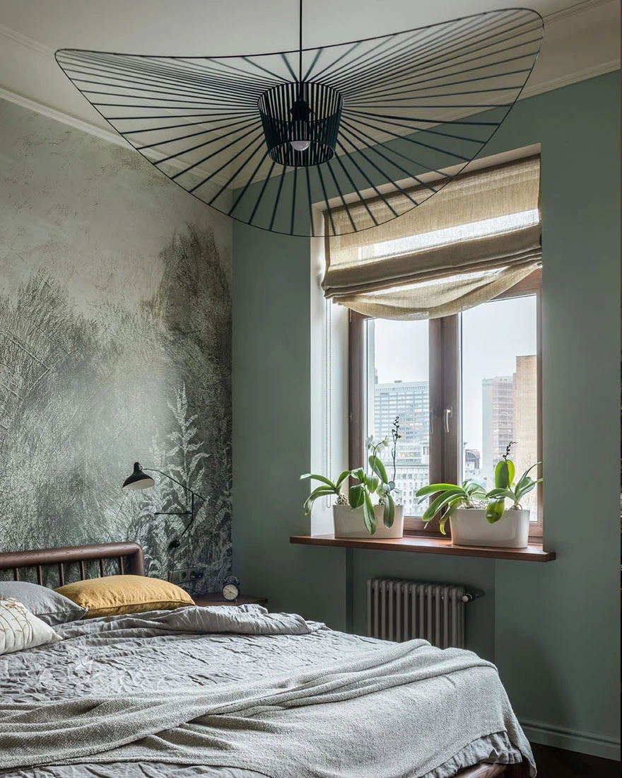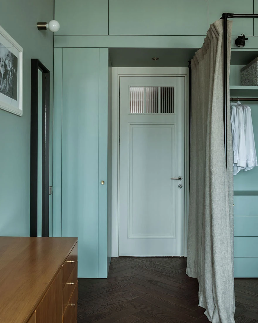 This inspired the colours of the walls, which were carefully chosen after a thousand paint tests. Identical recreations of the mouldings, vintage furniture from the 1950s and 1960s, and precious finds — including a model of the Empire State Building — complete the decor. The modern, green Italian kitchen contrasts cheerfully with the rest of the apartment. And in the bedroom, panoramic wallpaper, custom-designed by the designer, adds the finishing touch. Poetry reigns in this unique and inspiring 60m2 vintage and colourful apartment. Photo: Mikhail Stepanov. Stylist: Evgenia Klynesheva