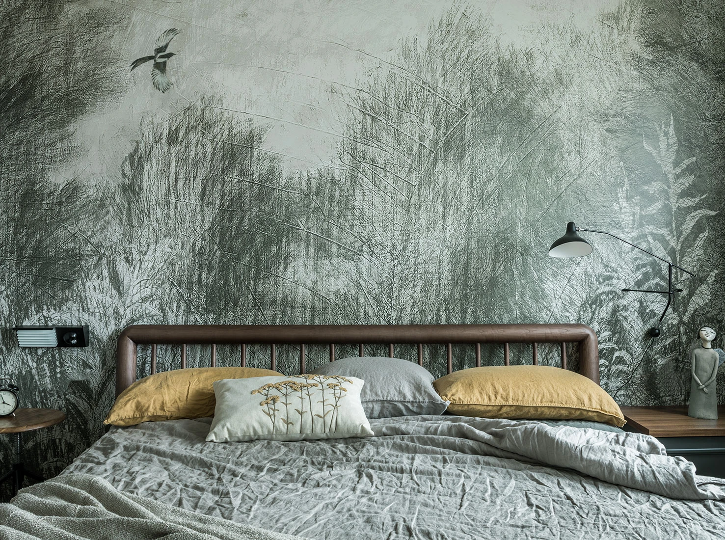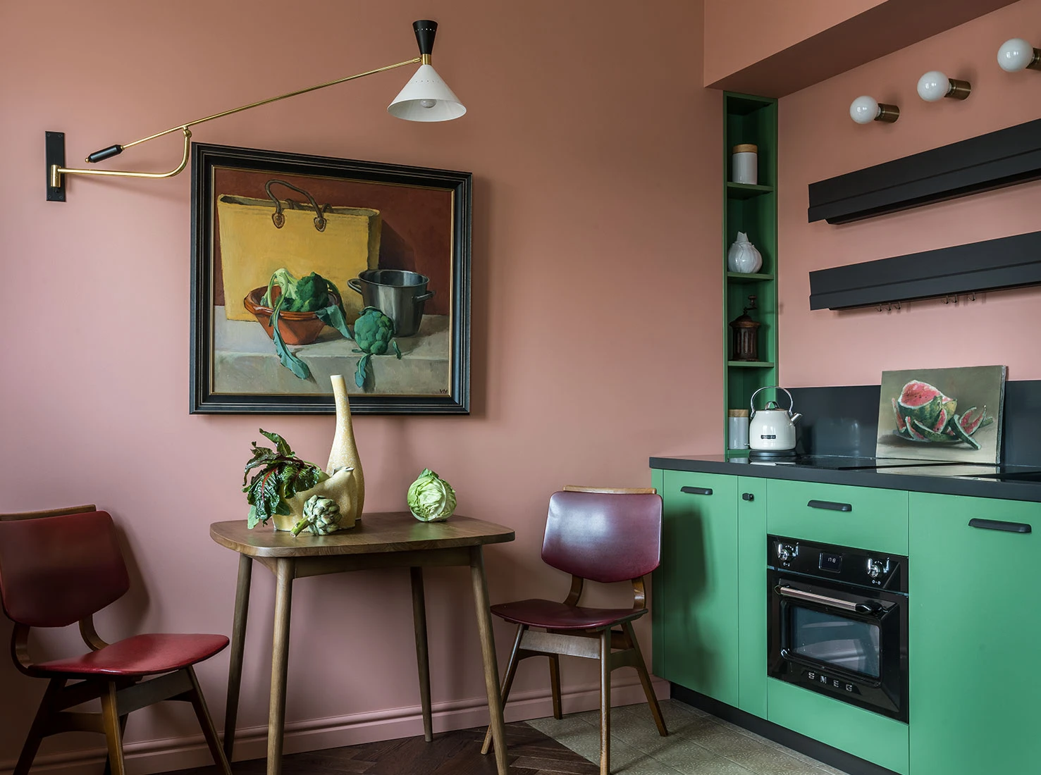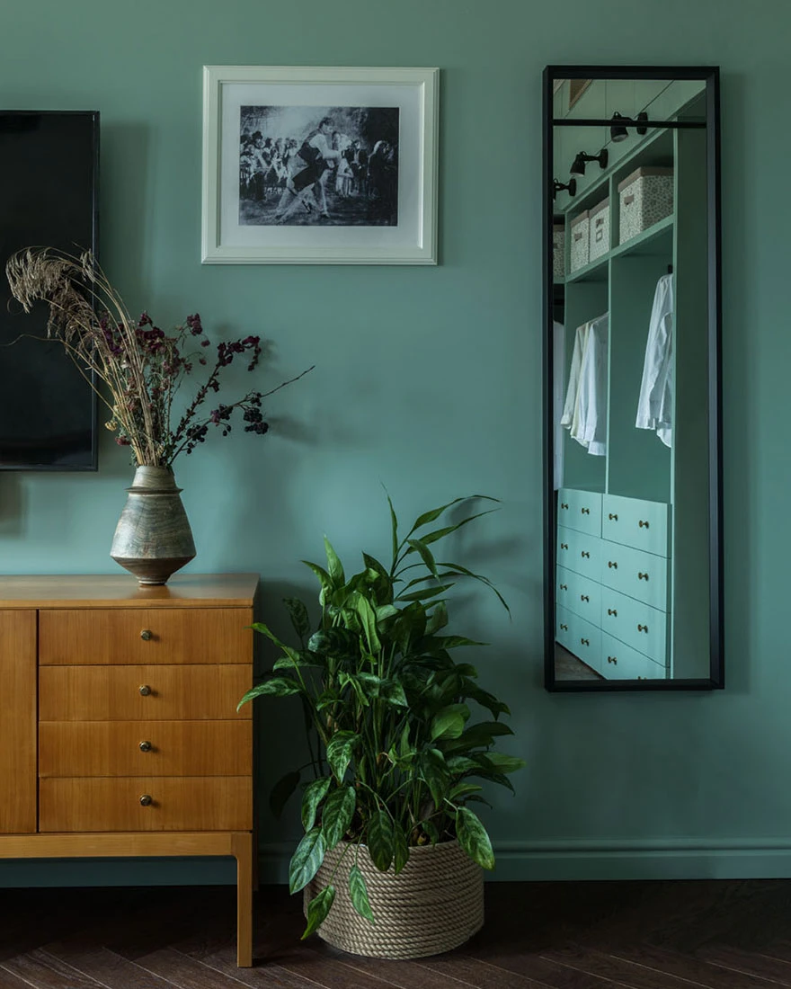 This inspired the colours of the walls, which were carefully chosen after a thousand paint tests. Identical recreations of the mouldings, vintage furniture from the 1950s and 1960s, and precious finds — including a model of the Empire State Building — complete the decor. The modern, green Italian kitchen contrasts cheerfully with the rest of the apartment. And in the bedroom, panoramic wallpaper, custom-designed by the designer, adds the finishing touch. Poetry reigns in this unique and inspiring 60m2 vintage and colourful apartment. Photo: Mikhail Stepanov. Stylist: Evgenia Klynesheva