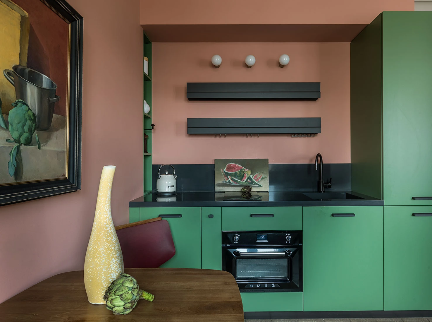 Sous les plafonds hauts d’un immeuble construit en 1935, la designer Maria Amelina a transformé un petit appartement en un lieu plein de charme et d’histoire. Couleurs audacieuses, meubles chinés et pièces d’art inspirantes, il est une vraie leçon de style et d’équilibre. Dans cet appartement de 60m2 vintage et coloré, elle a tout repensé. La lumière entre à flots par cinq fenêtres, et l’espace paraît bien plus vaste qu’il ne l’est. Mais avant d’en arriver là, il a fallu tout refaire : planchers, isolation, ventilation, murs abattus. Son inspiration est venue de deux toiles d’artistes qui ont servi de point de départ à la palette de couleurs.