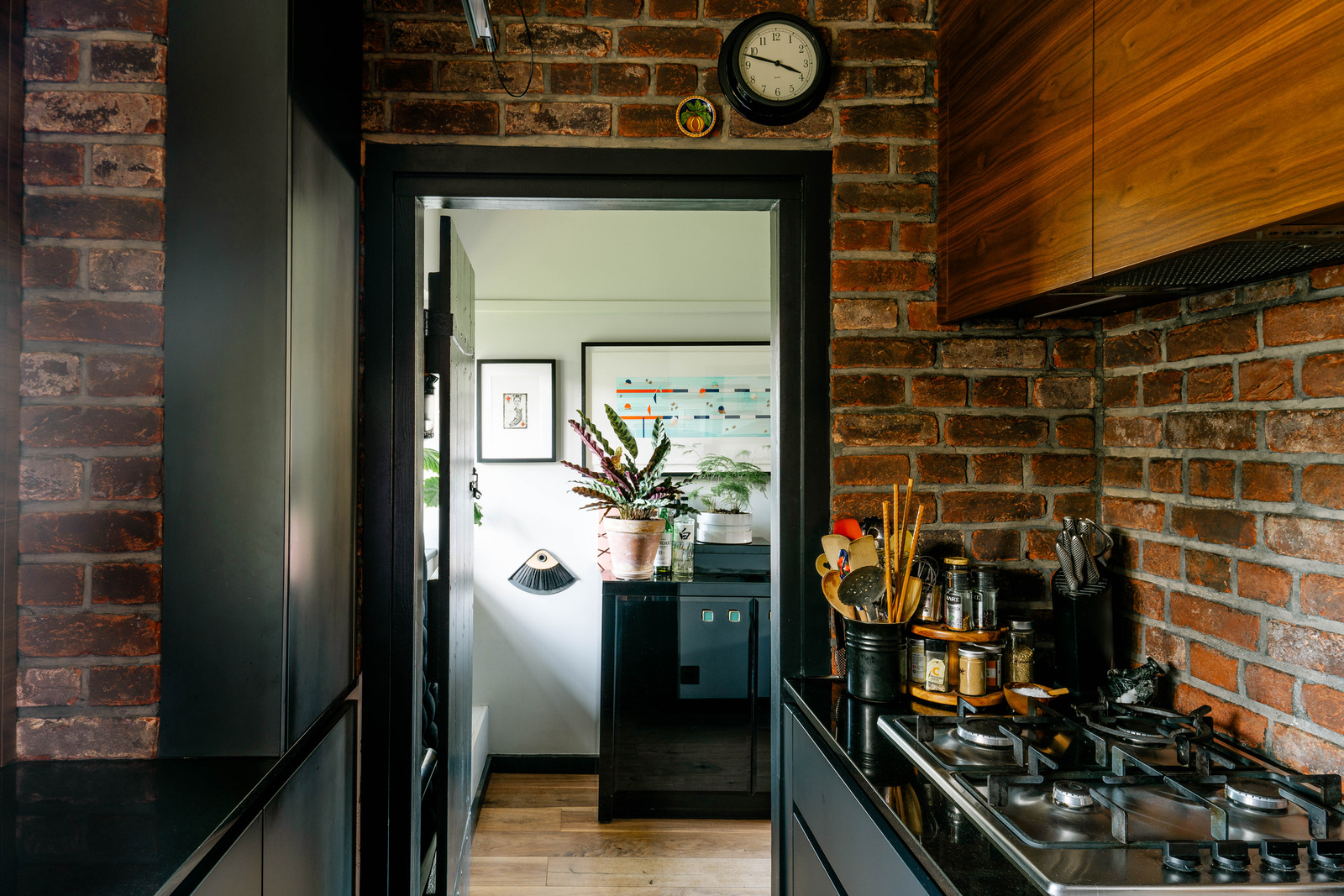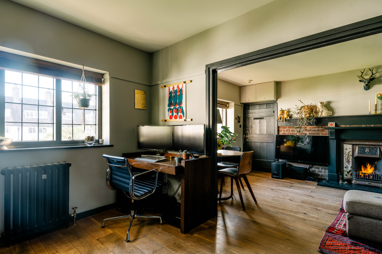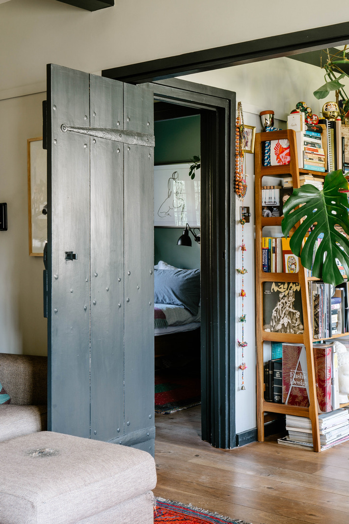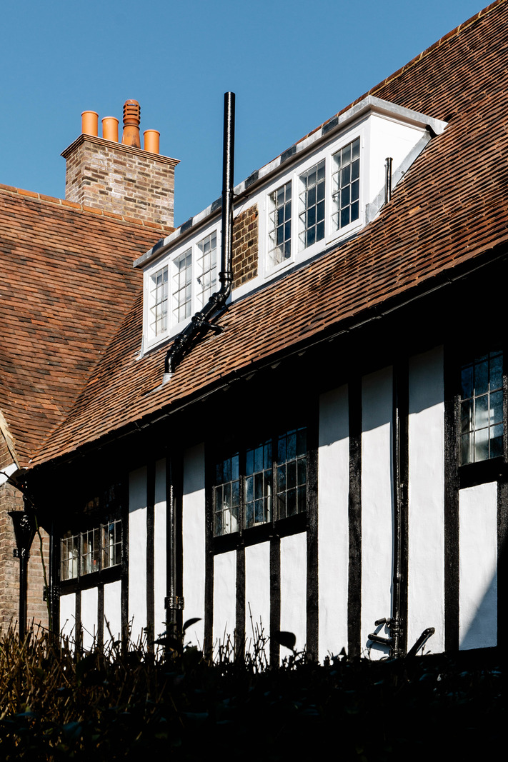 In the heart of Waterlow Court, Hampstead's Edwardian gem in England, lies a vintage flat full of character. It charms with its Arts & Crafts spirit and cosy atmosphere. Perched on the first floor of the old building, this 45m2 one-bedroom flat has retained its early 20th-century charm. Built in 1909, it is decorated in a dark colour palette with particular attention to detail. The living room features mullioned windows, wooden beams and a fireplace covered in painted floral tiles. A pale grey walls and ‘Off-Black’ wood panelling by Farrow & Ball add a graphic touch to the overall look.