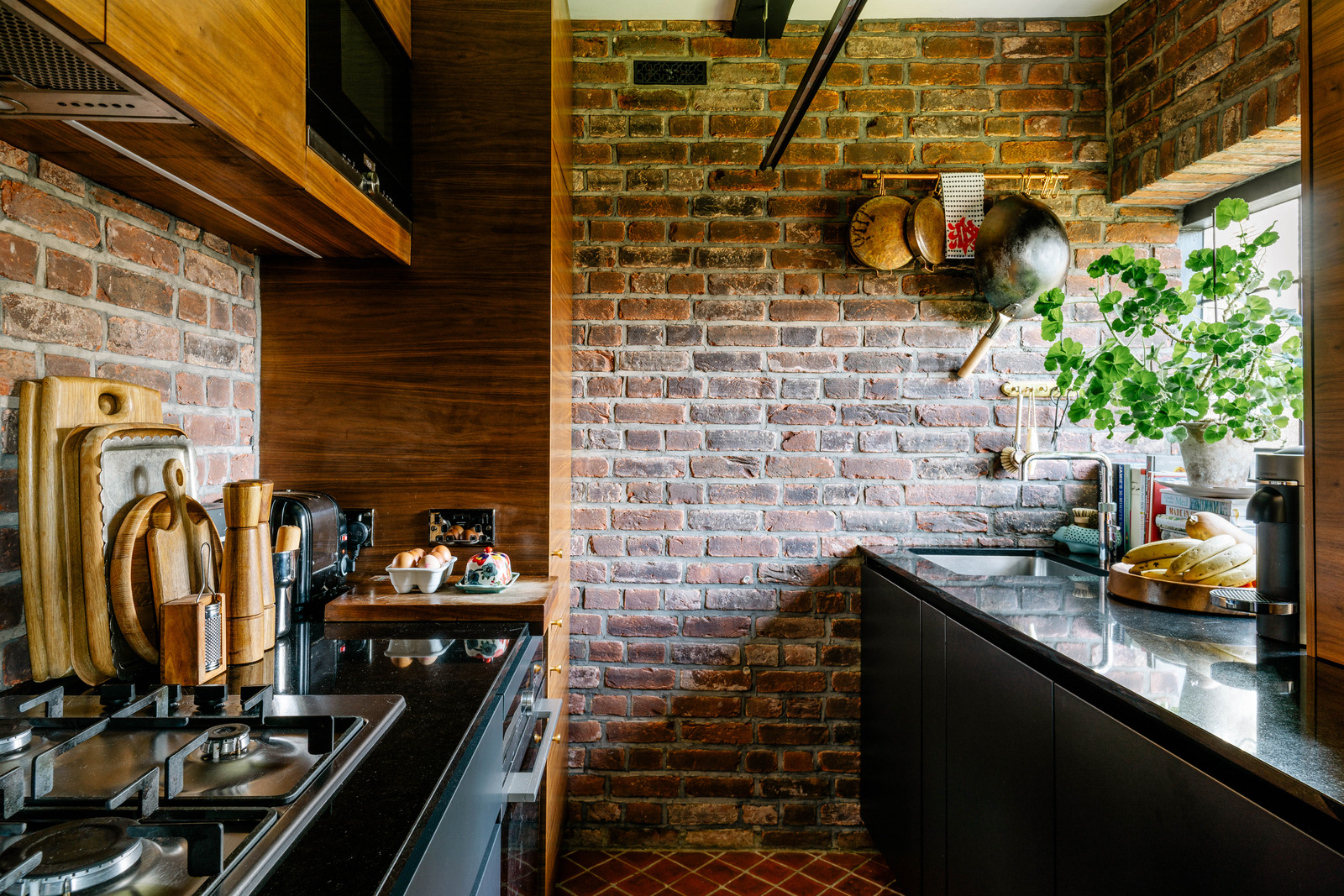 La cuisine, toute en briques apparentes et carreaux de terre cuite faits main, respire la beauté du travail artisanal. Dans la chambre, les murs « Green Smoke » évoquent la nature environnante, tandis que la salle de bain marie carreaux marocains artisanaux et porcelaine avec élégance. Autour, les jardins partagés et la cour à arcades offrent une parenthèse de verdure paisible, fidèle à la vision des concepteurs du bâtiment.