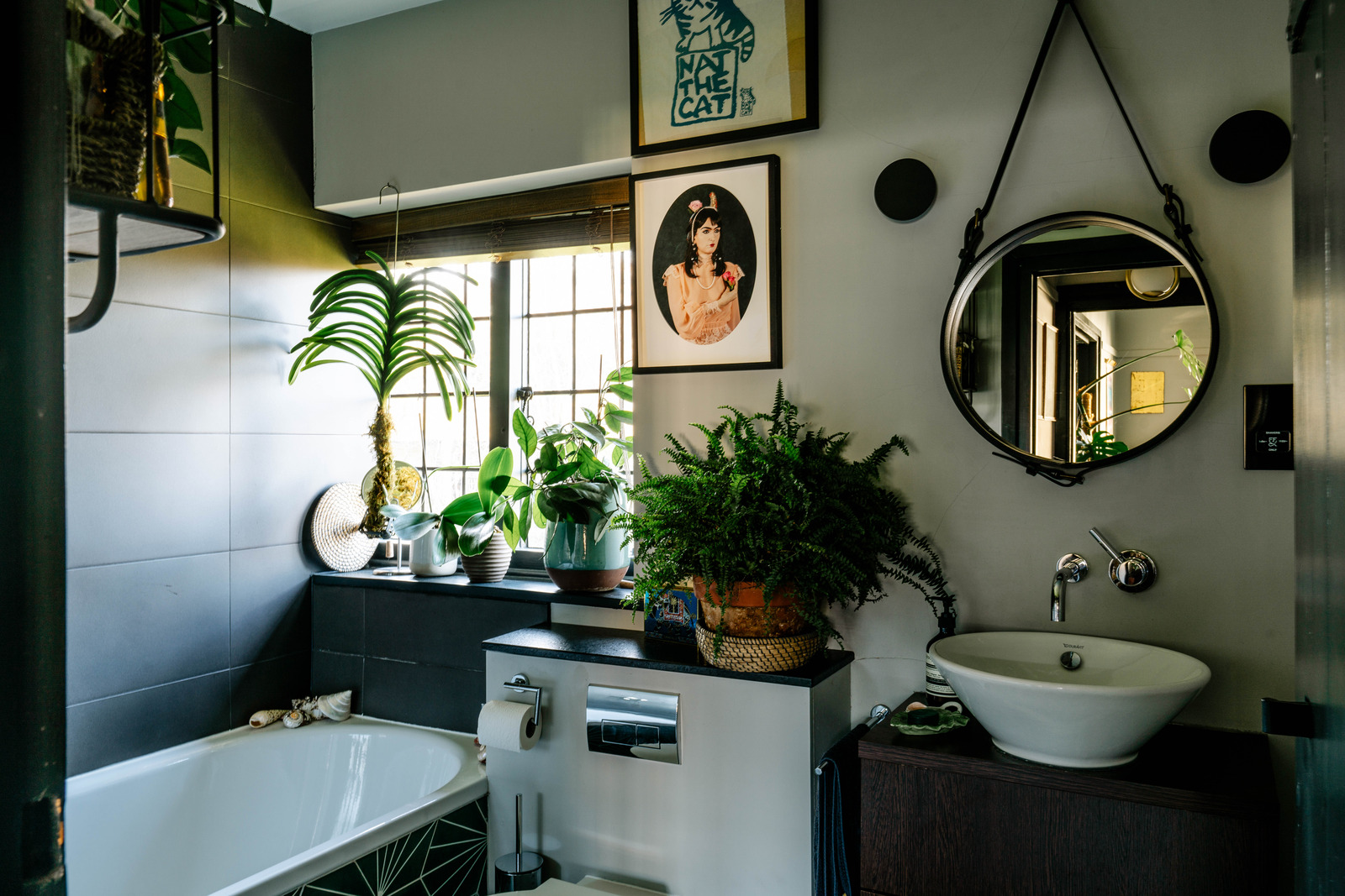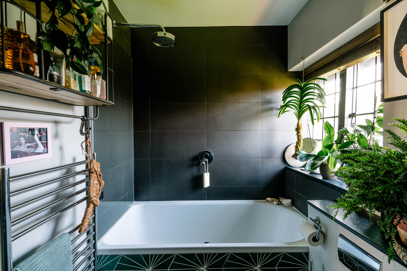 Au cœur du Waterlow Court, joyau édouardien d’Hampstead en Angleterre, voici un appartement vintage plein de caractère. Il séduit par son esprit Arts & Crafts et son atmosphère feutrée. Perché au premier étage du bâtiment ancien, ce deux-pièces de 45m2 a conservé le charme du début du 20e siècle. Construit en 1909, il est décoré avec une palette sombre et un soin particulier apporté au détails. La pièce de vie, mêle fenêtres à meneaux, poutres en bois et cheminée habillée de carreaux floraux peints. Les murs gris pâle et les boiseries « Off-Black » de Farrow & Ball ajoutent une touche graphique à l’ensemble.