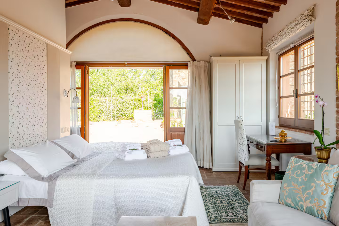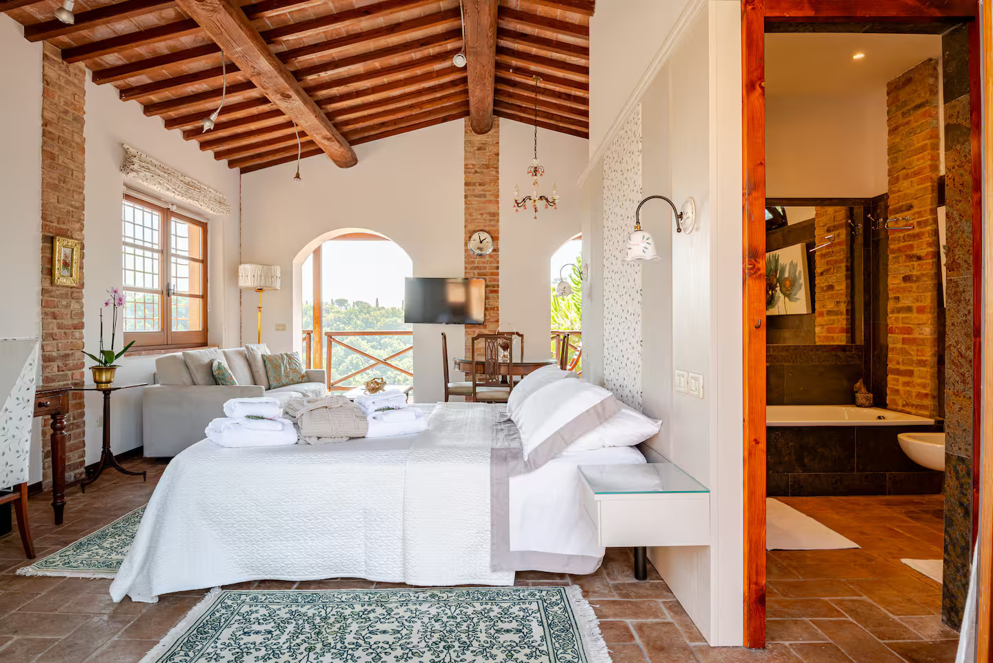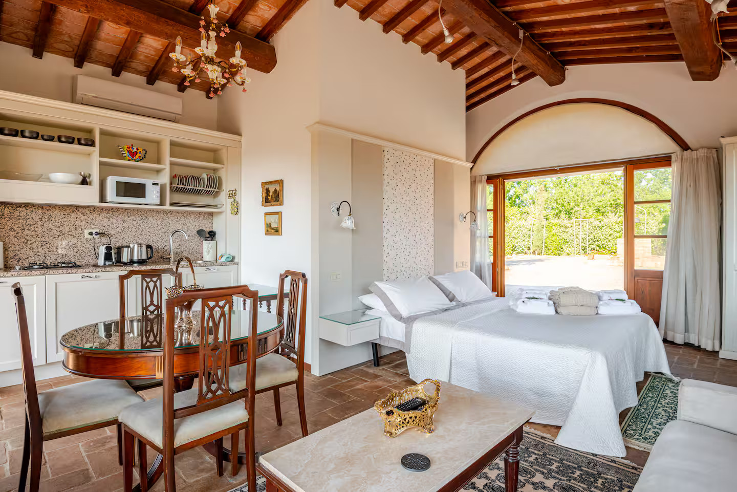 The house has an open-plan layout, designed as a rustic mini loft with completely open spaces. Its living room, kitchen, dining room and sleeping area coexist in the large room. The only exception is the enclosed bathroom, clad in contemporary marble, which adds a touch of luxury. Outside, a covered terrace overlooks the landscape and invites you to pause and contemplate. A renovated former farm building, the house has retained its original features, which have been carefully highlighted. Small-paned windows, arched bay windows and ochre walls tell an ancient story. Halfway between Rome and Florence, it is located on a large property and enjoys almost complete tranquillity. The atmosphere exuded by this small rustic house gives the impression that it has always been there.
