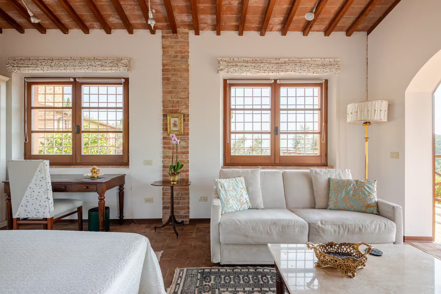 La maison présente un plan ouvert, pensé comme un mini loft rustique aux volumes totalement décloisonnés. Salon, cuisine, salle à manger et espace nuit cohabitent dans la grande pièce. Seule exception, la salle de bain fermée, habillée de marbre contemporain, apporte une touche précieuse. À l’extérieur, une terrasse couverte domine le paysage et invite aux pauses contemplatives. Ancien bâtiment agricole rénové, la maison a conservé des éléments d’origine soigneusement mis en valeur. Fenêtres à petits carreaux, baie vitrée cintrée et murs ocre racontent une histoire ancienne. À mi-chemin entre Rome et Florence, elle se trouve sur une grande propriété et profite d'un calme presque absolu. L’atmosphère dégagée par cette petite maison rustique donne l’impression qu'elle a toujours été là.