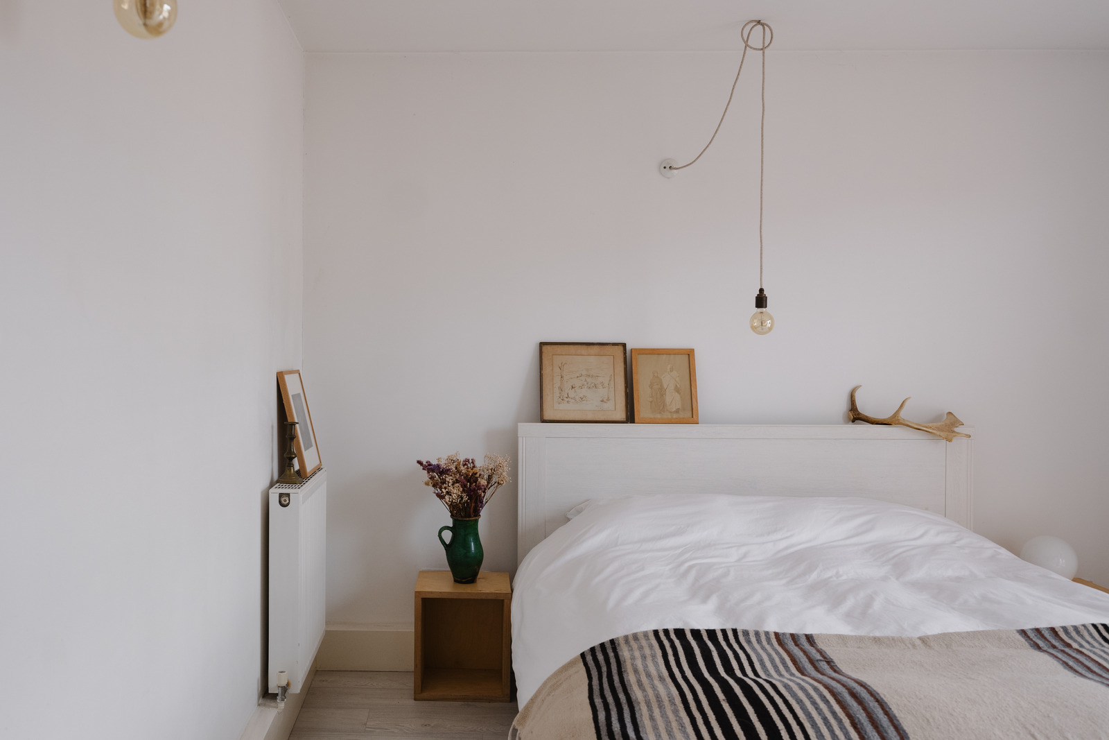 The entrance opens onto a welcoming hall that sets the tone from the moment you step inside. Its living area is the nerve centre and features an L-shaped kitchen, a bright living room and a dining area. Two large bay windows offer an unusual view of the old cemetery. Light floods into the space, highlighting a soft palette of browns and whites that complement each other perfectly. In the lounge area, a Togo sofa adds a touch of retro style and design. The kitchen, fitted with white cabinets and oak worktops, has a simple and reassuring atmosphere. Two bedrooms complete the property, each enjoying a rare sense of calm thanks to the inner courtyard. They share a bathroom. This two-bedroom apartment is an example of a serene interior where you sometimes forget that you are in the heart of the city.