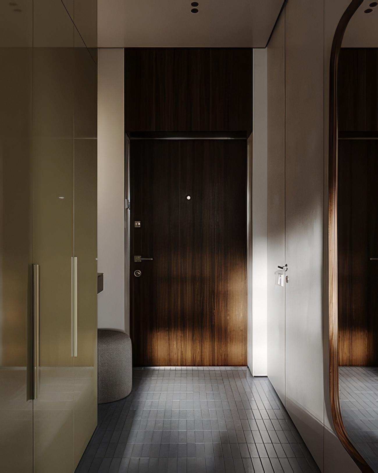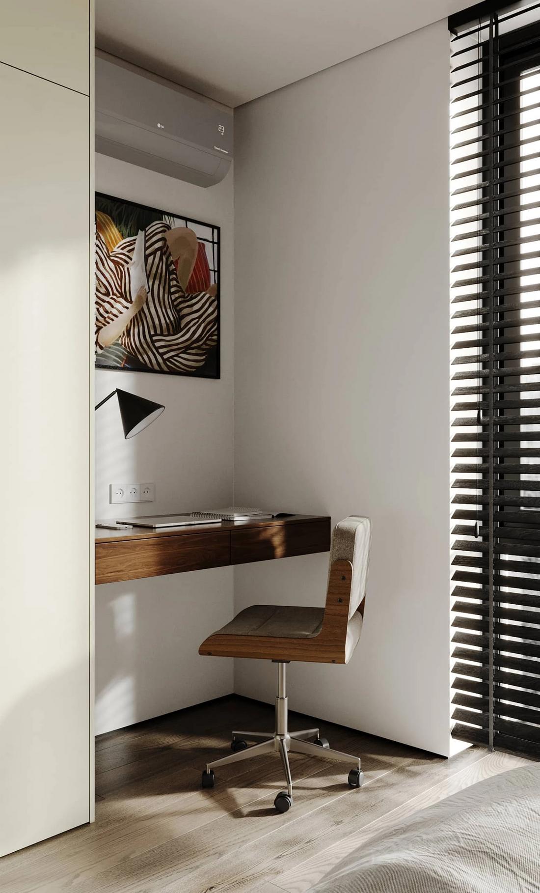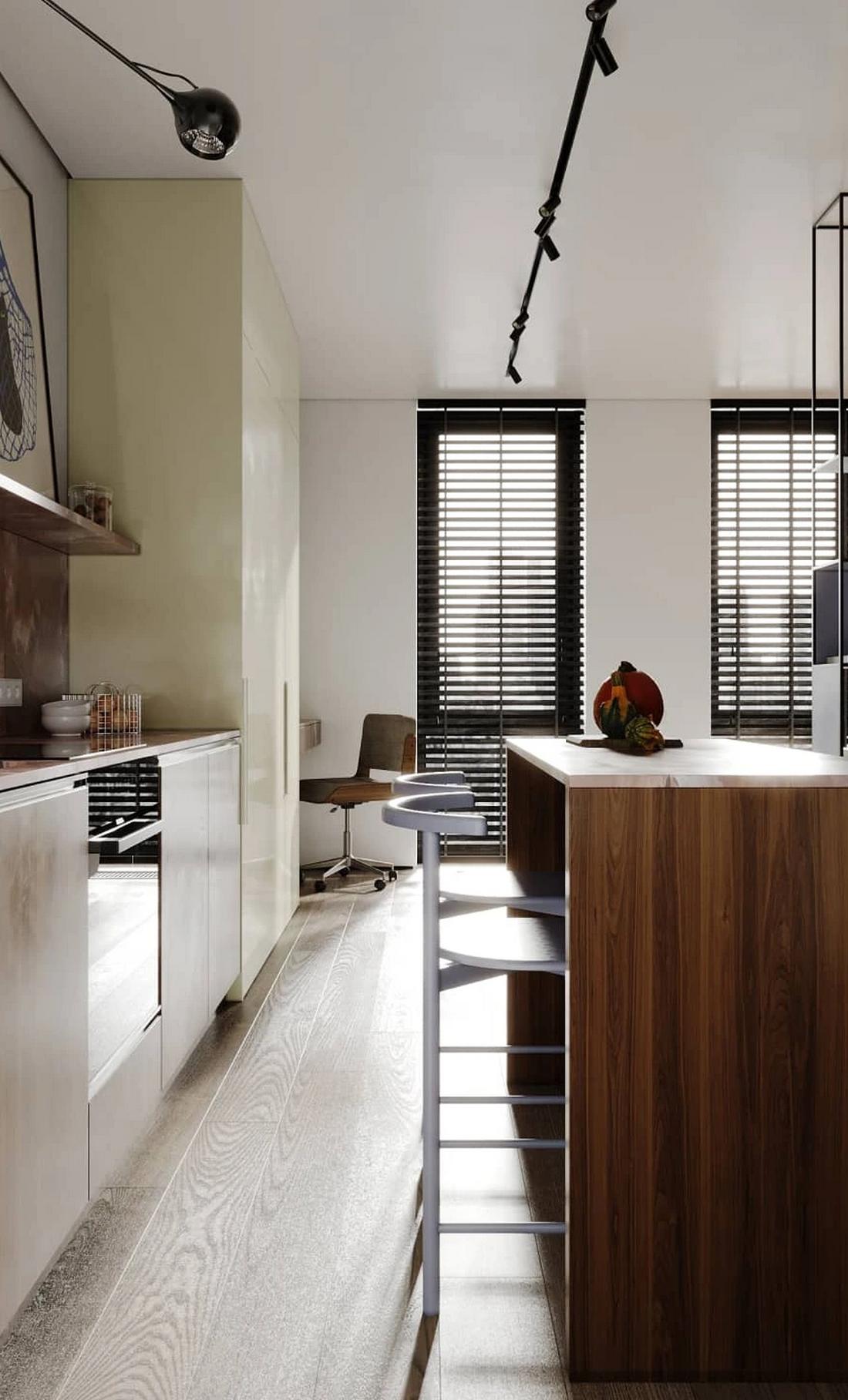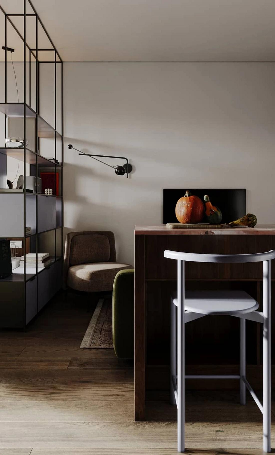 The design of a 33m2 studio in mid-century modern style was achieved by structuring the space by designer Nika Lebededeva from the Lebedeva Project studio. This space, designed with rationality and intelligence, aims for everyday efficiency. Every square metre is used with precision, without visual overload or compromising on comfort. The mid-century aesthetic here is based on a subtle dialogue between khaki green velvet and warm walnut. The deep green sofa structures the living room and serves as a central visual anchor.