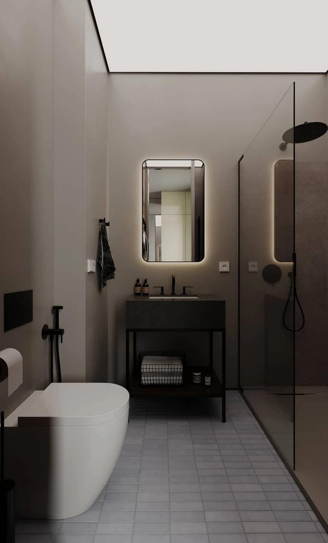 Derrière lui, un ensemble de rangements ouverts crée une séparation nette avec la cuisine. L’îlot central joue plusieurs rôles, réunissant repas, préparation culinaire et stockage malin. Le comptoir en pierre rose veinée de blanc capte immédiatement l’attention et dynamise l’ensemble. La lumière naturelle traverse l’espace grâce aux hautes fenêtres équipées de stores noirs sobres. La zone nuit se distingue par une bibliothèque toute hauteur, laissant circuler lumière et perspectives. Un poste de travail compact complète l’aménagement, discret mais cohérent avec l’ensemble. La salle de bain adopte les mêmes codes, privilégiant lignes nettes et rangements intégrés. L' aménagement d'un studio de 33m2 comme celui-ci prouve qu’un petit espace peut offrir une vraie qualité de vie.