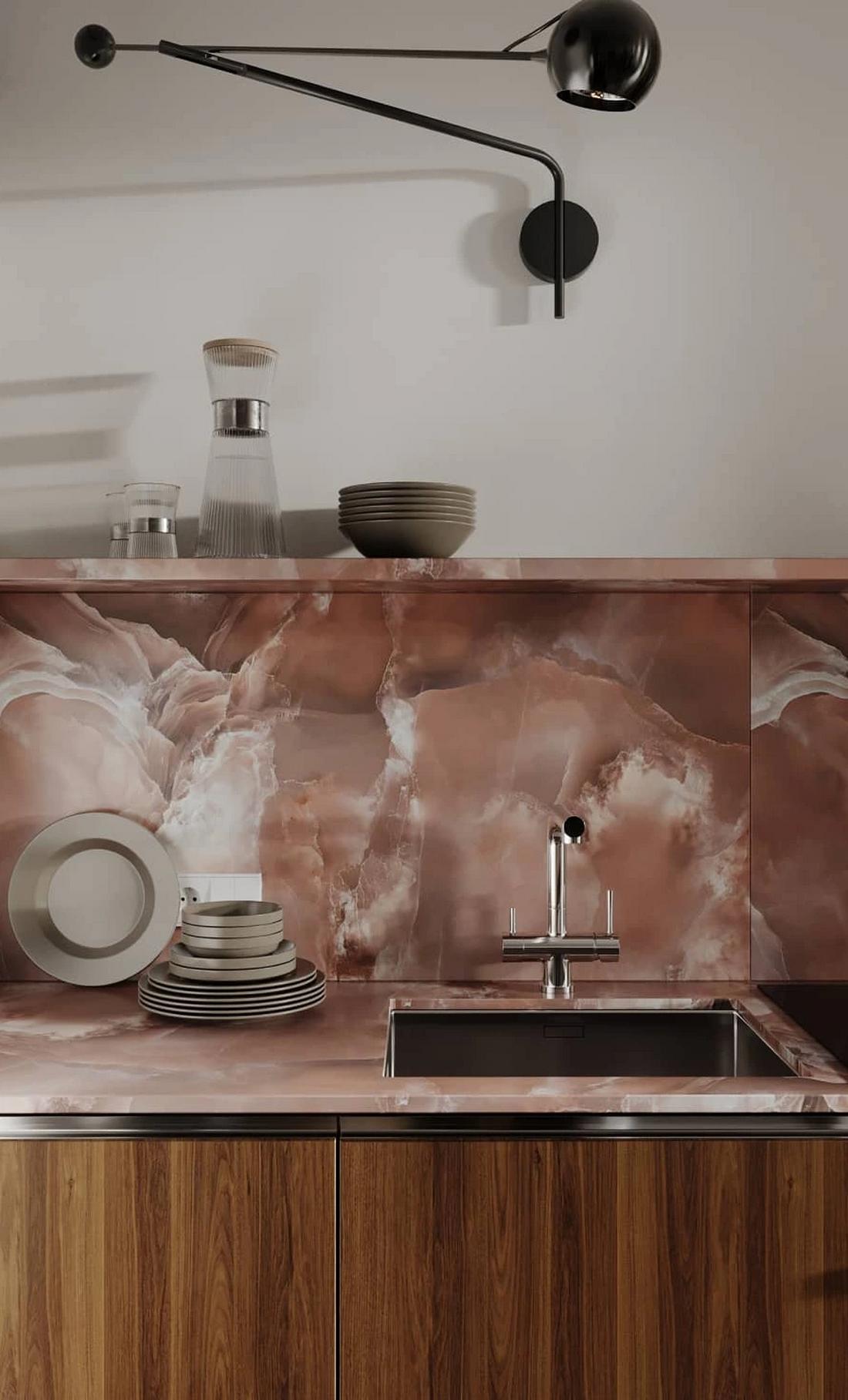 Behind it, a set of open storage units creates a clear separation from the kitchen. The central island plays several roles, combining dining, food preparation and clever storage. The pink stone countertop with white veining immediately catches the eye and energises the whole space. Natural light floods through the space thanks to the tall windows fitted with simple black blinds. The sleeping area features a floor-to-ceiling bookcase, allowing light and views to flow through. A compact workstation completes the layout, discreet but consistent with the whole. The bathroom follows the same design codes, favouring clean lines and built-in storage. The layout of a 33m2 studio like this one proves that a small space can offer a real quality of life.