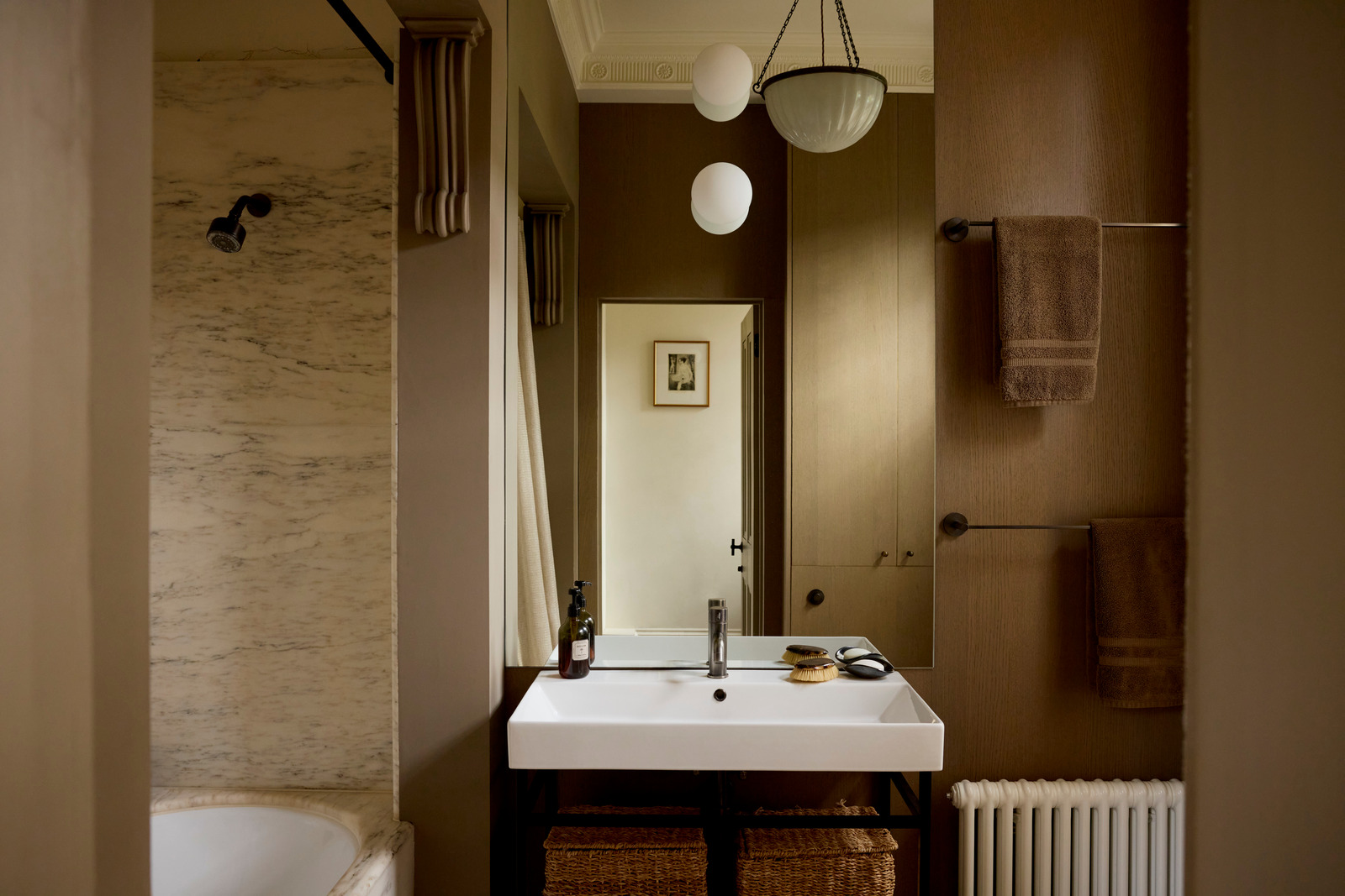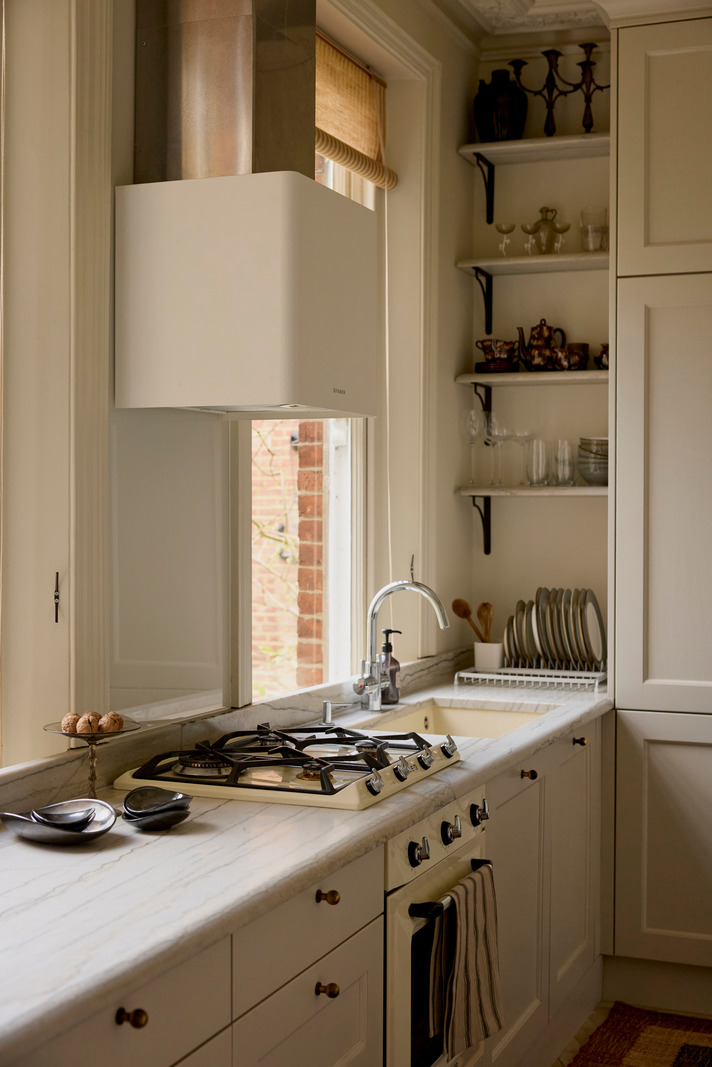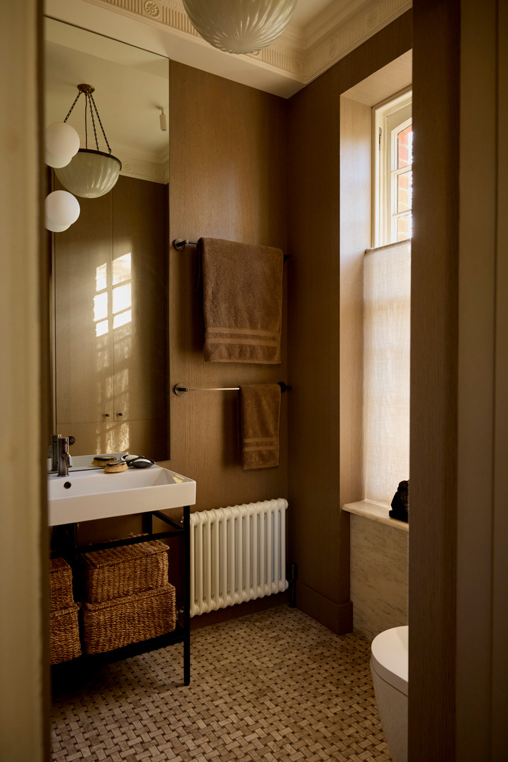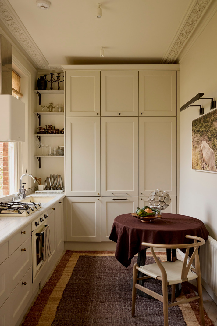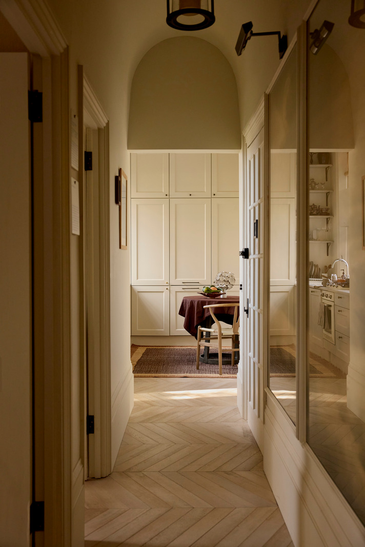 In London, this 67m2 Victorian apartment combines stucco and noble materials with a soothing colour palette. The apartment is located in an elegant, traditional building with a red brick façade. The owners, who are designers, have opted for understated colours and refined materials. As soon as you enter, the oak flooring sets the tone for a warm and tasteful interior. This theme continues throughout the apartment, in each of the different rooms.