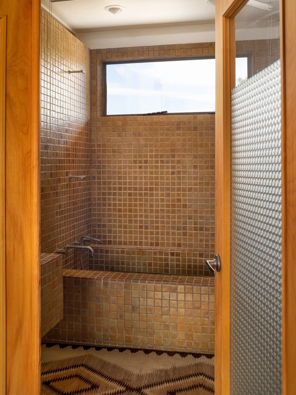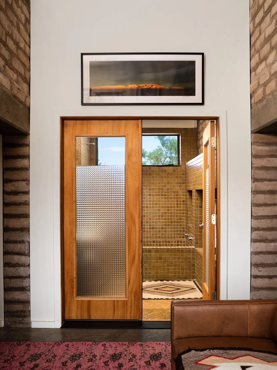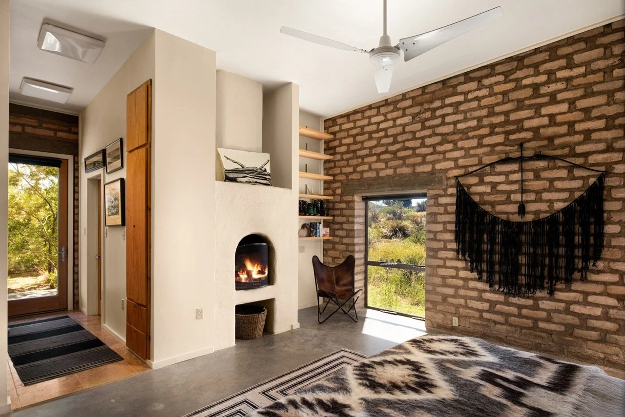 La maison principale comprend deux chambres, deux cheminées et une cuisine ouverte sur l’espace de vie. Les murs en briques de terre cuite restent apparents, à l’extérieur comme à l’intérieur. Les tons chauds dominent l’ensemble, accompagnés d’un sol en béton ciré. La maison de plain-pied s’ouvre largement sur le paysage. Les porches et la cour fermée prolongent les espaces vers l’extérieur sans rupture visuelle. Autonome, elle dispose de panneaux solaires, et d’un système de récupération d’eau. Une "casita" indépendante accueille les invités pour plus d'intimité. Cette maison illustre un équilibre maîtrisé entre architecture, décoration et environnement.