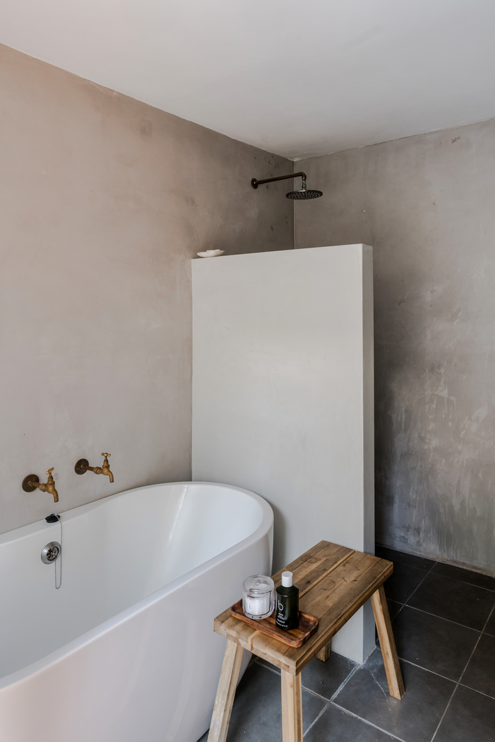 The Corian worktops reinforce the graphic simplicity and the feeling of space. The living room combines vintage furniture and contemporary lines, with a 1950s teak sideboard. Two bedrooms complete the ensemble, one of which has an original Art Deco fireplace. The micro-cement bathroom extends the Mediterranean inspiration down to the last detail. Large black glass doors open directly onto a raised courtyard. Outside, the vegetation and Moroccan tiles evoke an exotic travel atmosphere. The exposed bricks still present in the courtyard subtly recall the original use of the former warehouse.