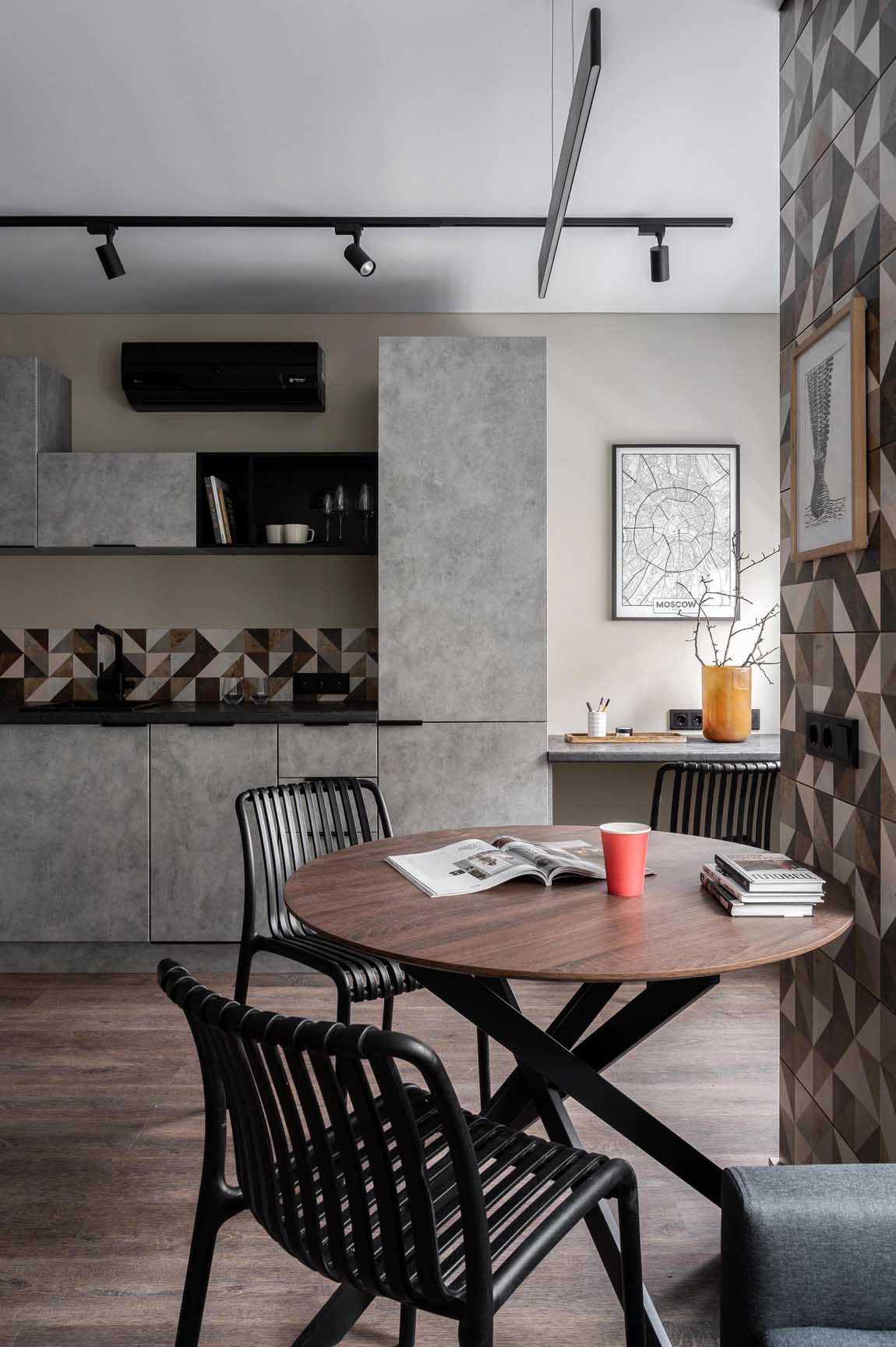 Dans les grandes villes, chaque mètre carré compte et oblige à penser l’aménagement intelligemment. Ce studio de 26m2 avec un coin nuit bien séparé par des pavés de verre prouve qu’un petit espace peut tout accueillir, sans jamais donner l’impression d’étouffer. Une petite surface mais beaucoup d’idées, et un plan redoutablement efficace pour vivre confortablement. Ici, la designer Irina Bebeshina a imagine un petit appartement fluide, pensé pour une personne active. La cuisine, le salon, l'espace bureau et et le coin nuit cohabitent et sont bien délimités. Le fil conducteur décoratif repose sur une géométrie graphique, et le gris.