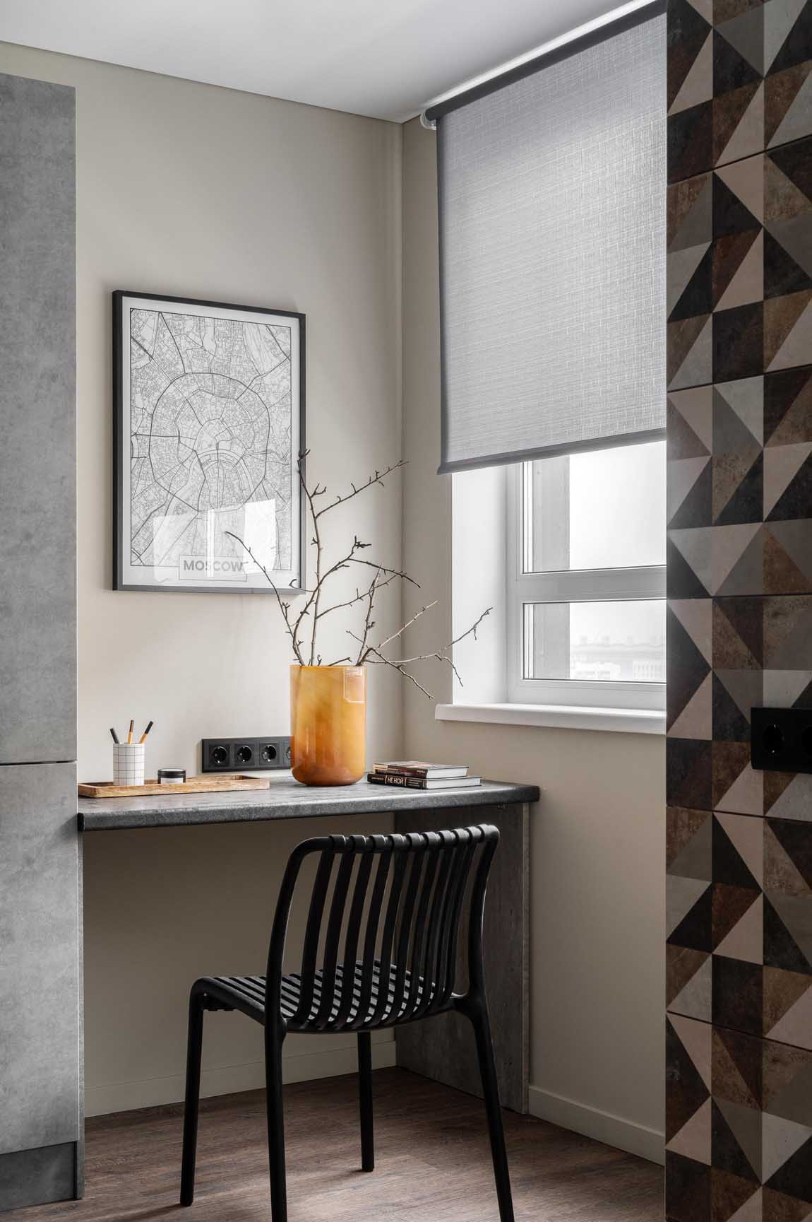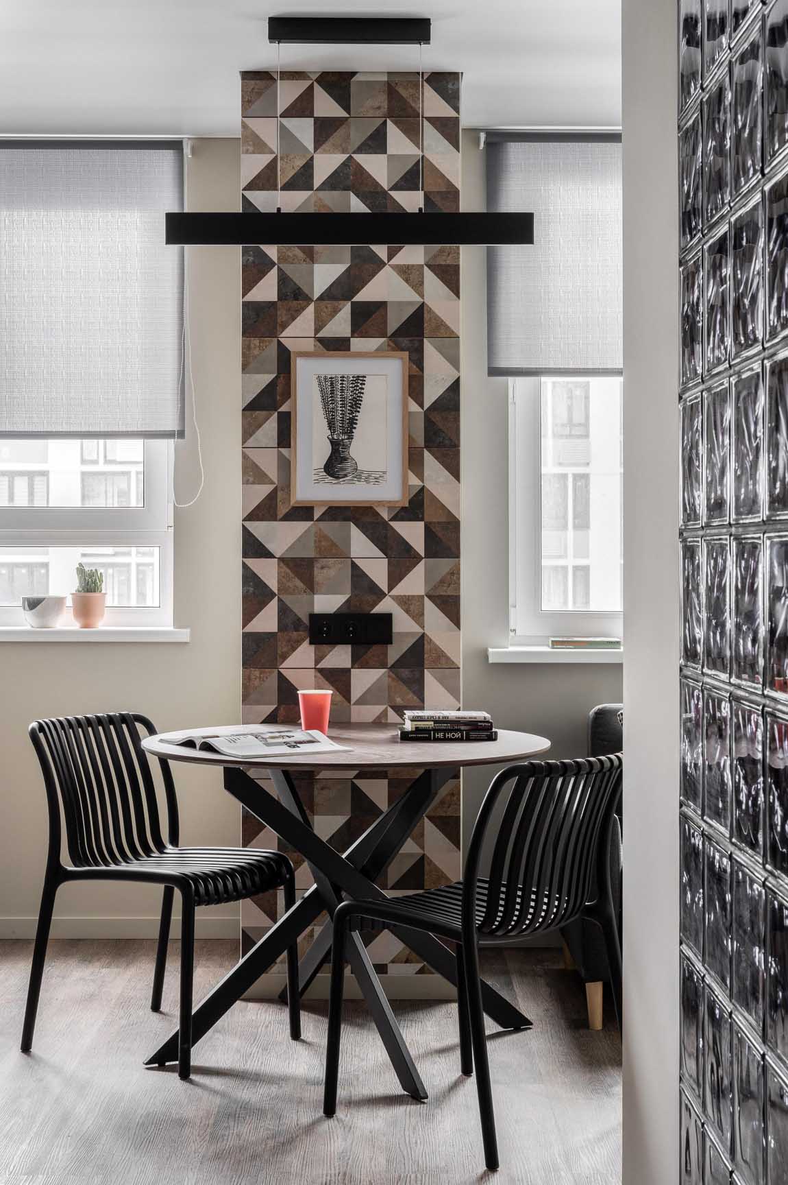 In big cities, every square metre counts, forcing us to think cleverly about layout. This 26m2 studio with a sleeping area separated by glass blocks proves that a small space can accommodate everything without ever feeling cramped. A small surface area but lots of ideas, and a highly effective layout for comfortable living. Here, designer Irina Bebeshina has created a small, fluid apartment designed for an active person. The kitchen, living room, office space and sleeping area coexist and are clearly defined. Its decorative theme is based on graphic geometry and grey.