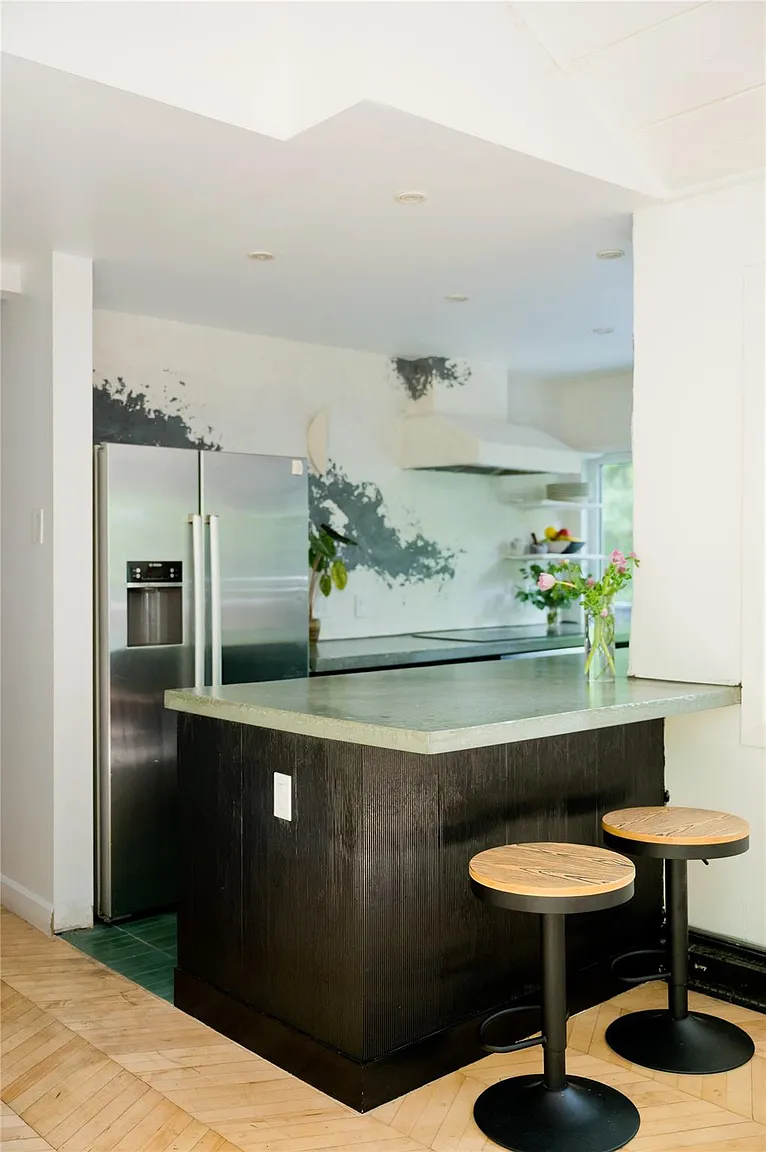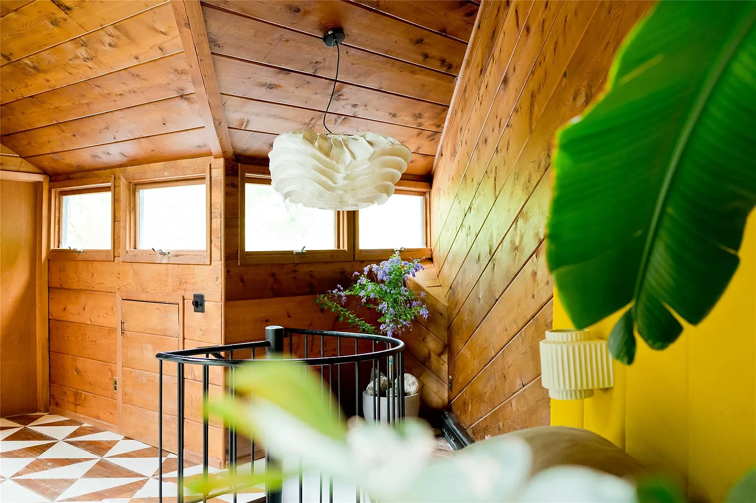 Imaginée en 1969 puis transformée par le studio Dean & Dahl, cette maison en bois contemporaine au design audacieux, développe 250m2 inventifs et spectaculaires. Son architecture avec ses grandes parois vitrées s'ouvre sur un terrain boisé préservé. Le salon, installé à l’étage, donne réellement l’impression de flotter dans la cime des arbres. À l’intérieur, l’esthétique surprend par son esprit contemporain et des partis pris parfois ludiques comme dans les chambres.