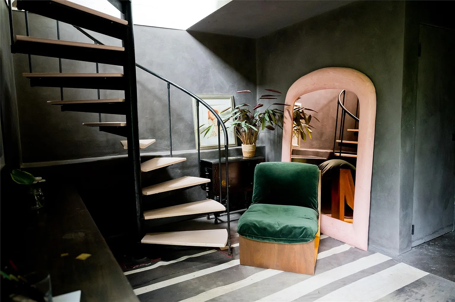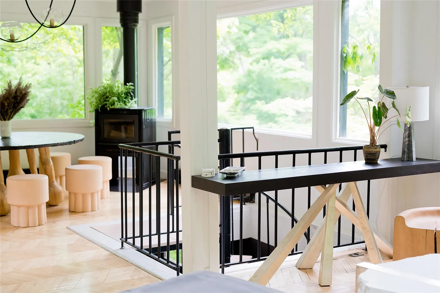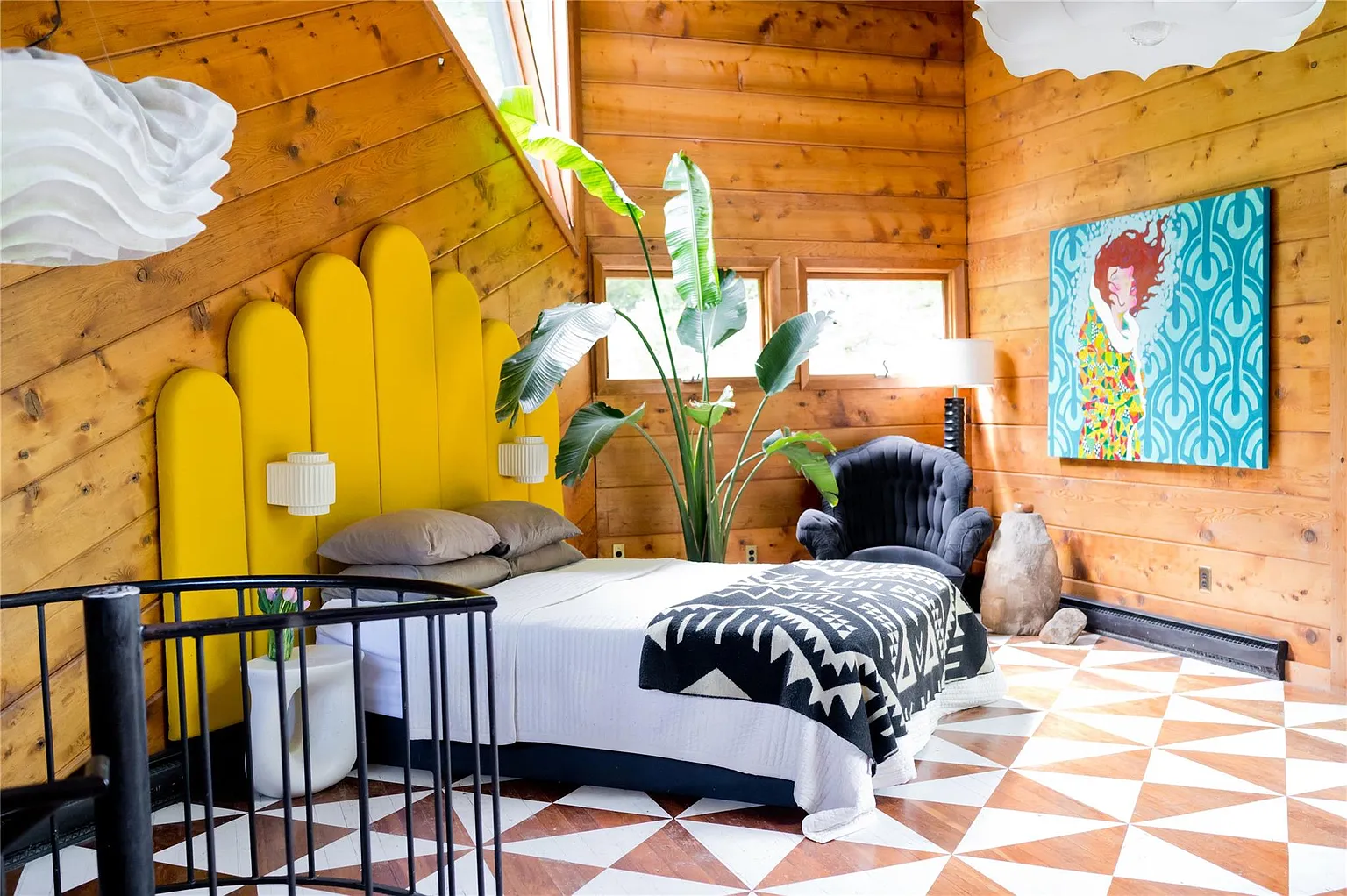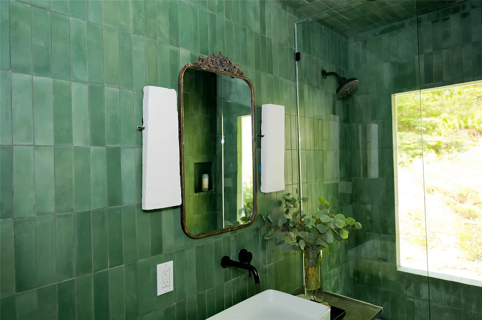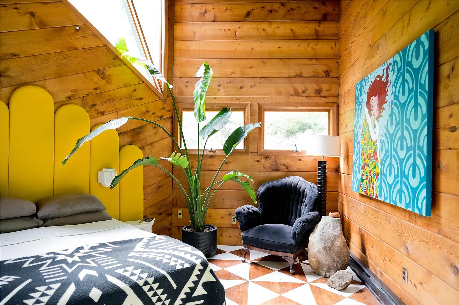 They feature original decorative choices, combining bold colours with deliberately neutral bases. This combination creates an unexpected visual balance, far removed from the usual codes of forest homes. Here, contemporary design interacts unfiltered with unspoilt and intensely present nature. Outside, moss-covered rocks and winding stone paths immerse you in nature. The property opens directly onto the trails leading to Granite Mountain Reserve. Photo: David Coppola
