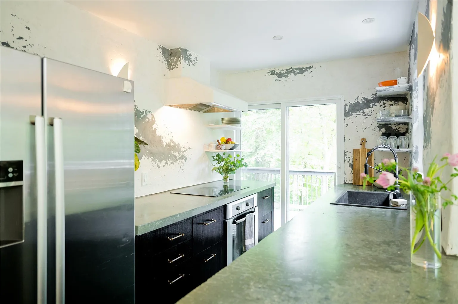 Elles affichent des choix décoratifs originaux, mêlant couleurs franches et bases volontairement neutres. Cette cohabitation crée un équilibre visuel inattendu, très éloigné des codes habituels de la maison forestière. Ici, le design contemporain dialogue sans filtre avec une nature intacte et intensément présente. À l’extérieur, les rochers couverts de mousse et les chemins de pierre sinueux vous immergent dans la nature. Le terrain s’ouvre directement sur les sentiers menant à la réserve de Granite Mountain. Photo: David Coppola