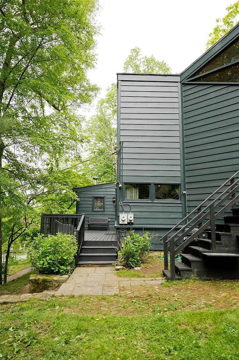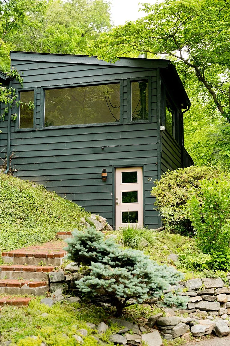 This contemporary wooden house with a bold design surrounded by nature is for sale on Zillow