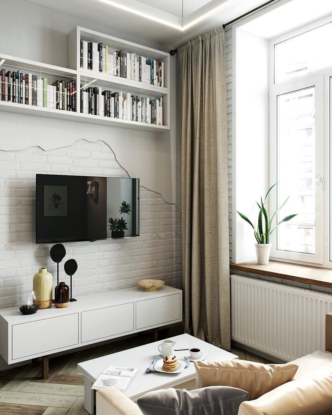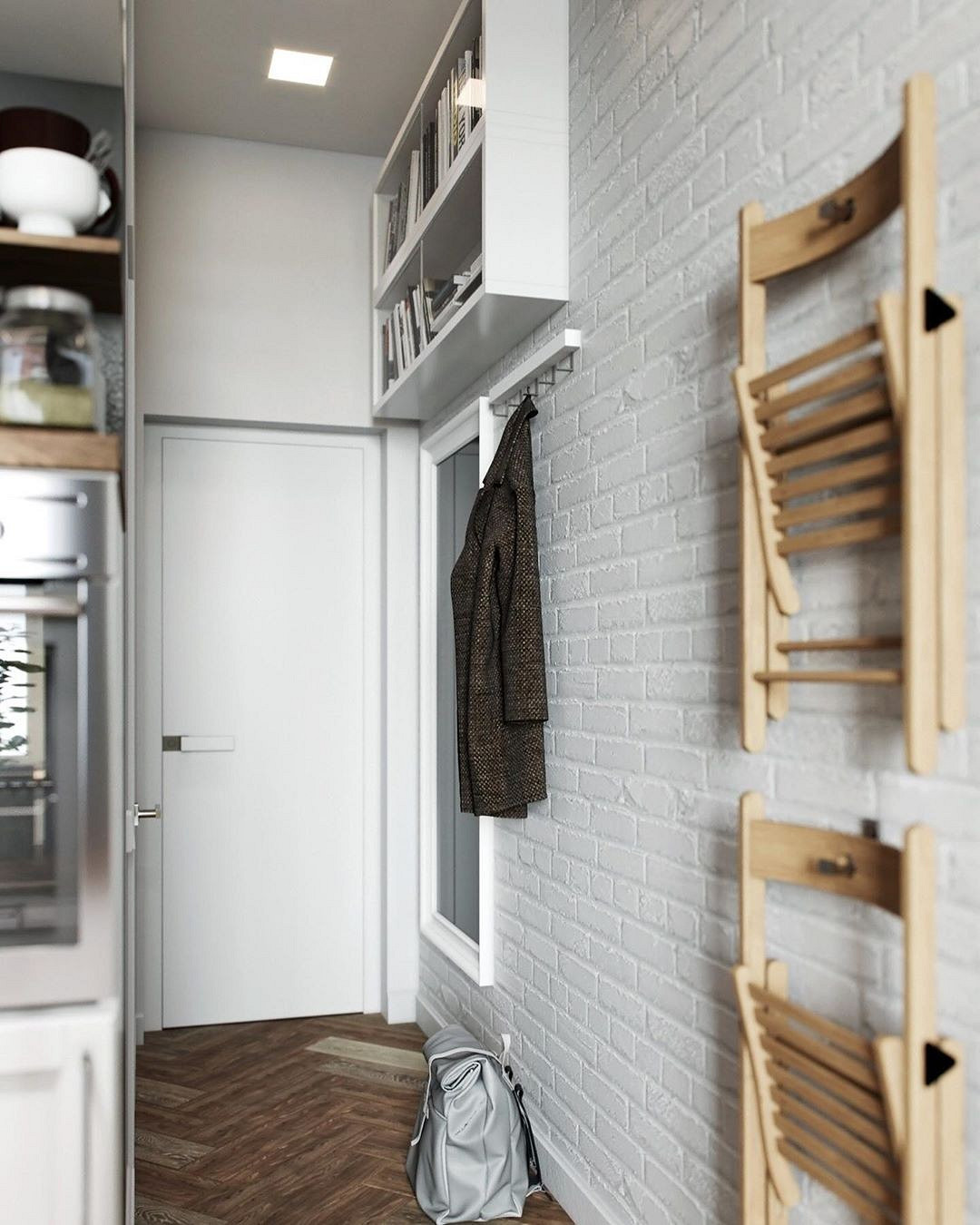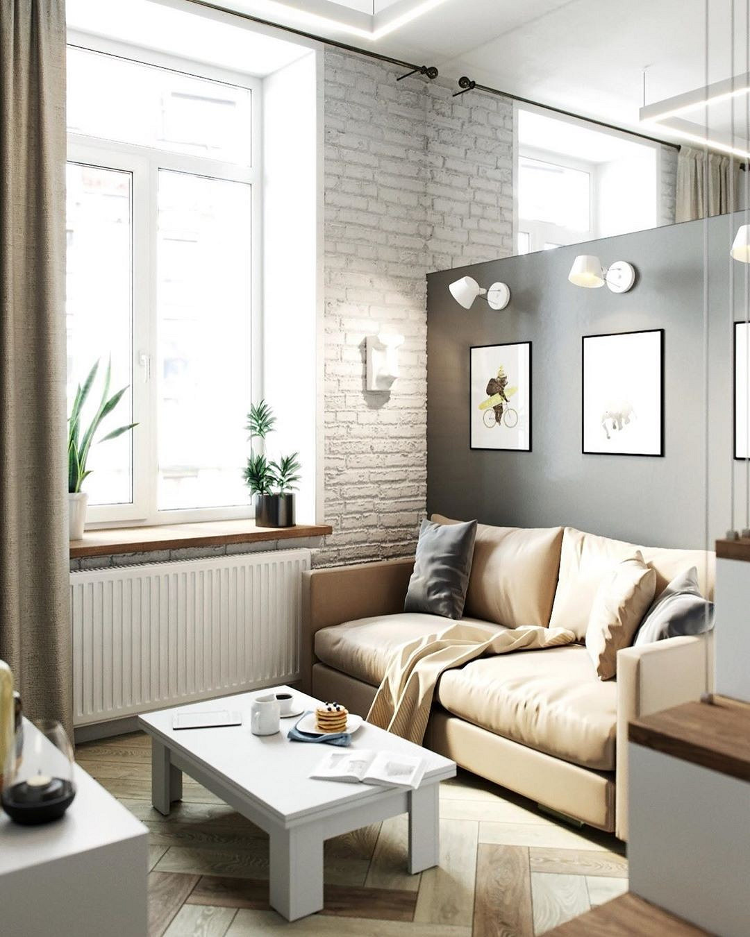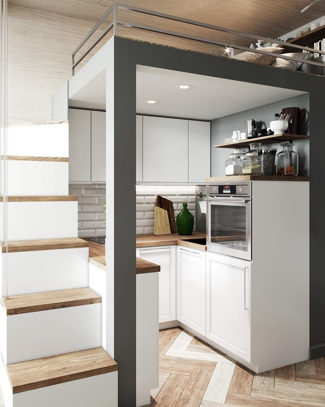 Sous la mezzanine, une petite cuisine s’intègre discrètement, sans alourdir visuellement l’ensemble. Le plafond habillé de bois adoucit la dominance du blanc et apporte une atmosphère plus chaleureuse. Le bois se retrouve également sur les marches, créant une continuité visuelle simple et efficace. Le garde-corps en filins métalliques reste discret, sécurisant l’escalier sans bloquer la lumière. Des touches de gris structurent la cuisine et soulignent le pilier central de l’aménagement. Les murs en briques, peints en blanc, amplifient la luminosité et modernisent l’espace existant. Un grand miroir, placé au-dessus du canapé, renvoie la lumière naturelle dans toute la pièce. Aménager un studio de 18m2 avec une mezzanine et l'optimiser comme ceci est une excellente solution !