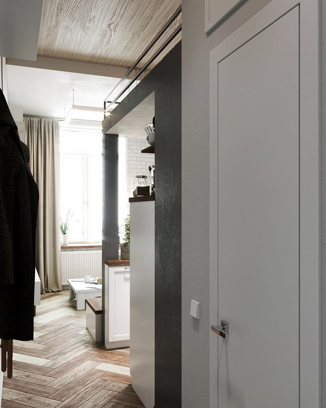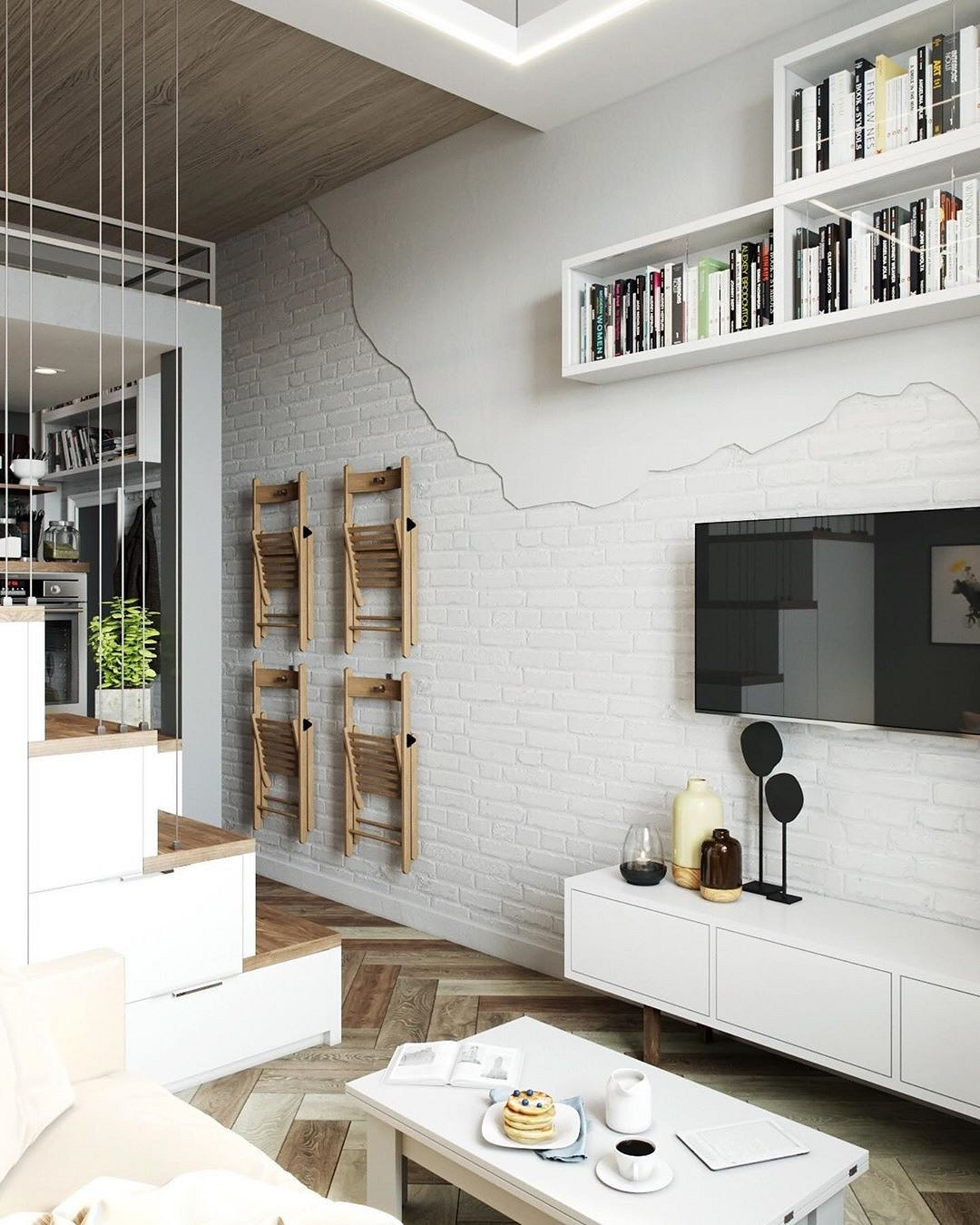 Under the mezzanine, a small kitchen is discreetly integrated without visually weighing down the space. The wood-panelled ceiling softens the dominance of white and creates a warmer atmosphere. Wood is also used on the steps, creating a simple and effective visual continuity. The metal cable railing is discreet, securing the staircase without blocking the light. Touches of grey structure the kitchen and highlight the central pillar of the layout. The white-painted brick walls amplify the brightness and modernise the existing space. A large mirror above the sofa reflects natural light throughout the room. Fitting out an 18m2 studio with a mezzanine and optimising it like this is an excellent solution!
