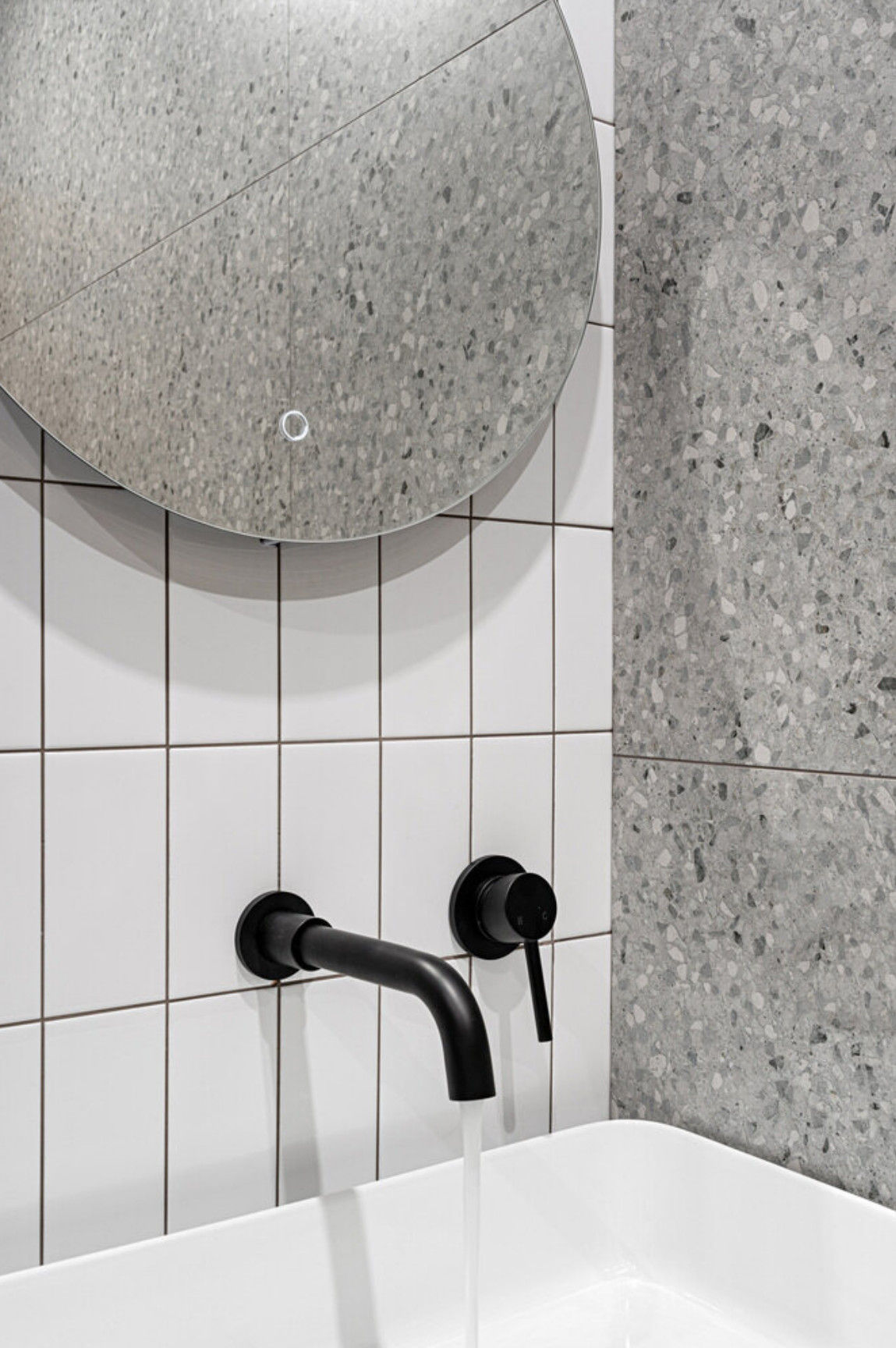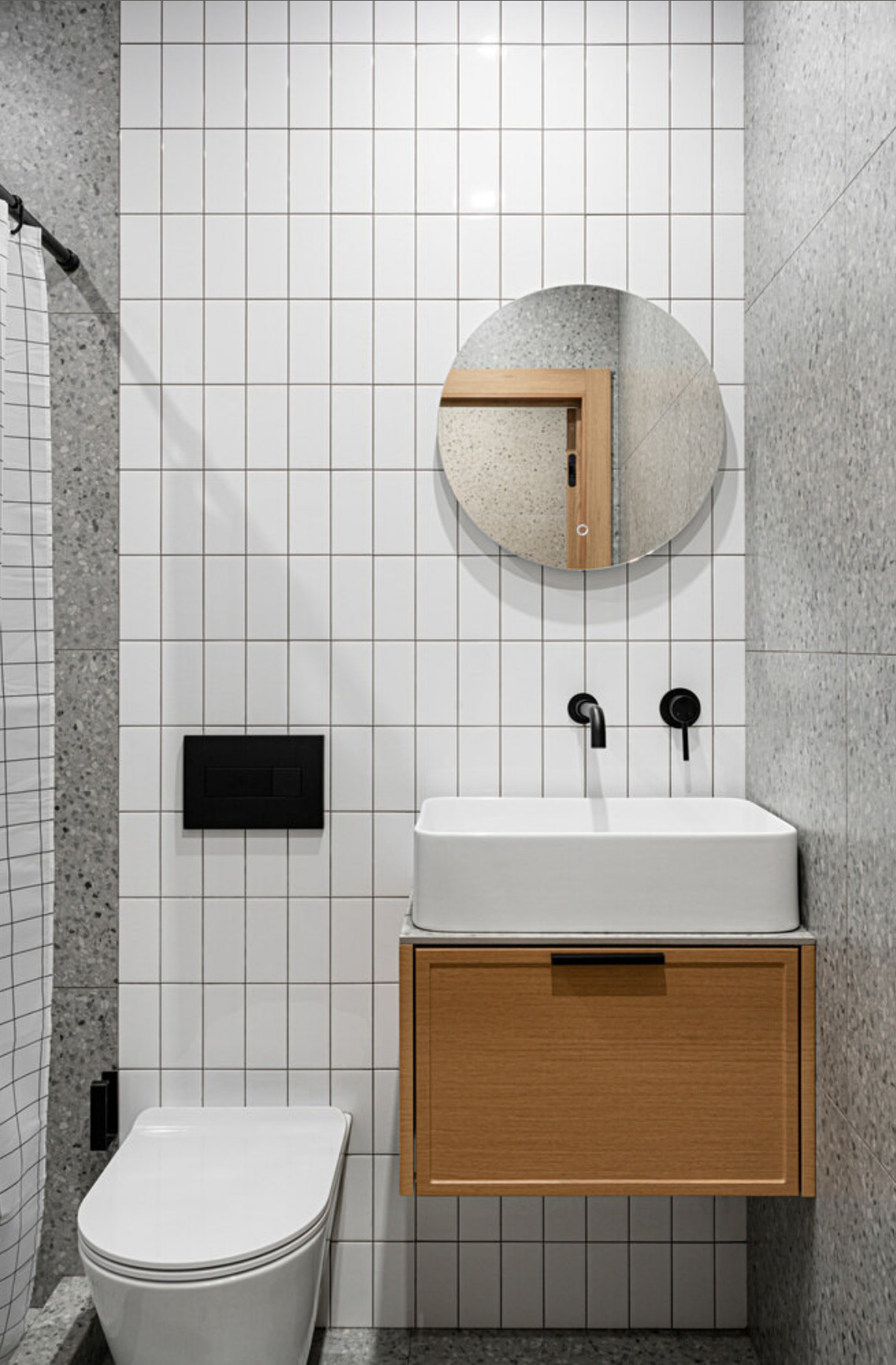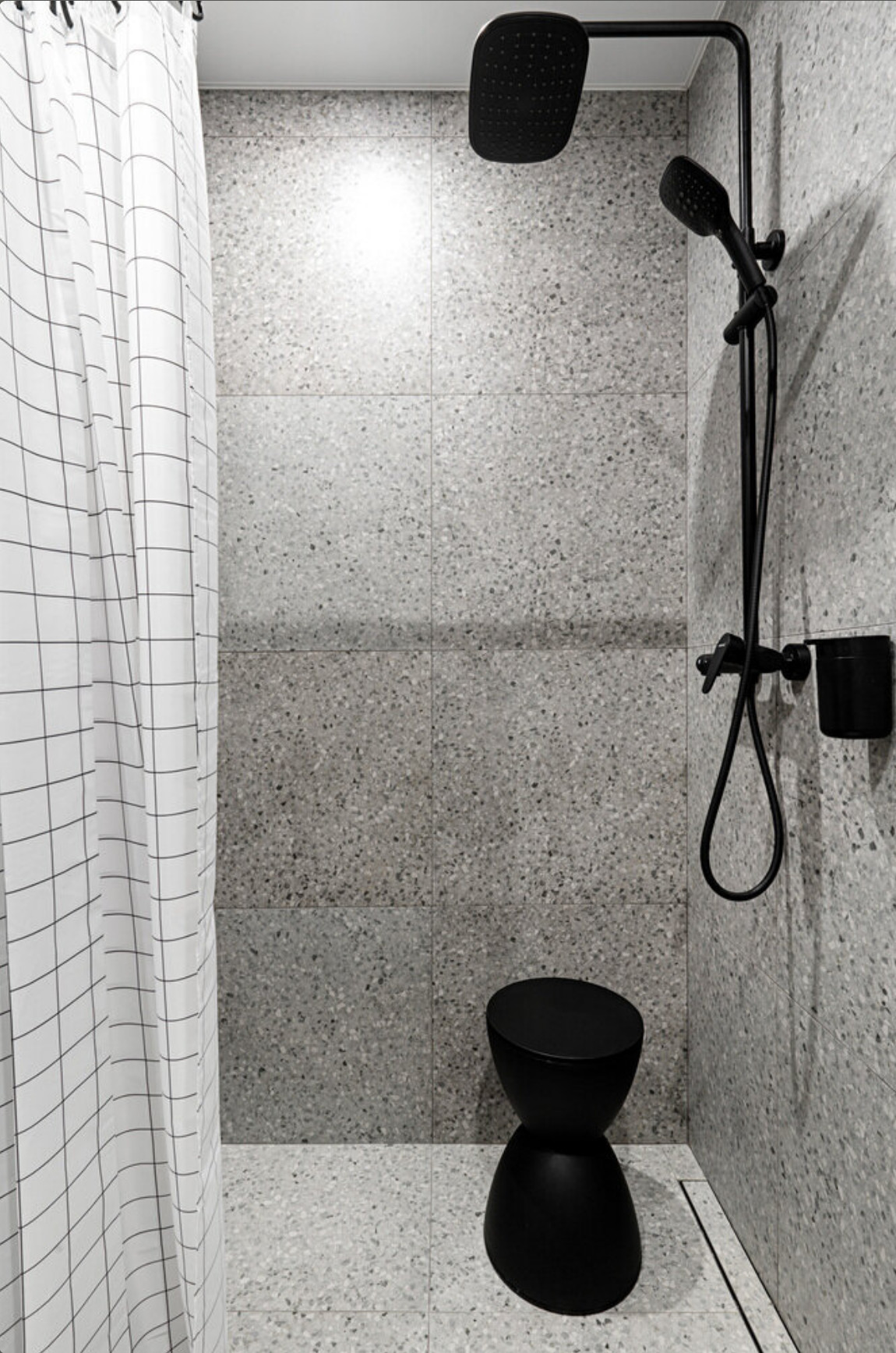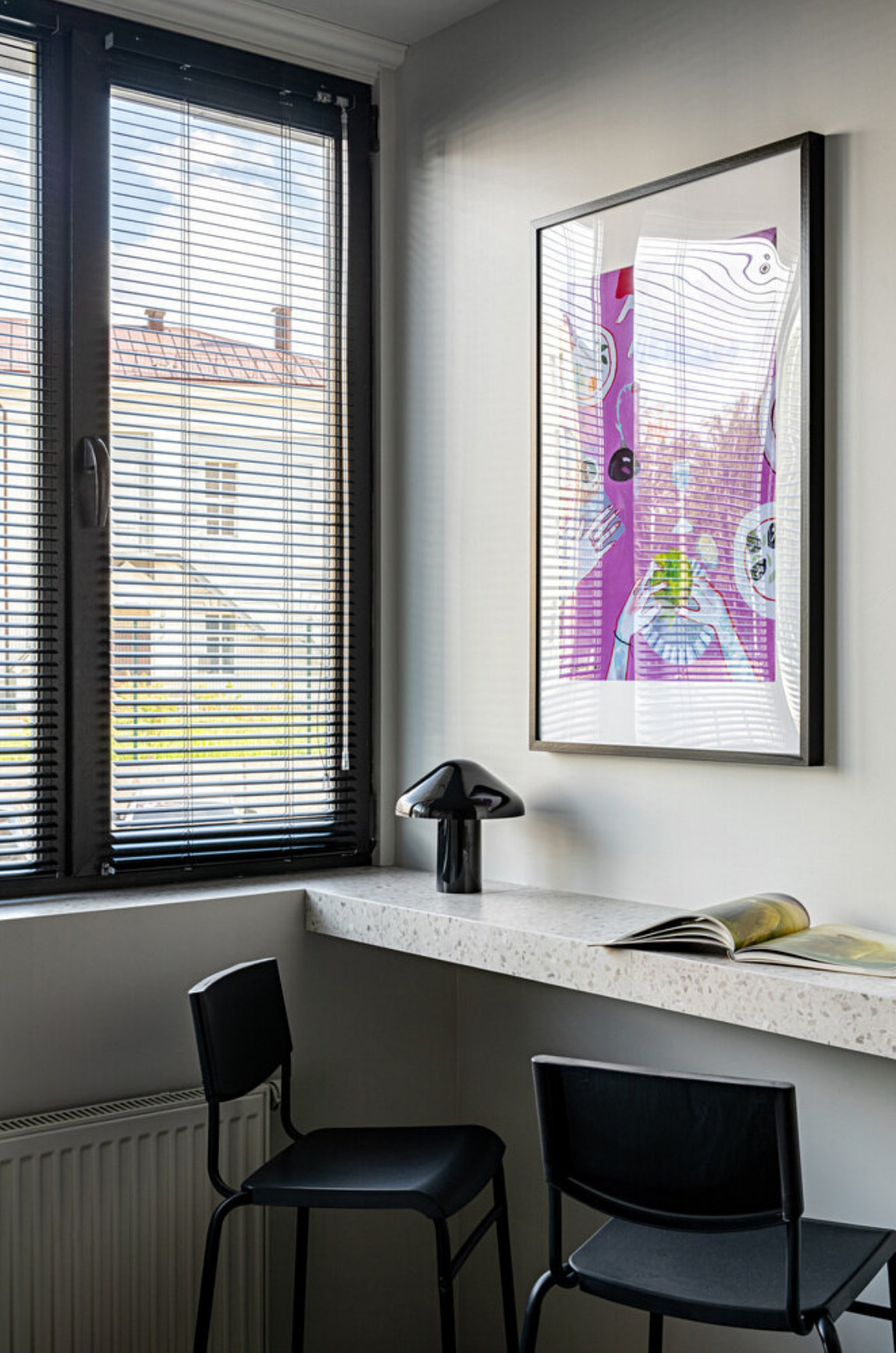 The linear kitchen is about one metre sixty long, yet it has everything you need for everyday life. The sink, hob, extractor hood, microwave and refrigerator fit effortlessly into this compact space. A coffee machine and a kettle find their natural place on the worktop. The original concrete walls have been painted, revealing a subtle texture. The terrazzo-patterned tiles add rhythm to the surfaces and bring real graphic personality. Most of the furniture comes from major retailers, combining efficiency with touches of colour. However, there are also more personal pieces, such as the two Swedish Skandiform chairs, which are over 20 years old and were discovered by Maryam. As a result, the layout of this functional 20m2 studio is unlike any other. Photo: Alexandre Burnatov