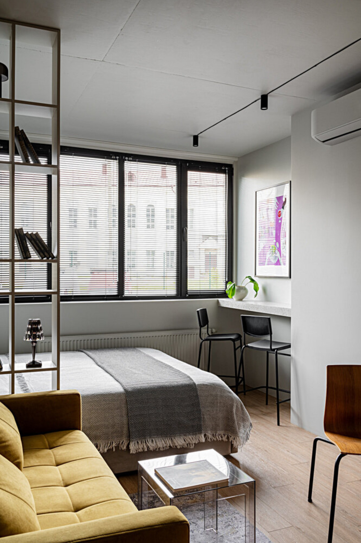 Il est intéressant de constater combien un petit studio peut devenir pratique et agréable à vivre si sa conception est bien réfléchie. Anton et Maryam, ses propriétaires se sont lancés dans l'aménagement d'un studio de 20m2 fonctionnel pensé pour la location meublée. Leur priorité était claire dès le départ, privilégier l’ergonomie tout en soignant chaque détail visuel et tout en restant dans un budget raisonnable. L’espace existant suggérait presque naturellement une organisation simple et particulièrement logique dès l’entrée. On découvre ainsi une zone d’accueil, une cuisine, un coin repas, puis un salon. La chambre et l’espace bureau prennent place plus loin, séparés par une étagère ouverte créant presque un deux-pièces.