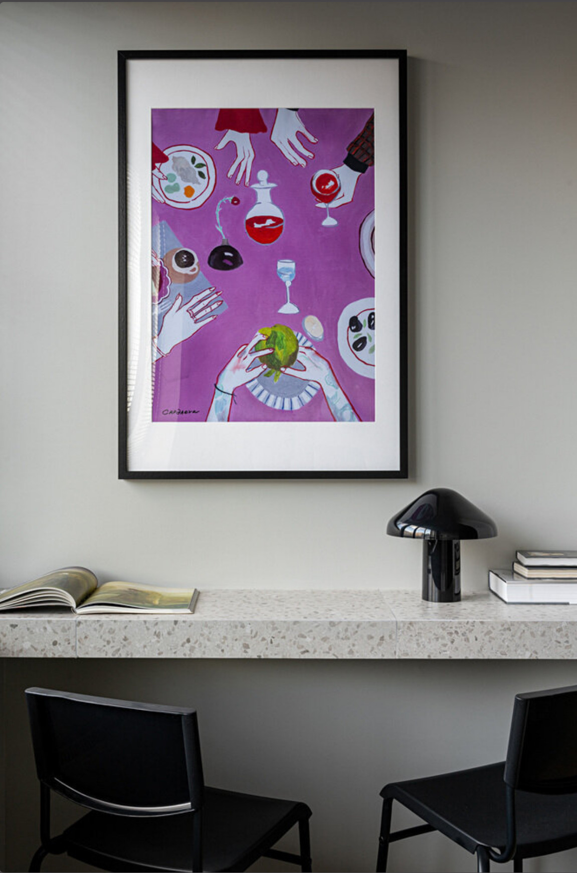 La cuisine linéaire mesure environ un mètre soixante, pourtant rien ne manque au quotidien. Évier, plaques, hotte, micro-ondes et réfrigérateur s’intègrent sans effort dans cet ensemble compact. Sur le plan de travail, une machine à café et une bouilloire trouvent naturellement leur place. Les murs initialement en béton ont été peints, laissant apparaître un relief discret. Le carrelage au motif terrazzo rythme les surfaces et apporte une vraie personnalité graphique. Le mobilier provient majoritairement de grandes enseignes, mêlant efficacité et touches colorées.Mais on y trouve toutefois des pièces plus personnelles, comme les deux chaises suédoises Skandiform, qui ont plus de 20 ans découvertes par Maryam. Ainsi l'aménagement de ce studio de 20m2 fonctionnel, ne ressemble pas tout à fait à un autre. Photo : Alexandre Burnatov