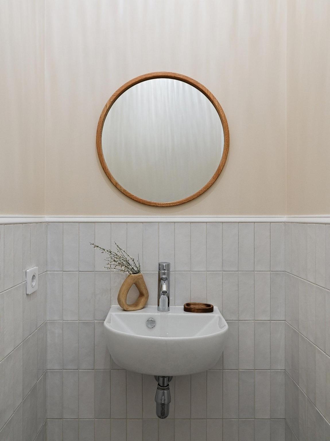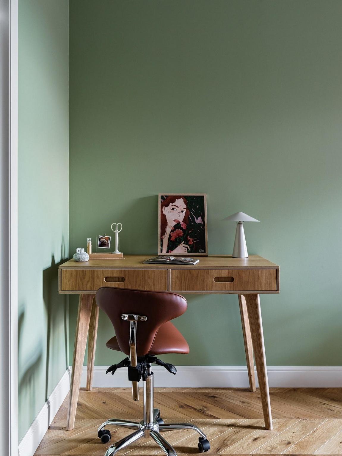 The layout has been subtly redesigned to optimise storage, circulation and everyday use. The compact kitchen is fully equipped, while the white and oak furniture is timeless. Greens and beiges dominate the décor, accompanied by high mouldings and graphic tiled flooring. Restored armchairs inspired by IKEA catalogues from the 1960s complete the living room's décor. The colour palette is moderate, natural, welcoming and chosen from the Little Greene brand. This 78m2 vintage-style flat now reflects the tastes of its young owner. Photo: Maxim Maximov. Stylist: Natalia Oreshkova