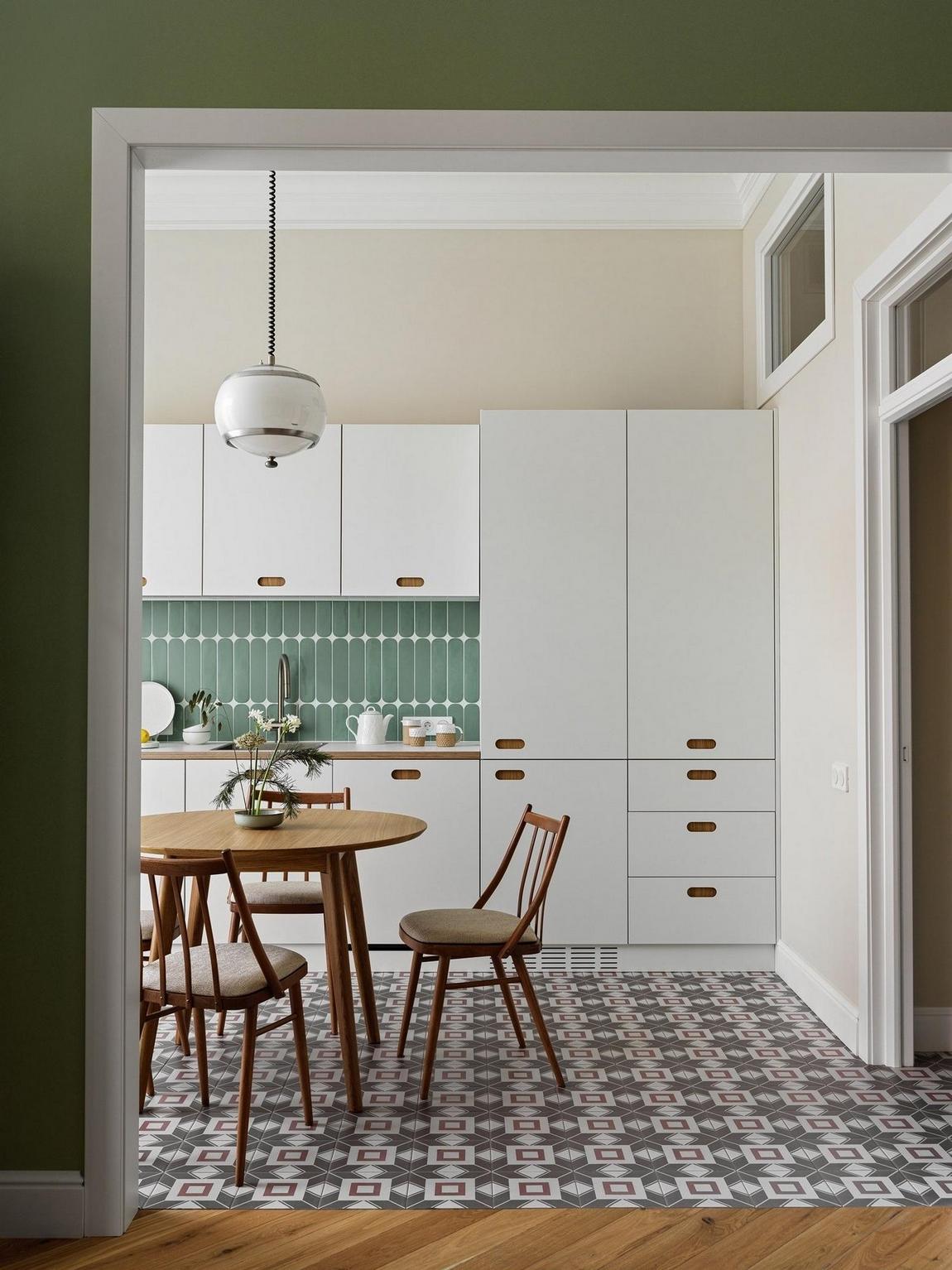Le plan a évolué pour optimiser les rangements, la circulation et les usages quotidiens avec subtilité. La cuisine compacte intègre des équipements complets tandis que le mobilier blanc et chêne est un intemporel. Verts et beiges dominent la décoration accompagnés de moulures hautes et d'un sol graphique en carrelage. Les fauteuils restaurés inspirés par les catalogues IKEA des années 60 complètent l'aménagement du salon. La palette de couleurs est modérée, naturelle, accueillante et choisie dans la marque Little Greene. Cet appartement de 78m2 au style vintage correspond désormais aux goûts de sa jeune propriétaire. Photo : Maxim Maximov. Styliste : Natalia Oreshkova