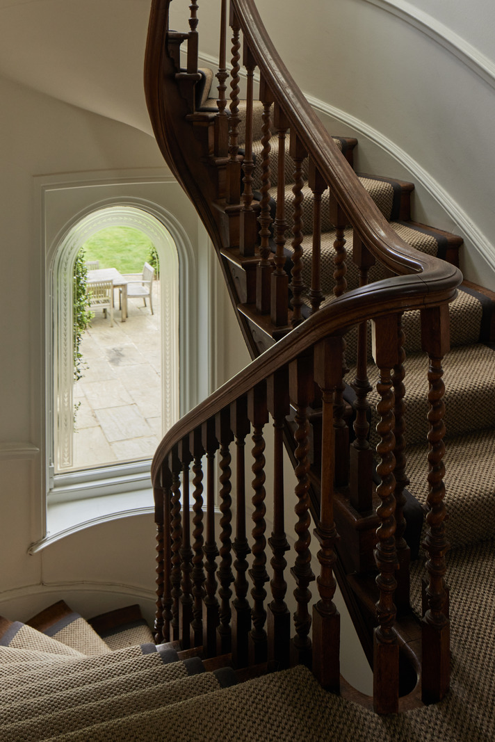 Its south-facing living room connects the glass orangery to the lush back garden. The dining room opens onto the terrace, ideal for al fresco dining. The bespoke Martin Moore kitchen combines granite, a central island and a superb navy blue enamelled Aga cooker. An oak staircase leads to the upper floors, lit by a glass dome. The bedrooms feature fireplaces and bathrooms that blend tradition and modernity. This Surrey residence perfectly exemplifies traditional English style, combining historical heritage with contemporary comfort.