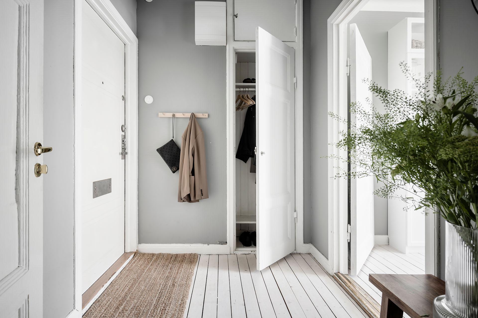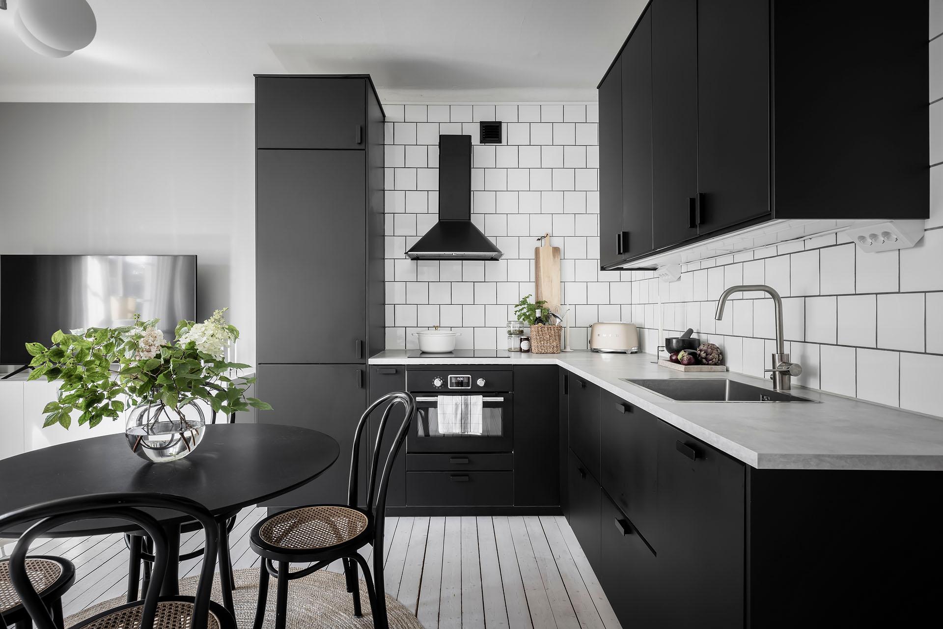 This 40m2 one-bedroom apartment has been renovated in a monochrome designer style. It cleverly combines preserved features with a contemporary look. Located in a 1927 building in Gothenburg, it blends architectural heritage with modern comfort. The practical entrance hall leads to the large living room with open-plan kitchen. Light-coloured parquet flooring throughout the apartment amplifies the light coming in from the large windows.