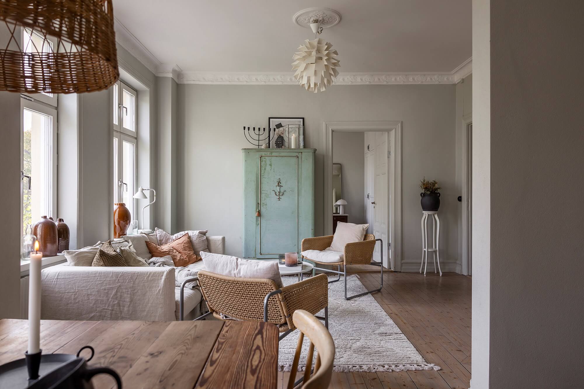 La chambre disparaît derrière un rideau, si on le souhaite. Le mobilier privilégie la convivialité, notamment autour d’une grande table centrale accueillant dîners et discussions. La cuisine IKEA vert foncé dialogue avec des murs rose poudré, apportant contraste et douceur. La propriétaire collabore étroitement avec de jeunes artistes, transformant régulièrement l’appartement en lieu d’exposition. Les murs servent d’écrin à une collection évolutive d'oeuvres. Le blanc a été volontairement évité, jugé trop neutre pour révéler les œuvres présentées. À la place, une combinaison de nuances soutient chaque pièce exposée, sans jamais la dominer. Des objets vintage renforcent cette identité singulière, comme une commode chinée en ligne, des vases anciens, une lampe de table graphique. Une statuette en bois dénichée sur un marché aux puces belge ajoute une touche unique à ce studio de 42m2. Photo: Olga Melekestseva