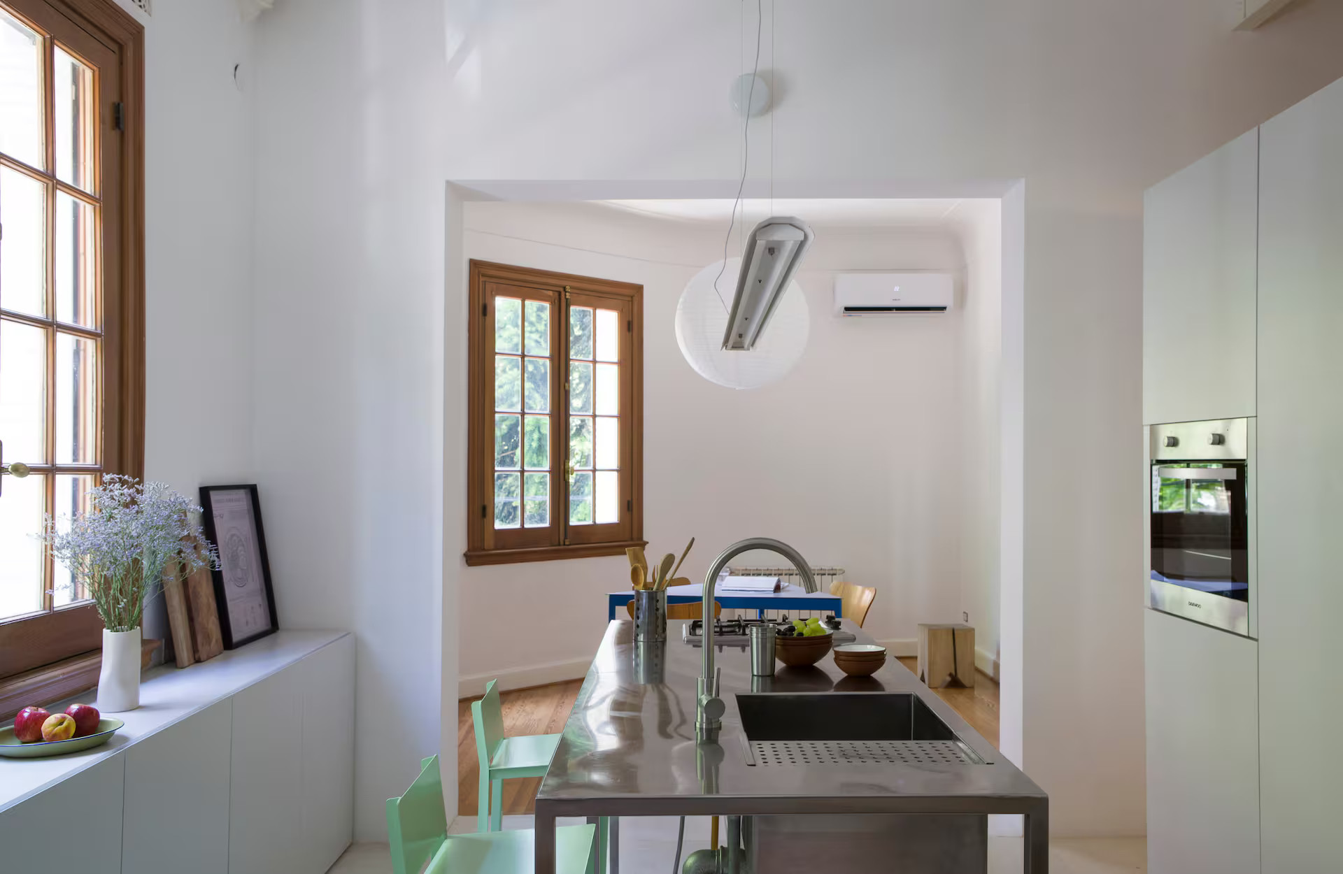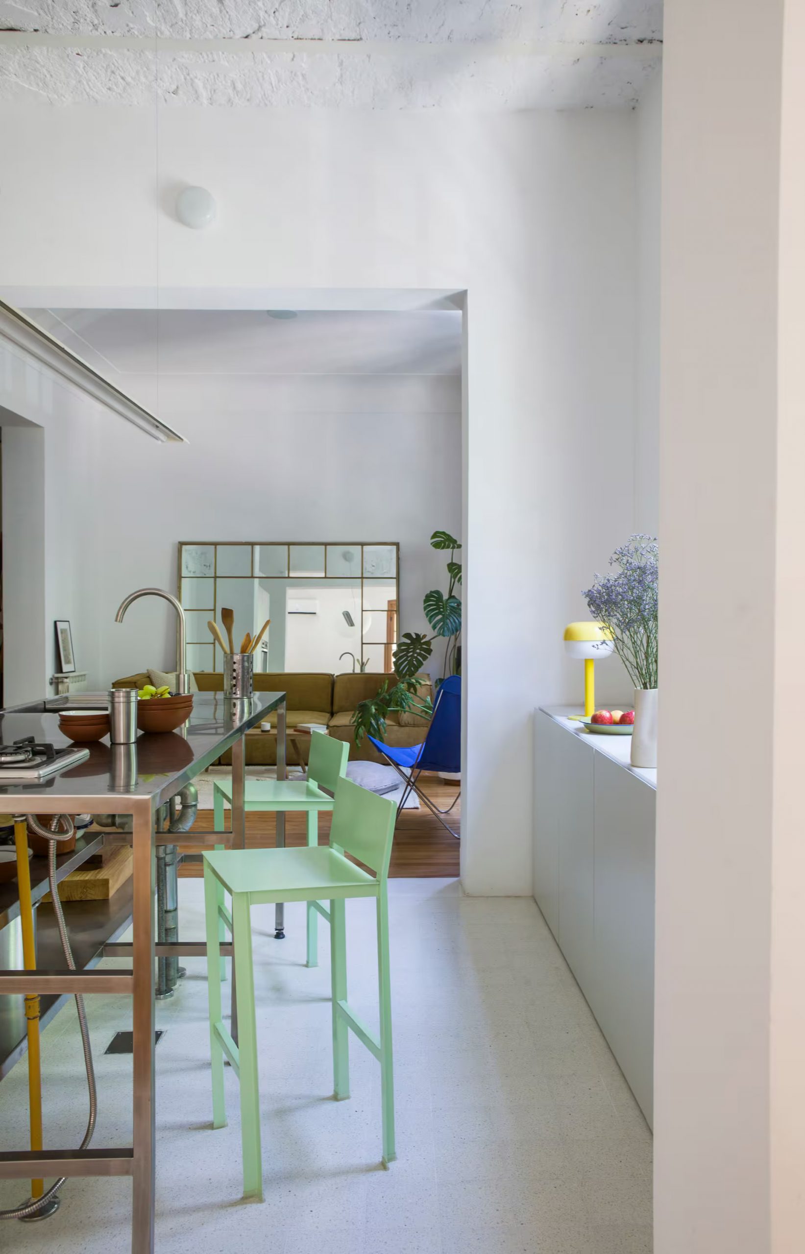 This project was carried out with Darío Graschinsky, her partner at the Darío y Joaquina studio. Together, they imagined a practical and pleasant place for everyday living. The circulation is clear, the perspectives are open, and the furniture comes from Argentine and international designers. Joaquina now divides her time between Buenos Aires and Berlin, where her architect partner lives. The flat therefore had to work equally well for one or two people, while regularly welcoming friends. This renovation in Buenos Aires began with a reorganisation of the bathrooms, with the addition of a separate toilet. The heart of the project is the integration of the living room, kitchen and dining room. The kitchen retains its layout but gains in openness and generosity. A stainless steel island becomes the visual and functional focal point. Photo: Santiago Ciu