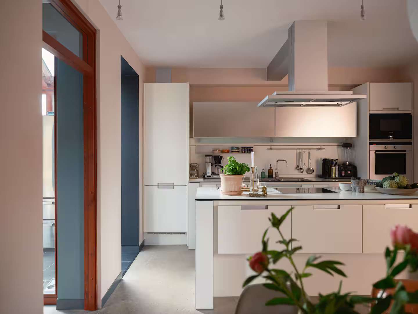 Originally designed as part of the Swedish sustainable housing movement, this modernist Packhus townhouse features a unique layout. It is located in the Bo01 district of Malmö. Its structure plays with two vertical volumes connected by communal spaces. The renovation carried out in 2021 transformed the original spirit without betraying it, rounding off the lines and warming up the whole. Its interior spaces alternate between full and empty, creating natural circulation and a feeling of intimacy. The blue walls of the living room bring out the colour of the comfortable Togo sofas.