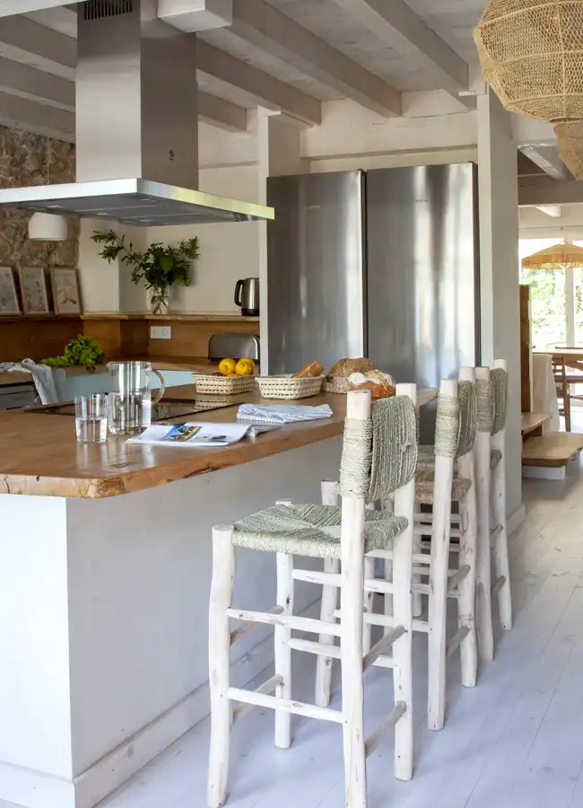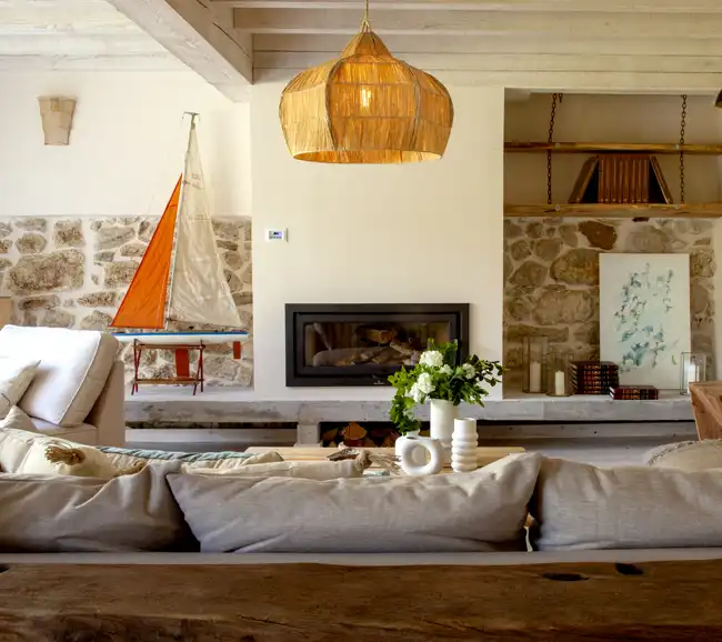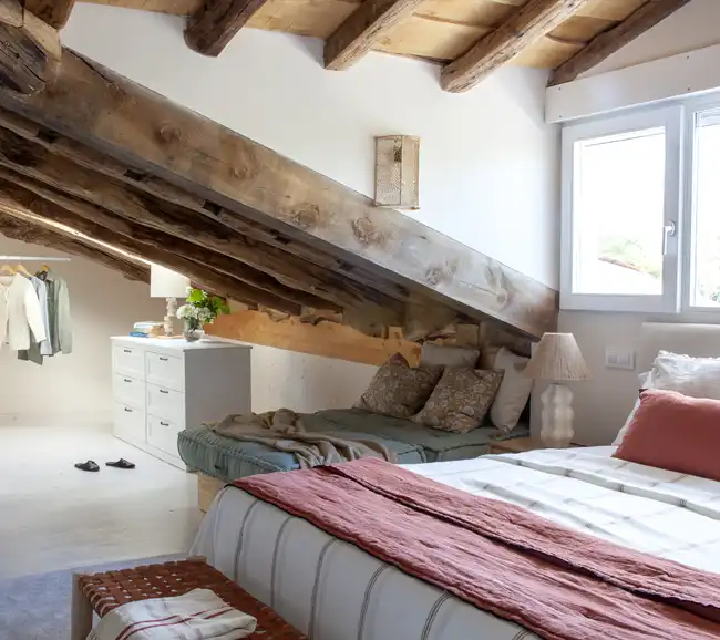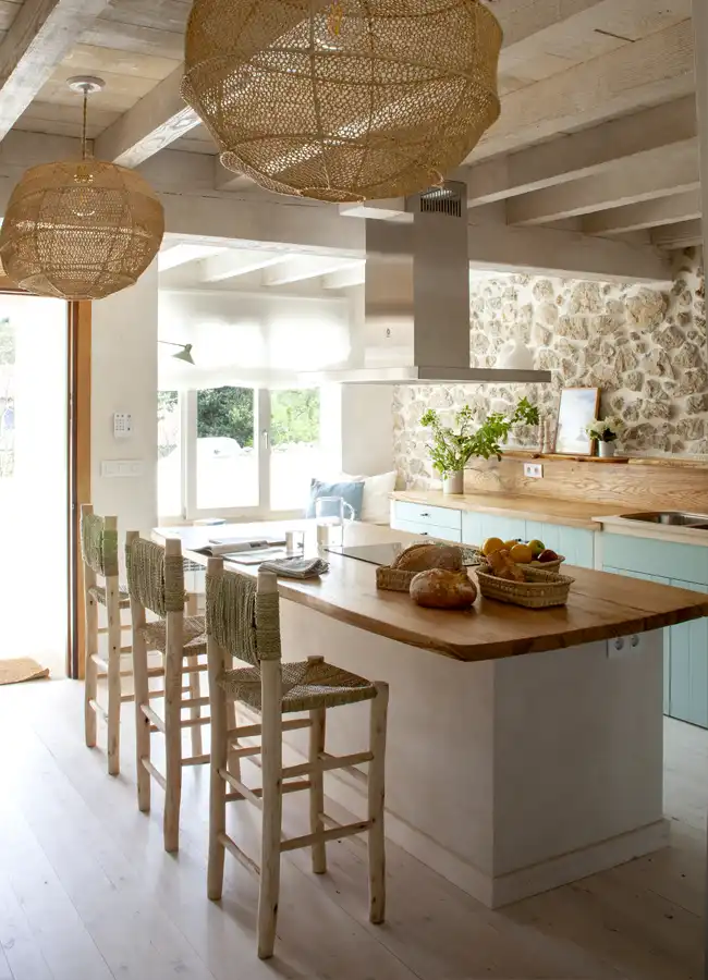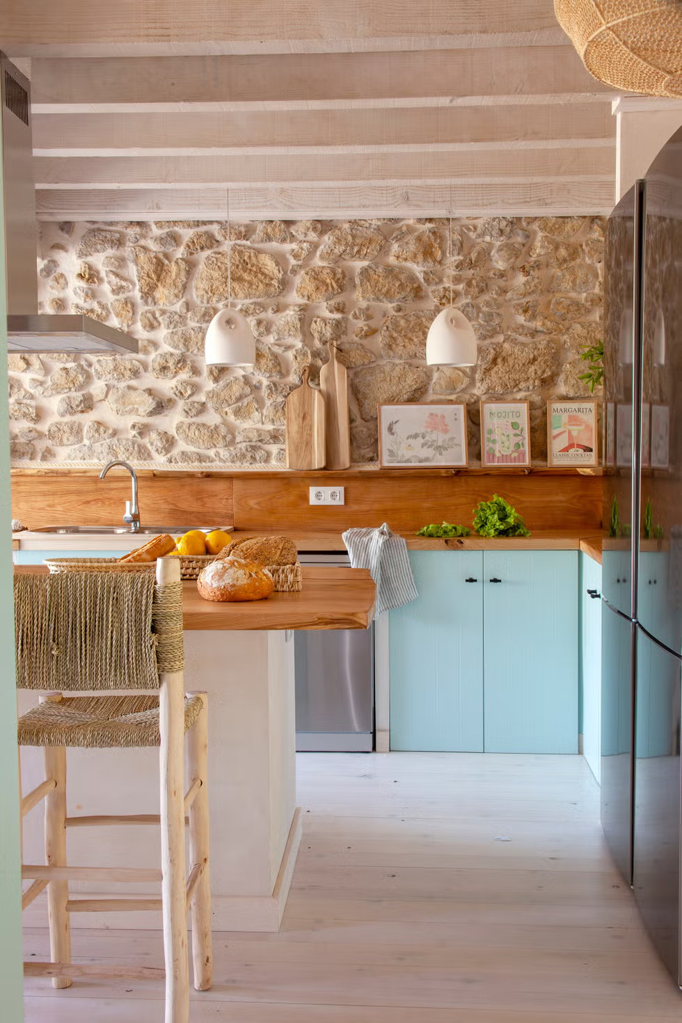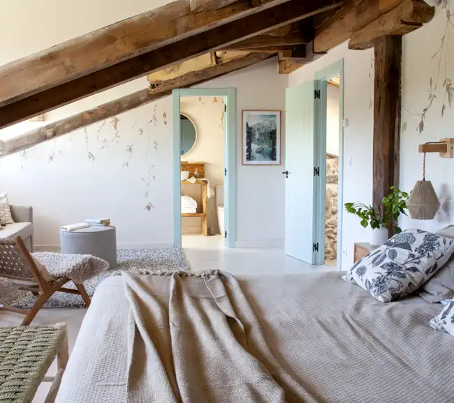 La rénovation a demandé des choix techniques précis et parfois audacieux pour révéler les volumes existants. Un ancien bloc a été supprimé afin d’agrandir le salon principal. De larges fenêtres ont remplacé les ouvertures d’origine pour faire entrer la lumière naturelle. Un ancien four à pain, découvert lors des travaux, a été conservé comme témoignage du passé. Les murs en pierres s'associent désormais avec le parquet, les fibres naturelles et les poutres récupérées en chêne. La cuisine ouverte, aux tons d’aigue-marine, évoque la mer voisine et accueille un îlot central convivial. À l’étage, les chambres mansardées ont un charme intemporel avec leurs poutres apparentes.