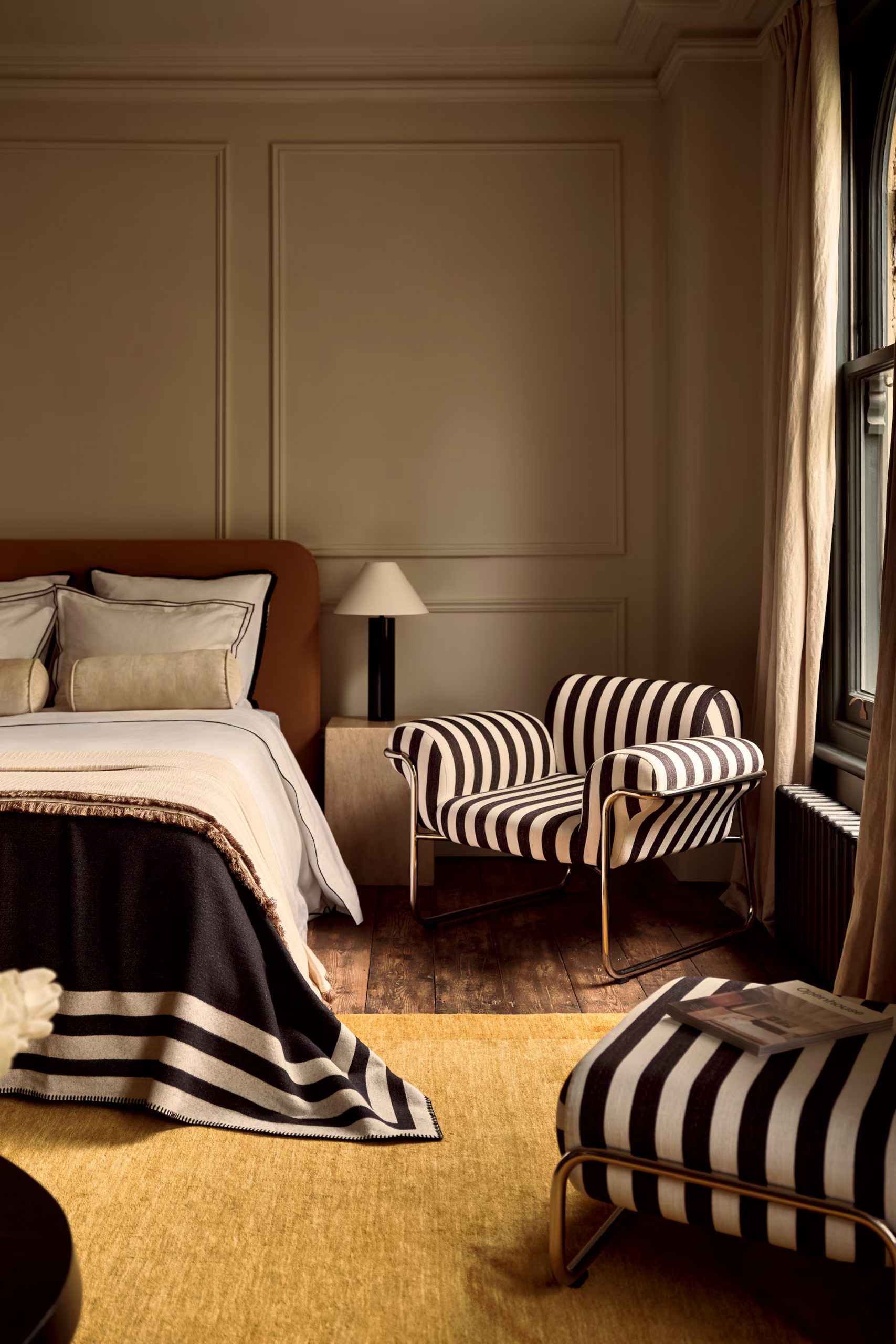 Le brun s’impose comme l’une des teintes fortes de l’année. Utilisé avec parcimonie, il apporte de la profondeur et une sensation de stabilité. Les bruns chocolat, café ou biscuit fonctionnent bien en tête de lit ou sur un mur unique. Ils se marient facilement avec des verts doux ou des accents plus clairs. On peut choisir de l'utiliser aussi bien sur les murs, mais pour éviter un aspect trop pesant, également pour le linge de lit.