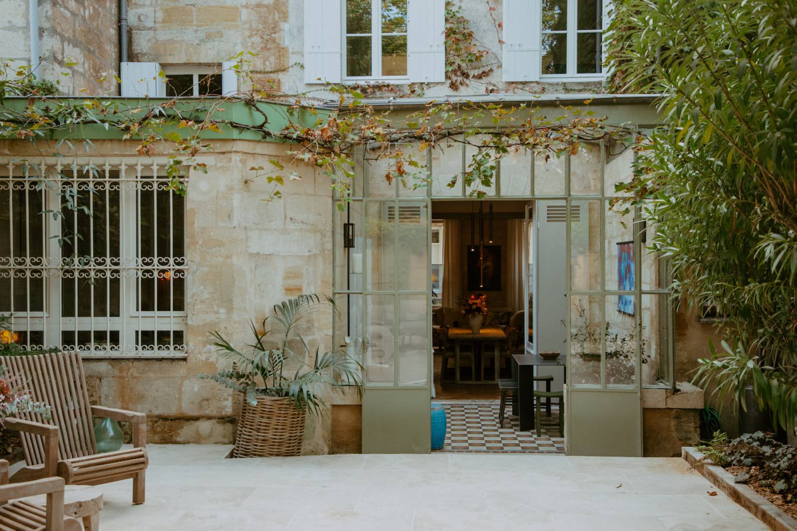 The kitchen has clean lines with white doors and a composite worktop. It is a windowless room but remains bright. This is because the bright bedroom next door connects to it behind restored antique glass doors. Located on the courtyard side, it enjoys a calm and restful environment. Two deep south-facing windows generously illuminate both the bedroom and the kitchen, which has indirect light. The bathroom is elegantly designed with simple grey walls. The overall effect is cosy and welcoming.