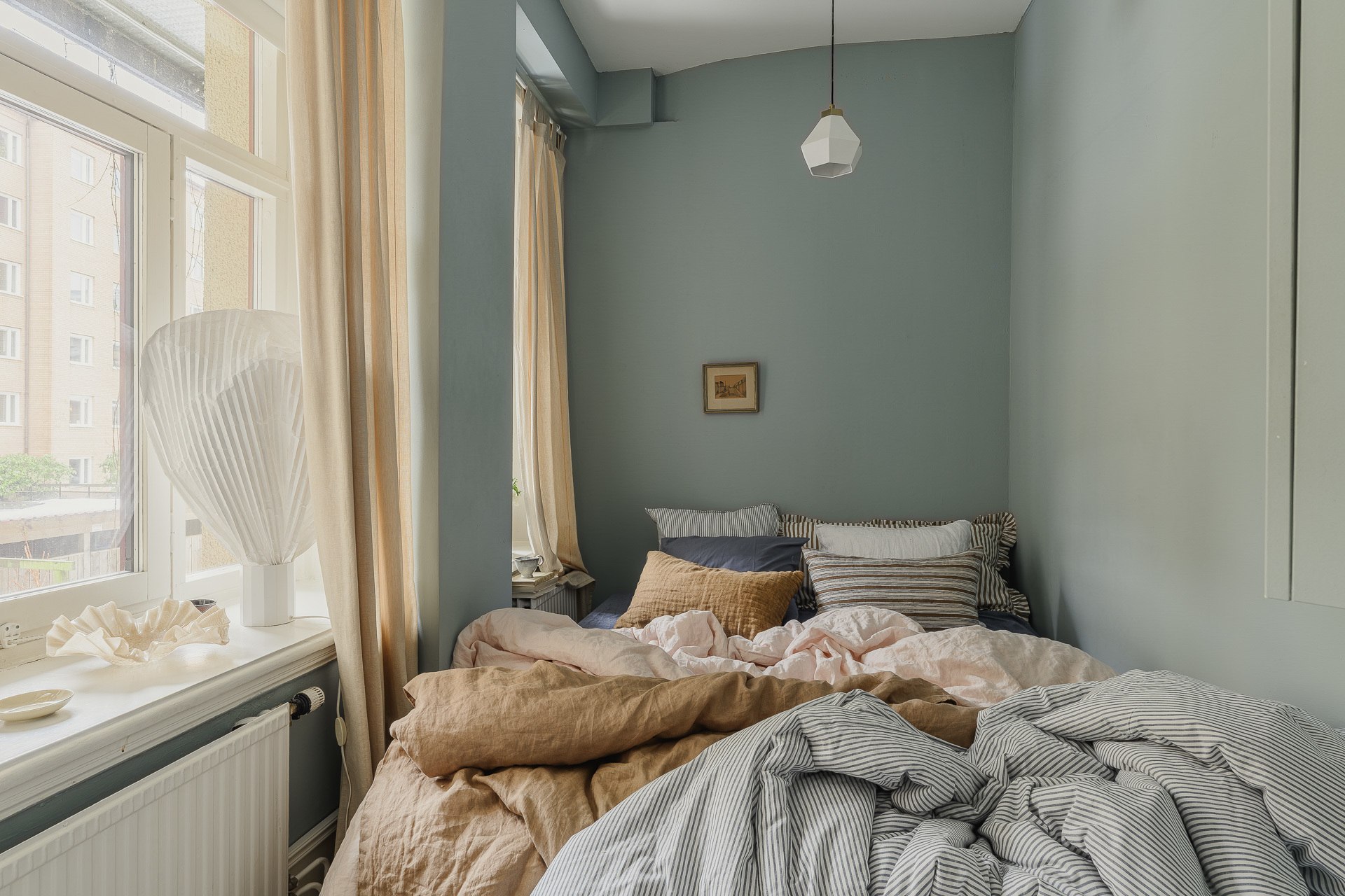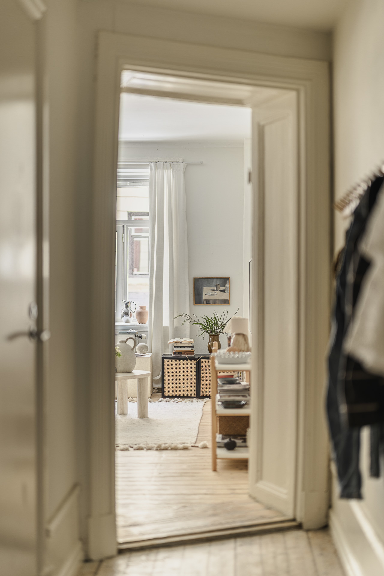 Located in a building dating back to 1904, this 52m2 old apartment cleverly combines heritage with contemporary amenities. Situated in Gothenburg, this one-bedroom apartment is housed in a carefully preserved old building. The high mouldings, old parquet flooring and ceiling rosettes immediately set the tone as you enter. Its layout has been redesigned to offer fluid volumes despite the limited surface area. The well-oriented windows provide brightness that enhances the perception of space. The living room has a large window on the short side. Its old features interact with the contemporary Scandinavian décor. The overall effect is warm, functional and easy to live with on a daily basis. Once a large studio, the kitchen has been divided to create a small bedroom, making this an apartment with an unusual layout.