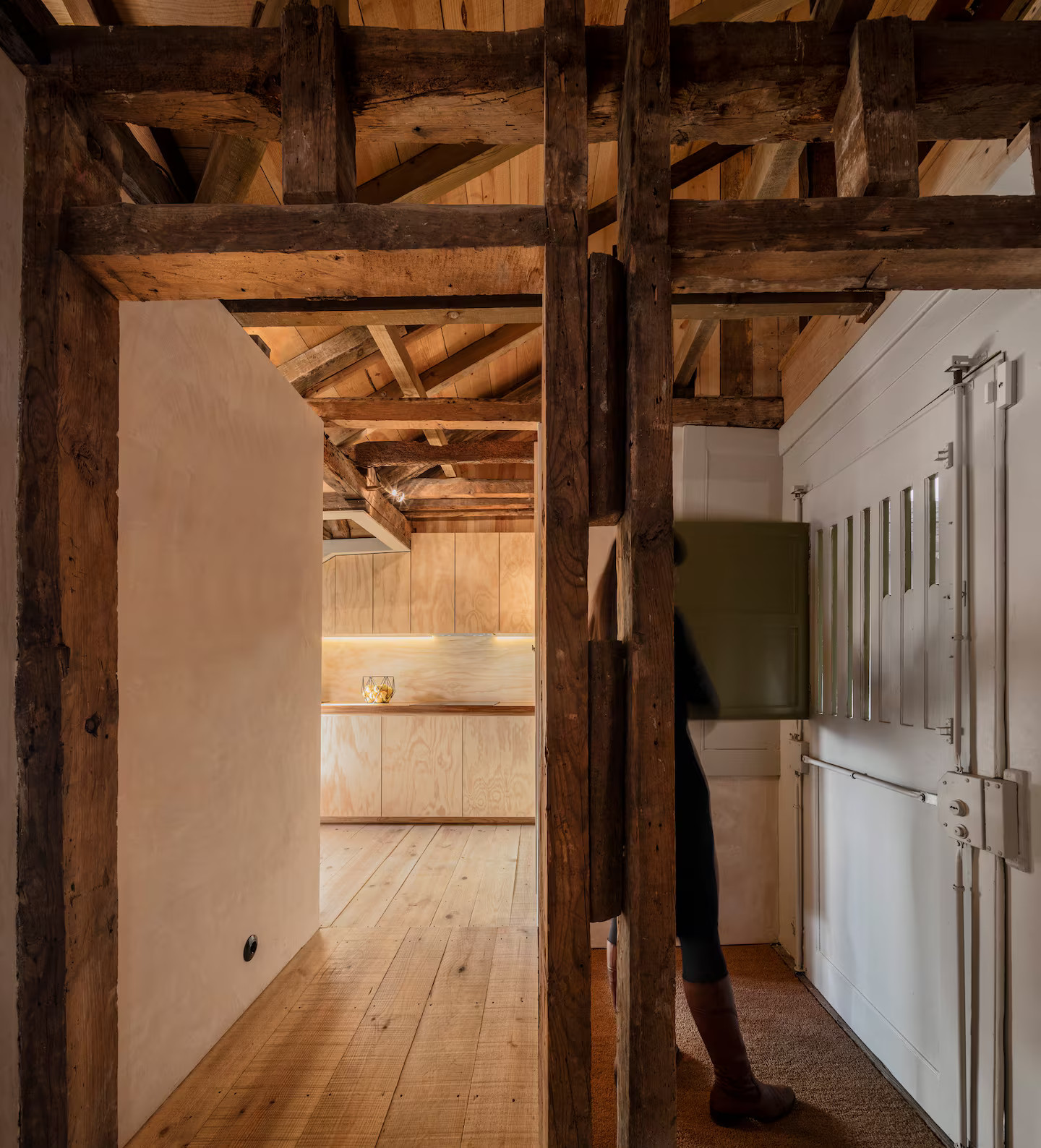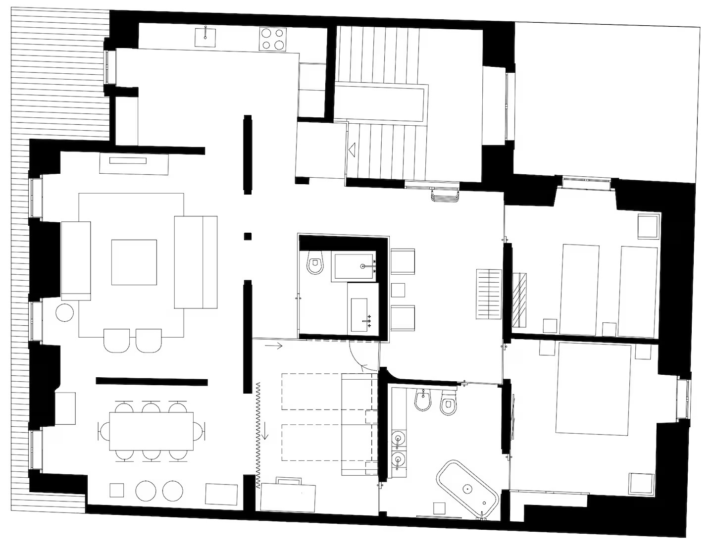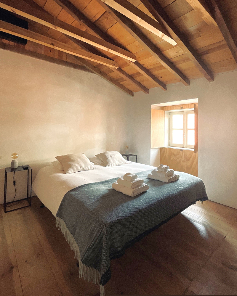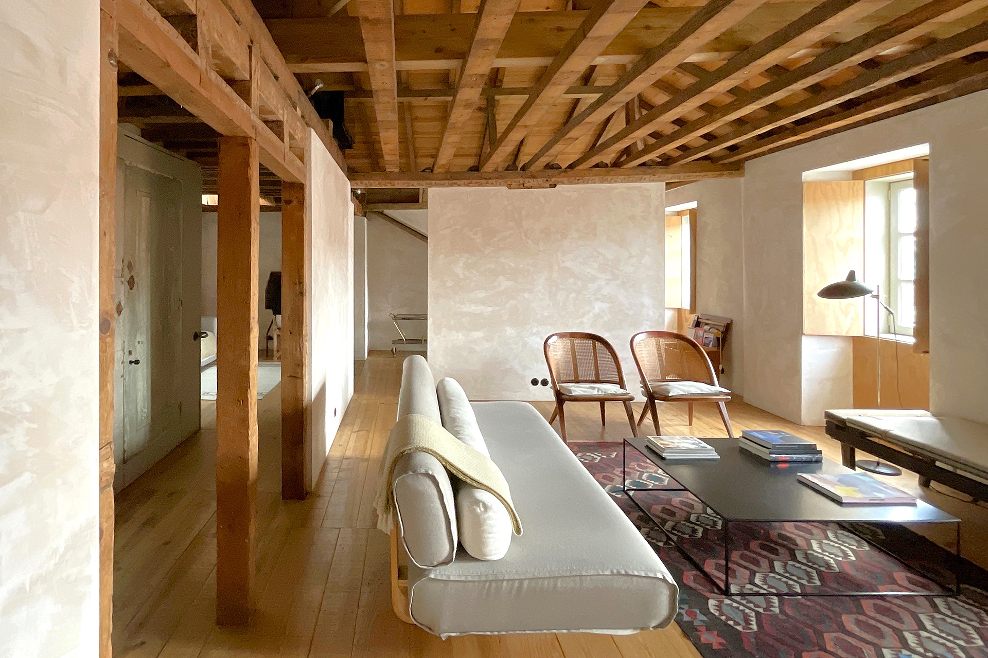 The custom-designed furniture matches the exposed framework. Local pine plywood and cork add softness. The result is an interior rooted in its era. Its volumes under the roof highlight the preserved exposed beams. The original wooden doors also recall the age of the flat. Its living space functions as a lived-in gallery, punctuated by art and lighting. The high windows offer circular views over the rooftops of Baixa-Chiado and Castelo.