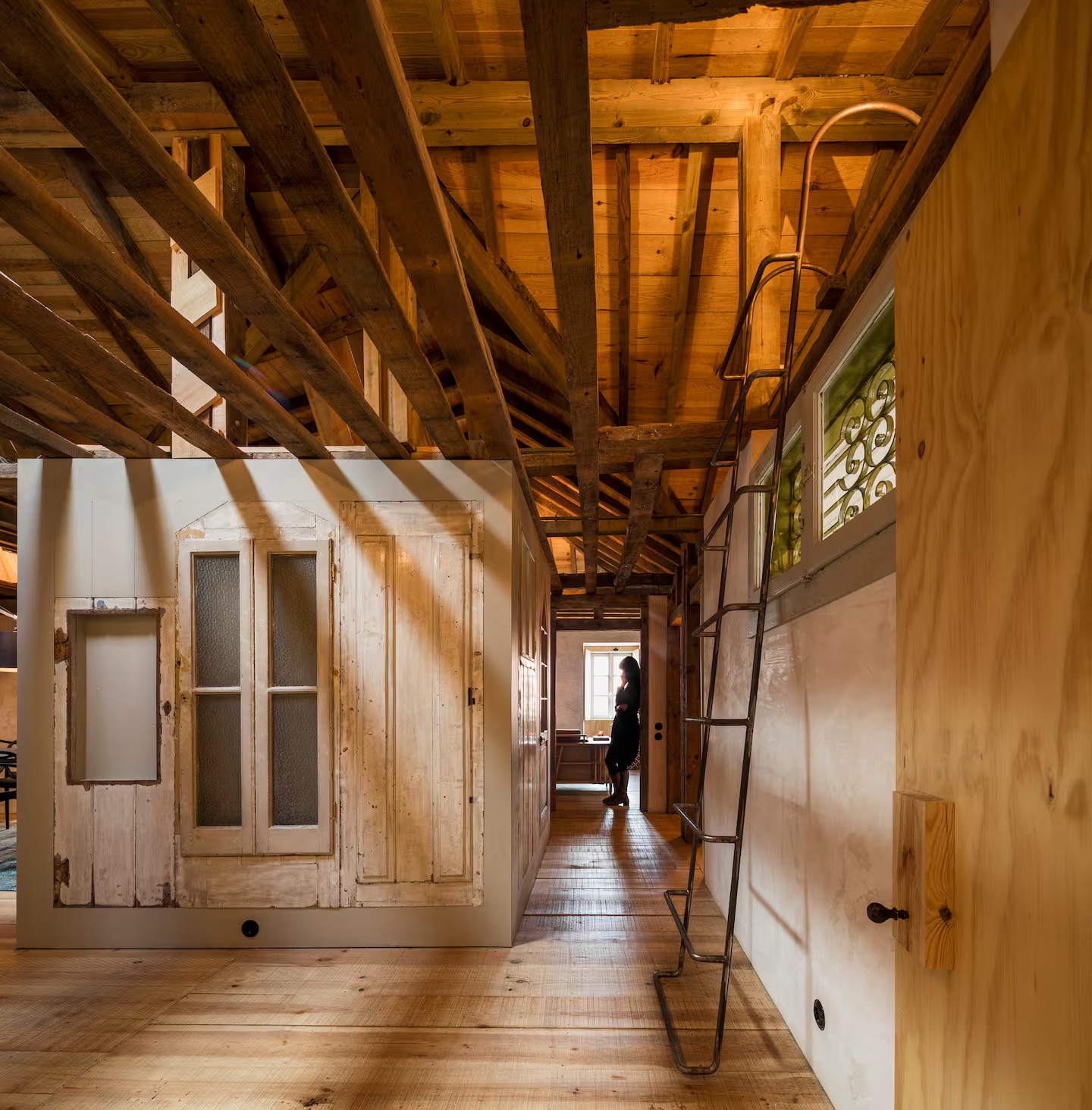 Les meubles dessinés sur mesure s'accordent avec la charpente apparente. Le contreplaqué de pin local et le liège apportent de la douceur. L’ensemble donne un intérieur ancré dans son époque. Les volumes sous toiture mettent en valeur les poutres apparentes conservées. Les portes en bois d’origine rappellent également l'âge de l'appartement. L’espace de vie fonctionne comme une galerie habitée, rythmée par l’art et l’éclairage. Les fenêtres en hauteur ouvrent des vues circulaires sur les toits de Baixa-Chiado et Castelo.