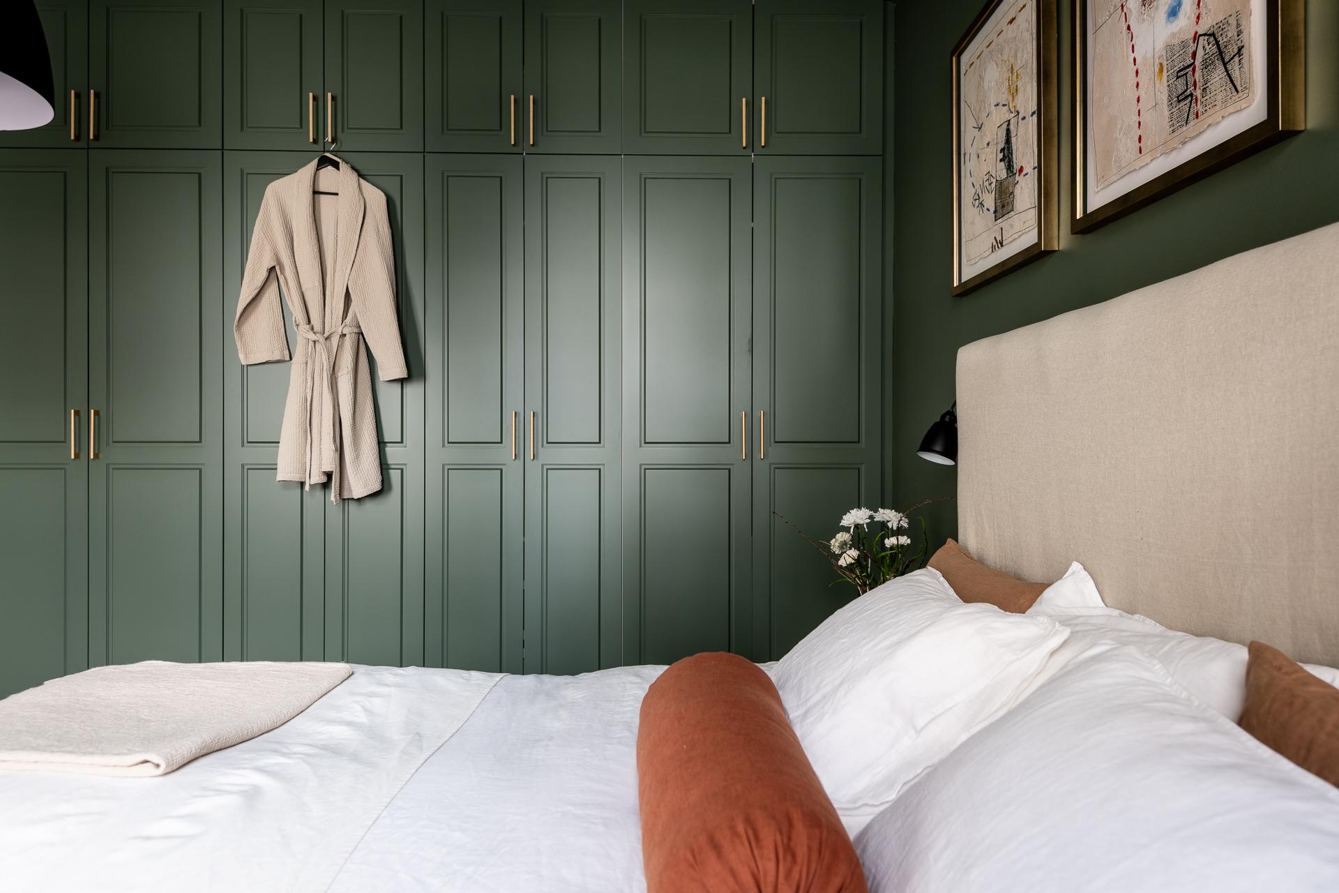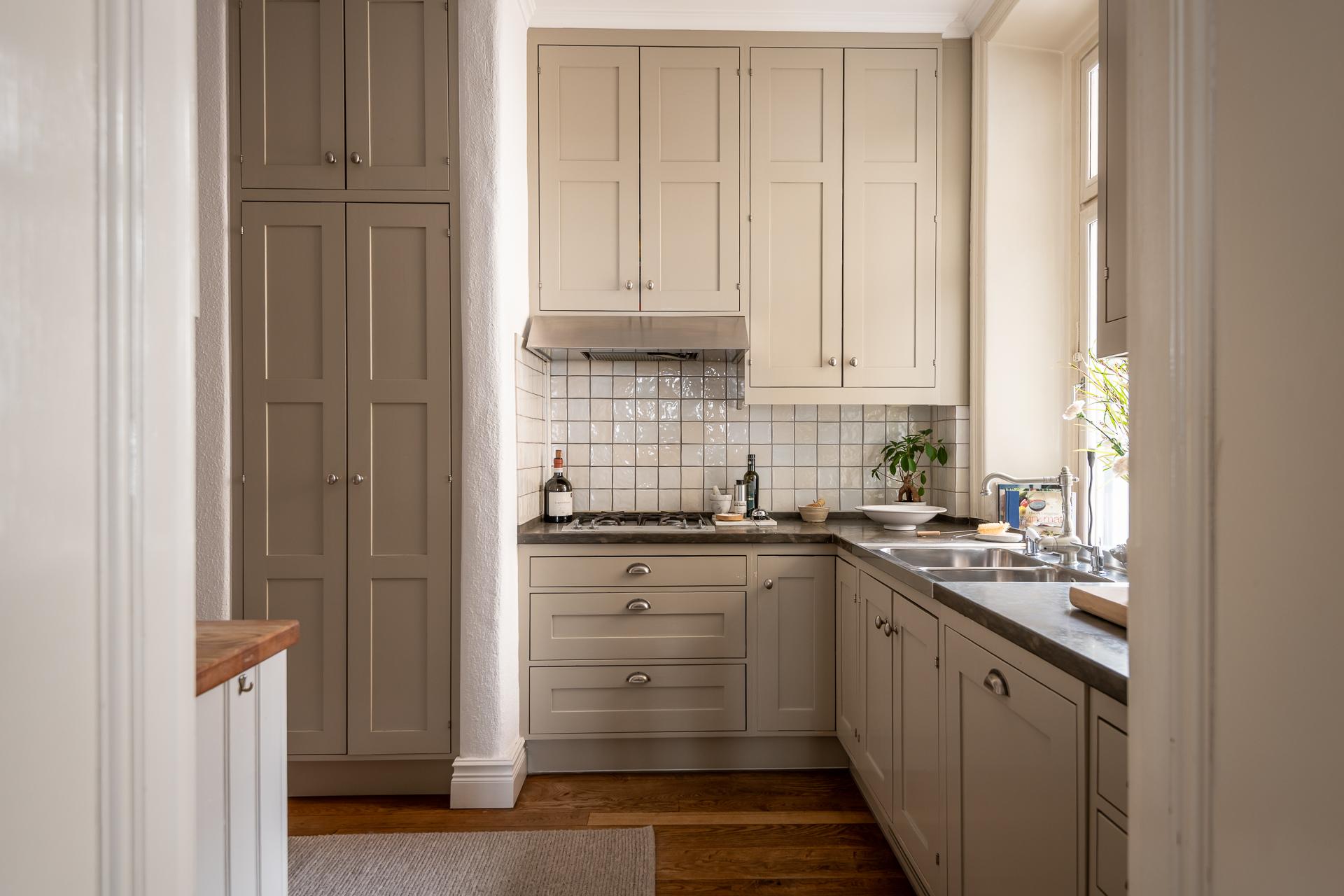 Its living room combines beige walls, light parquet flooring and a fireplace with a contemporary yet classic décor. Leather Chesterfield sofas add a touch of comfort. A large adjoining bedroom opens through double doors and is decorated in a deep green (NCS S 6010-G30Y). Its Lidhult kitchen in a light beige tone has a stone worktop and grey tiled splashback. The adjoining dining room has retained its remarkable parquet flooring and dark grey painted walls, giving it great character. The south-facing balcony extends the flat towards the quiet inner courtyard. A second bedroom, with sand-coloured walls, also benefits from this tranquillity. Two superb bathrooms complete this classic and chic flat.