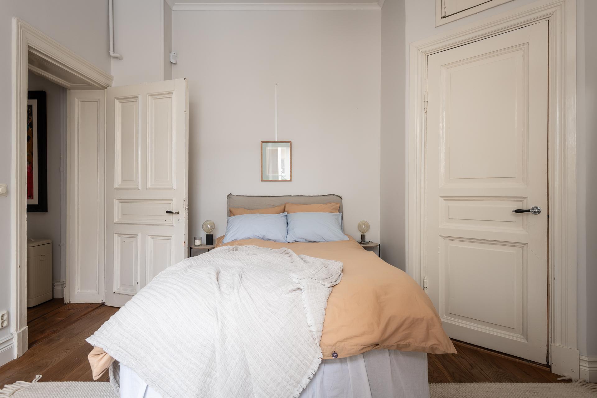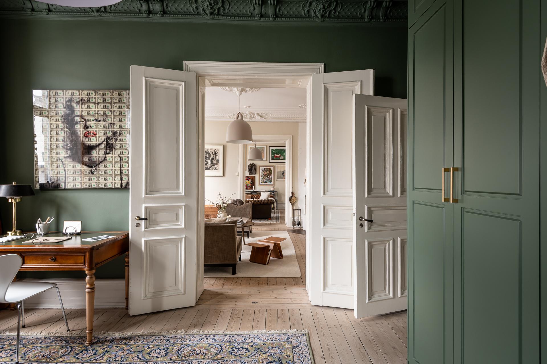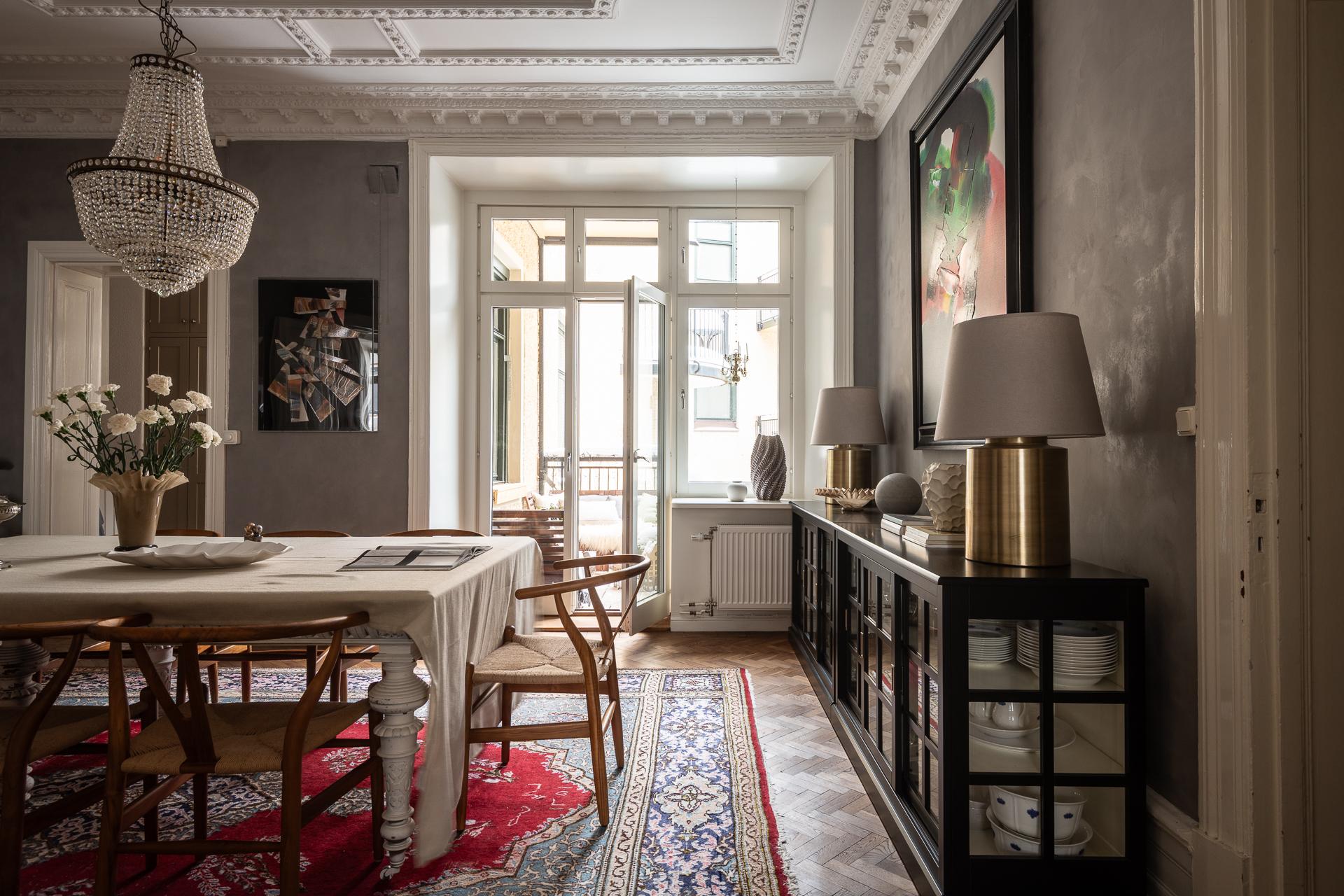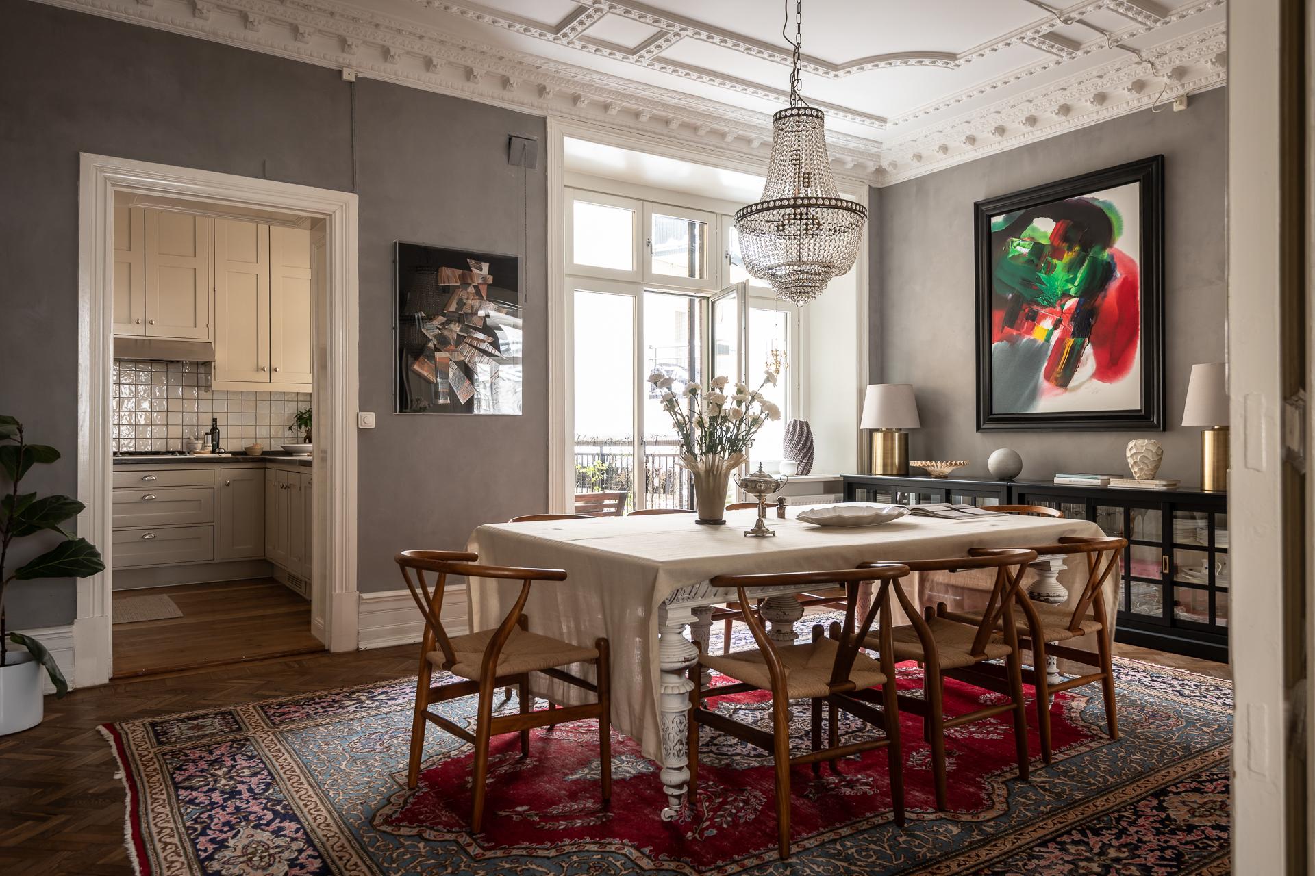 Located in an old building dating from 1893, this six-room apartment perfectly blends heritage and contemporary décor. This renovated 158m2 apartment is located in Stockholm. Its layout makes optimal use of every square metre with no wasted space, as there are no corridors and the rooms open onto each other. The ceiling height reaches nearly 3.20 metres, enhancing the sense of space. Its original floors, mouldings, stucco and double doors tell the story of the place. Light flows freely through the large east- and west-facing windows. The adjoining rooms reinforce the feeling of continuous space.