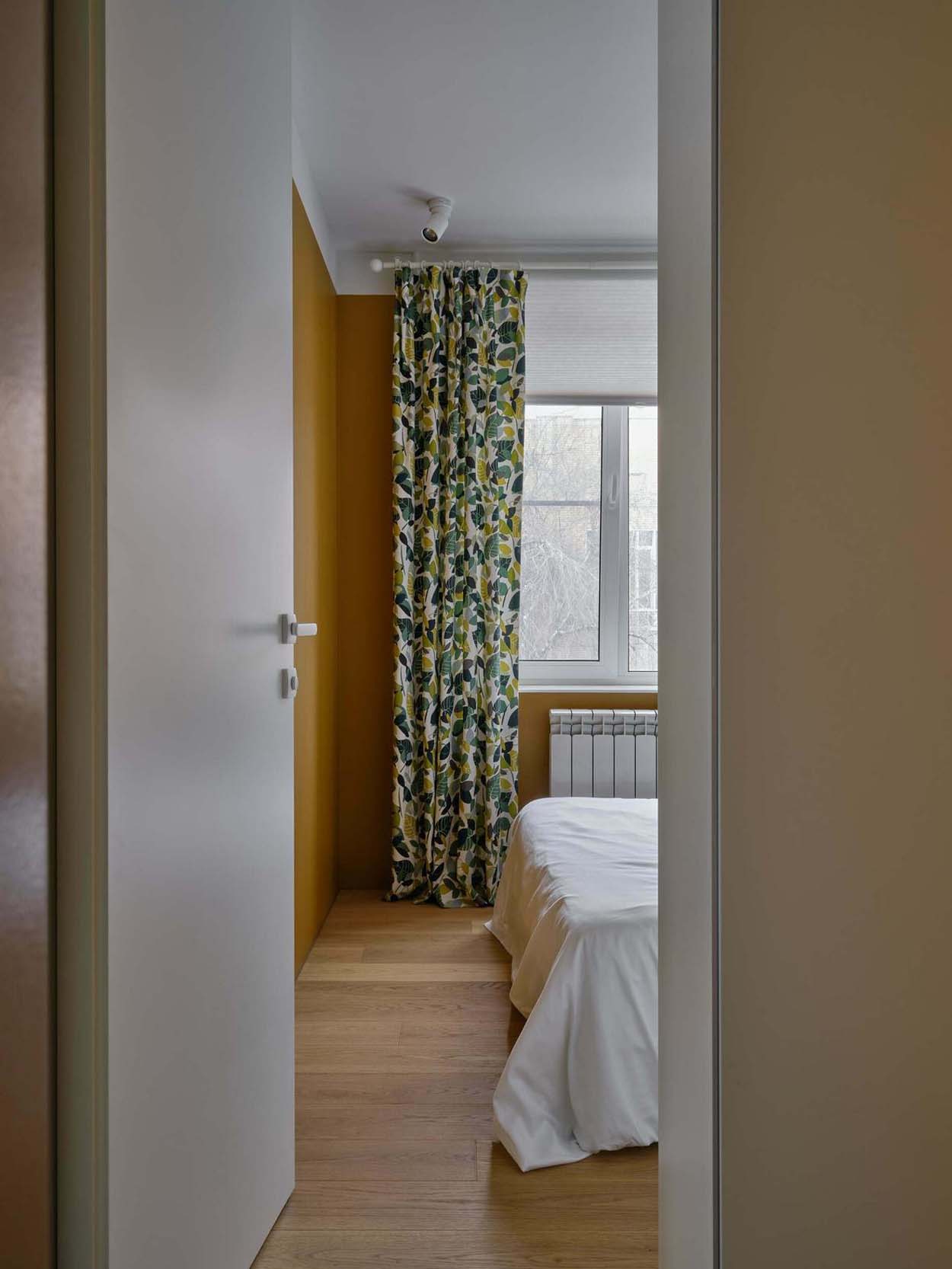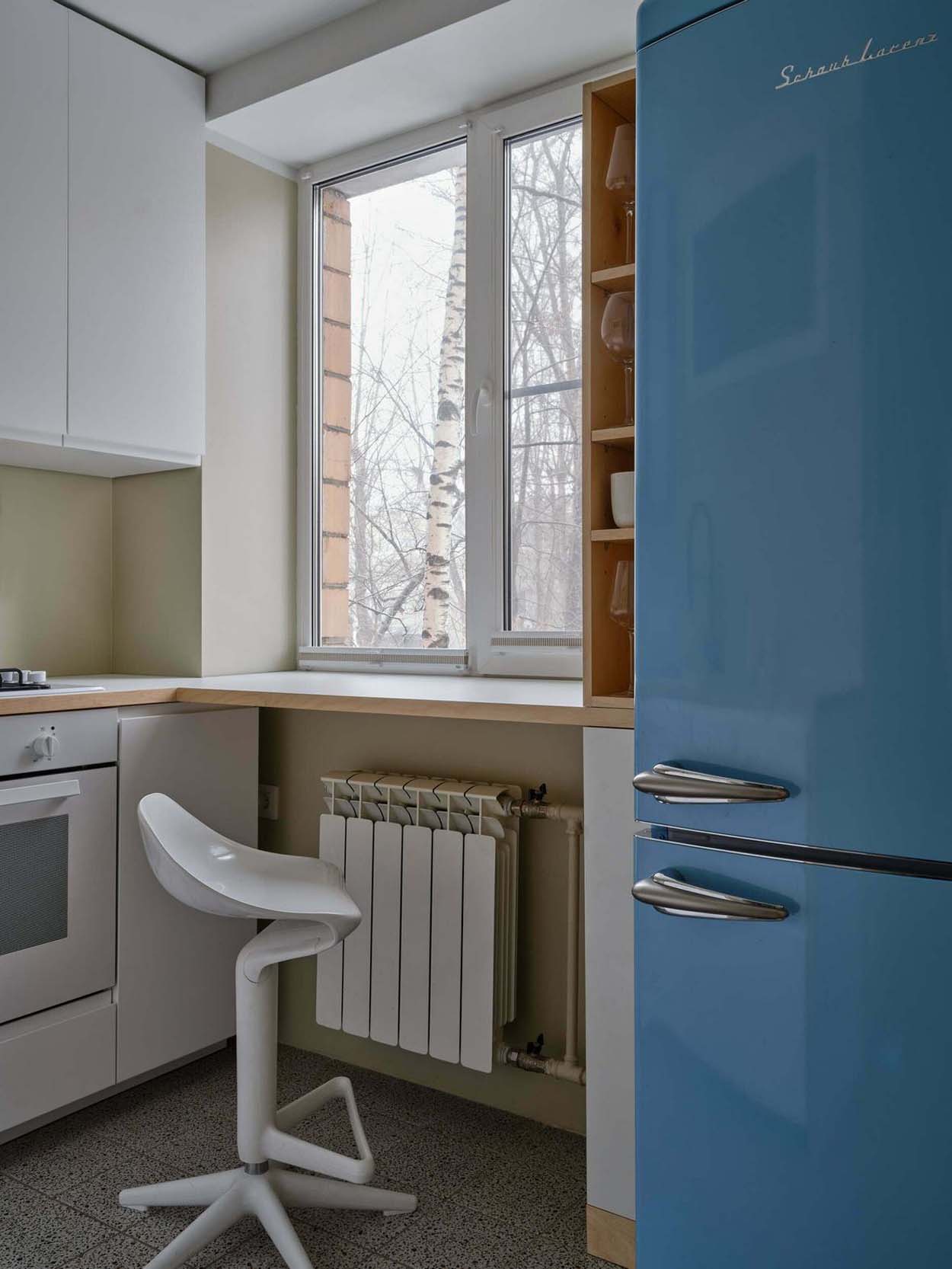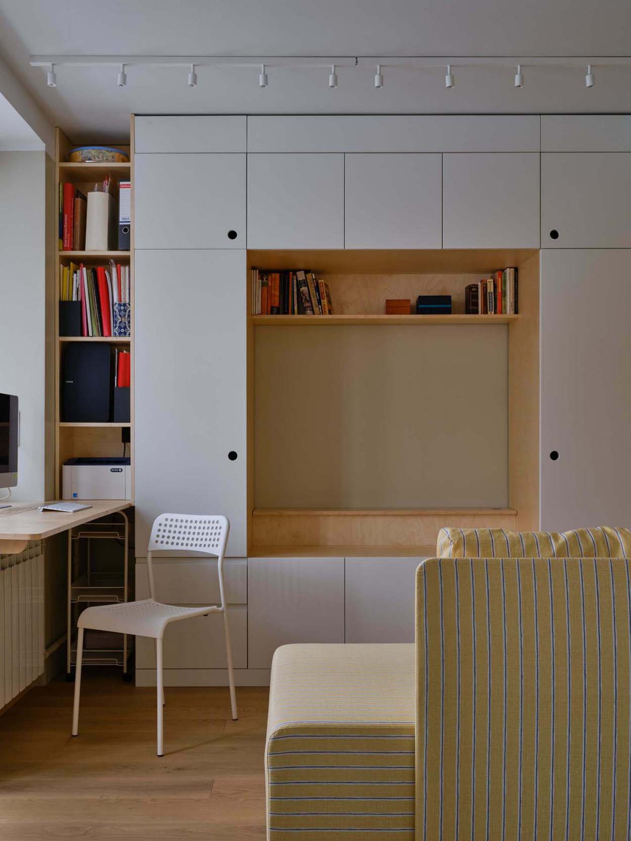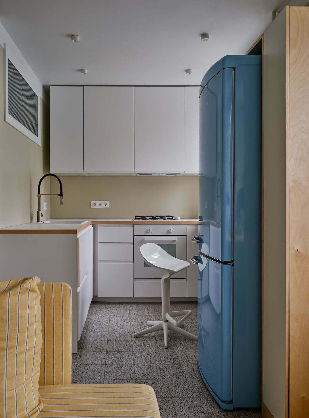 In this ingeniously designed 29m2 one-bedroom flat, every decision made by the designer was based on specific requirements. Nadezhda Polyakova, who grew up in the GDR, designed this interior as a practical experiment, combining constraints, layout tips and colour choices suitable for small spaces. She came up with a compact layout that could comfortably accommodate two people. The kitchen and living area share the same open space. A discreet office corner has been created near the main window. Built-in custom storage frees up floor space and simplifies everyday life. Every square metre has been methodically exploited to create a pleasant visual impression. The layout promotes a peaceful everyday life in a small urban space.