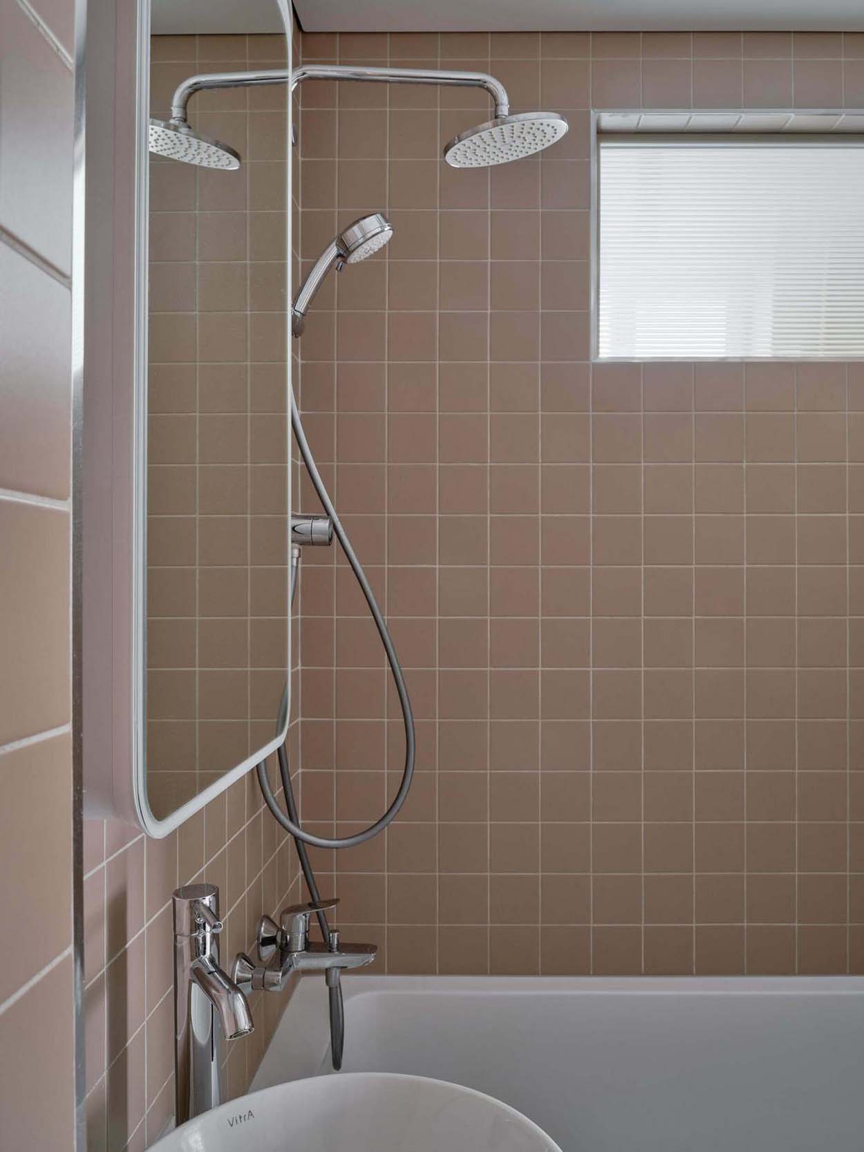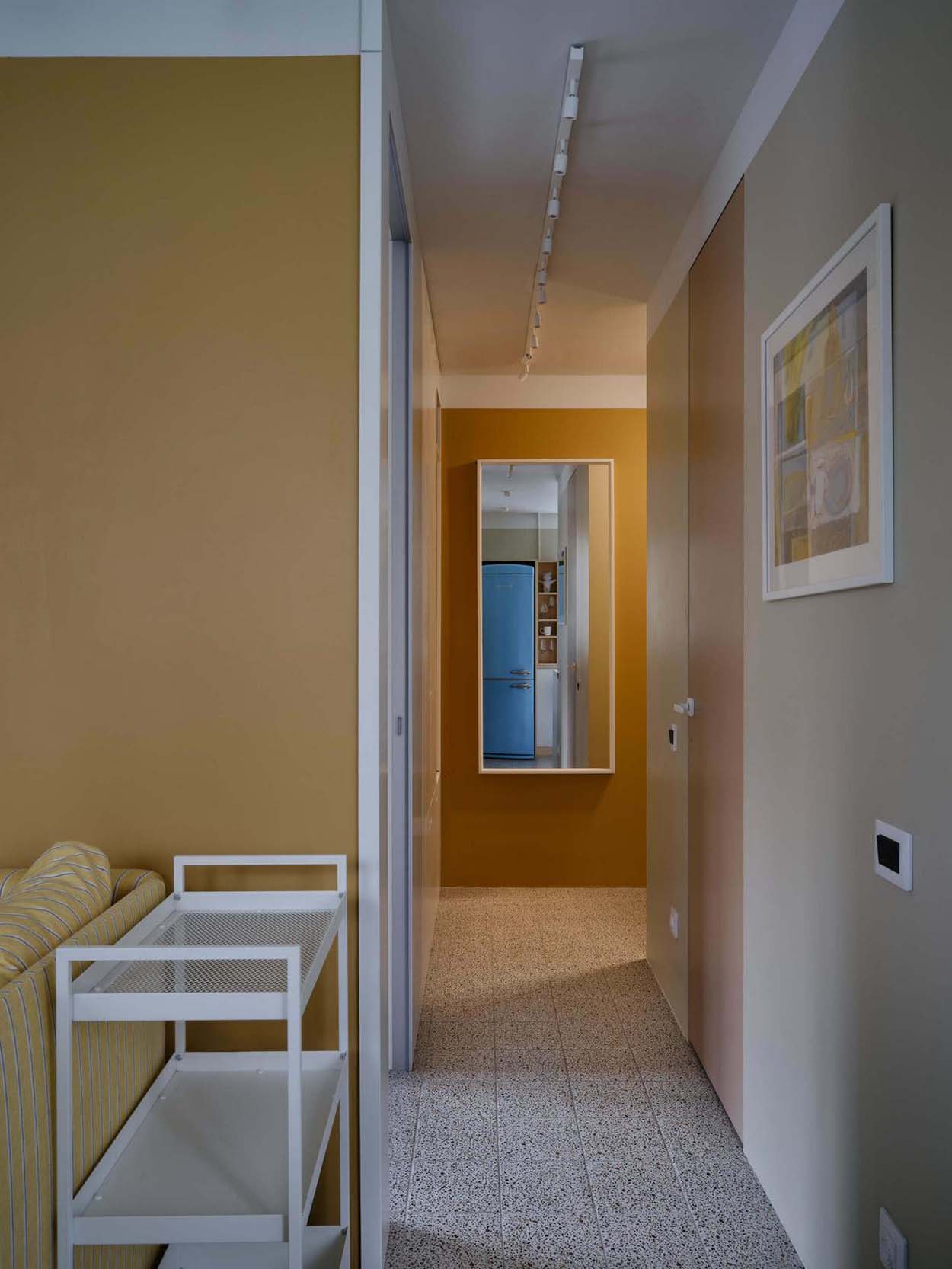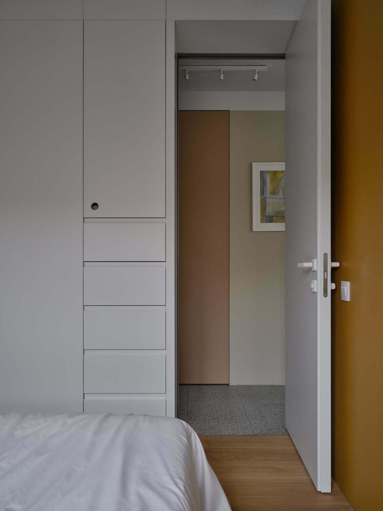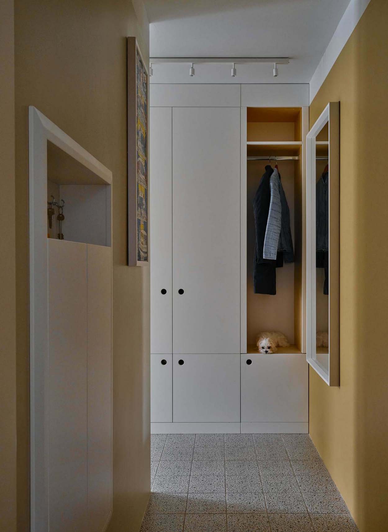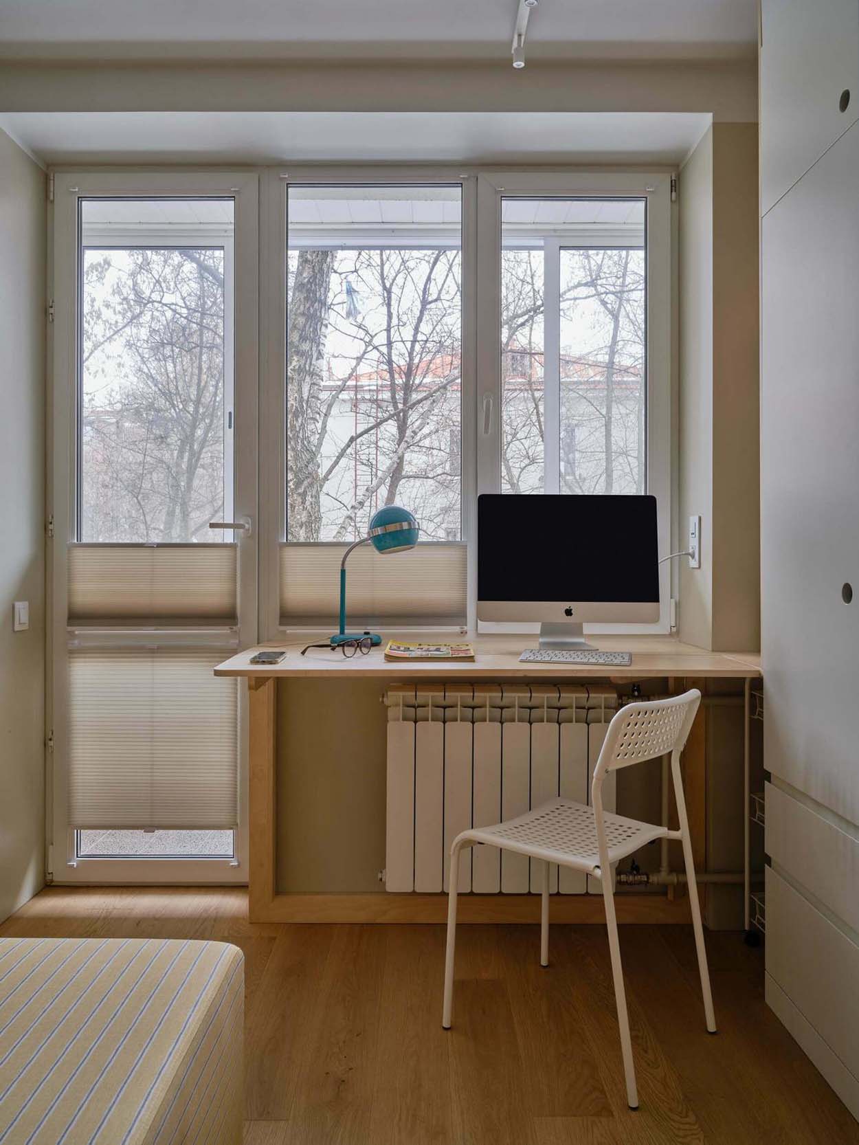 In this ingeniously designed 29m2 one-bedroom flat, every decision made by the designer was based on specific requirements. Nadezhda Polyakova, who grew up in the GDR, designed this interior as a practical experiment, combining constraints, layout tips and colour choices suitable for small spaces. She came up with a compact layout that could comfortably accommodate two people. The kitchen and living area share the same open space. A discreet office corner has been created near the main window. Built-in custom storage frees up floor space and simplifies everyday life. Every square metre has been methodically exploited to create a pleasant visual impression. The layout promotes a peaceful everyday life in a small urban space.
