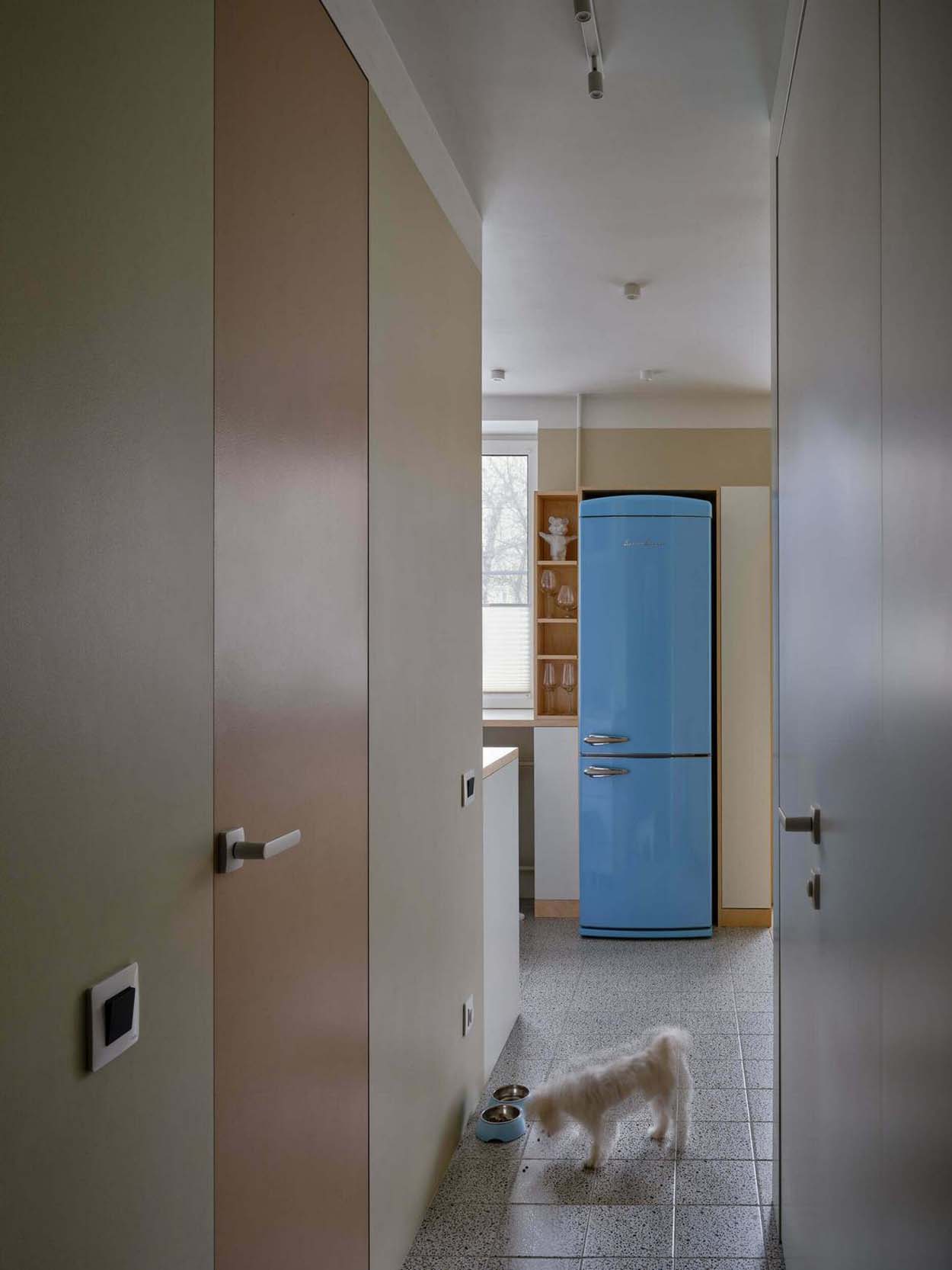 Plywood became the central element of the project due to its strength and versatility. The designer worked on the structure and then collaborated with a local specialist workshop to implement it. This method ensured precise manufacturing and quick installation. A bright colour palette was designed based on that of the retro refrigerator. This blue appliance guided the decorative choices for the entire interior. A few works of art add a personal touch, and the contrast between light wood and warm colours energises the whole space. The bedroom, equipped with a bridge cabinet, is intimate and pleasant. Even the dog has found its ideal place in this ingeniously designed 29m2 one-bedroom flat. Photo: Nick Rudenko