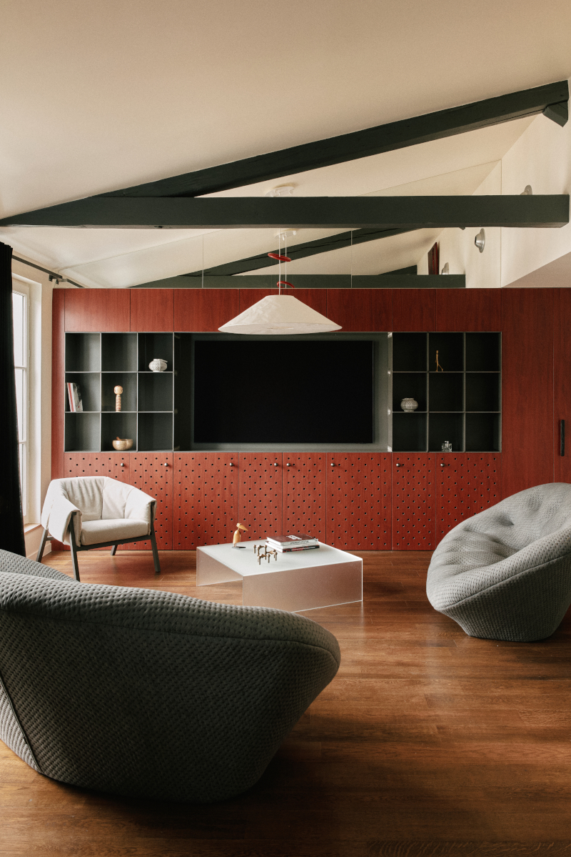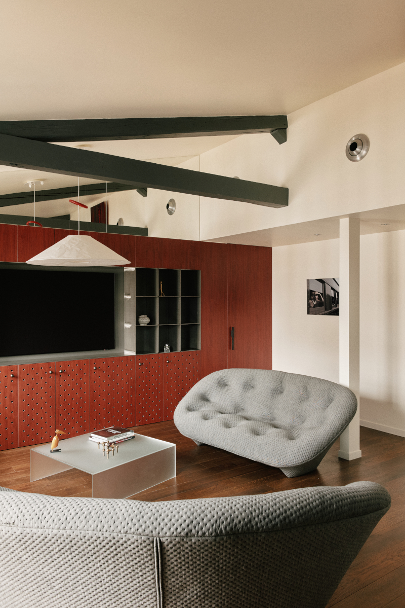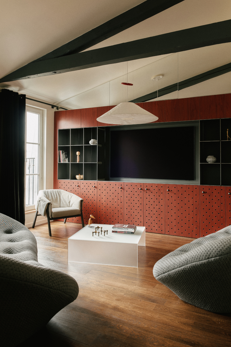 In Paris's 17th arrondissement, the CHHO studio completely redesigned the layout of two adjoining flats. It created a true family home by combining a 70m2 two-bedroom flat with a 30m2 studio. The agency redistributed the space, installed the new sleeping area in the extension. It has also enlarged the living room by removing a bedroom from the former two-bedroom flat. The most striking change was made to the ceiling. In the living room, the team opened up the underside and integrated the attic space to create a double-height ceiling. The roof trusses remain visible and structure the space.