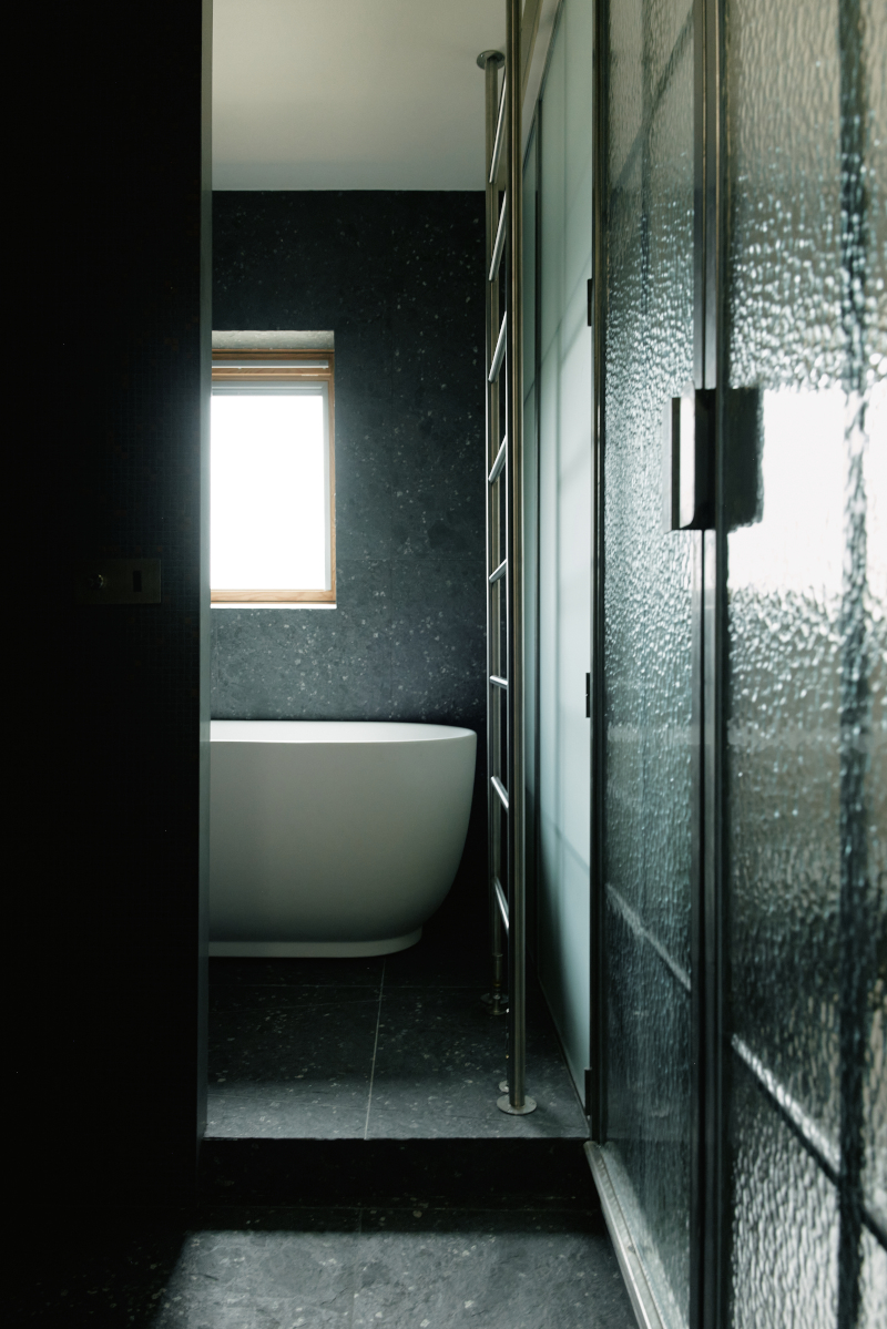 Dans l'extension situé dans le studio nouvellement acquis, la suite s’organise autour du lit, posé comme un point central. Les professionnels ont installé une verrière en acier qui sépare la salle de bain, filtre les vues et laisse passer la lumière. Le projet a conservé le parquet existant afin d’assurer une continuité de sol entre les deux appartements. Les matières donnent de la profondeur aux espaces, tandis que l’éclairage indirect accompagne les volumes avec précision. Photo : © Oracle Paris
